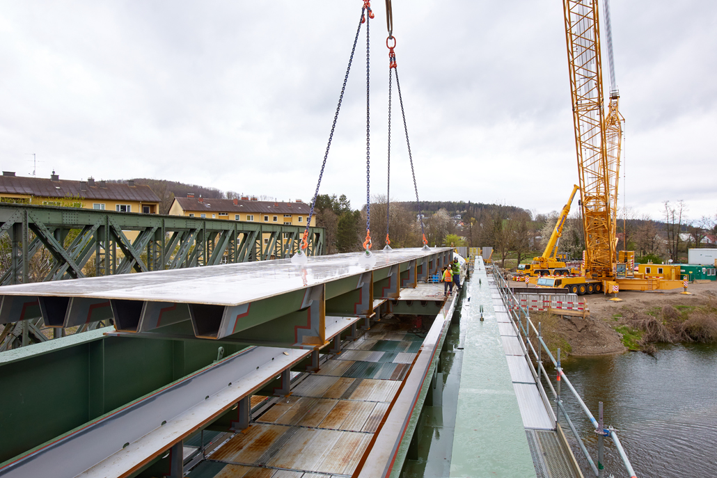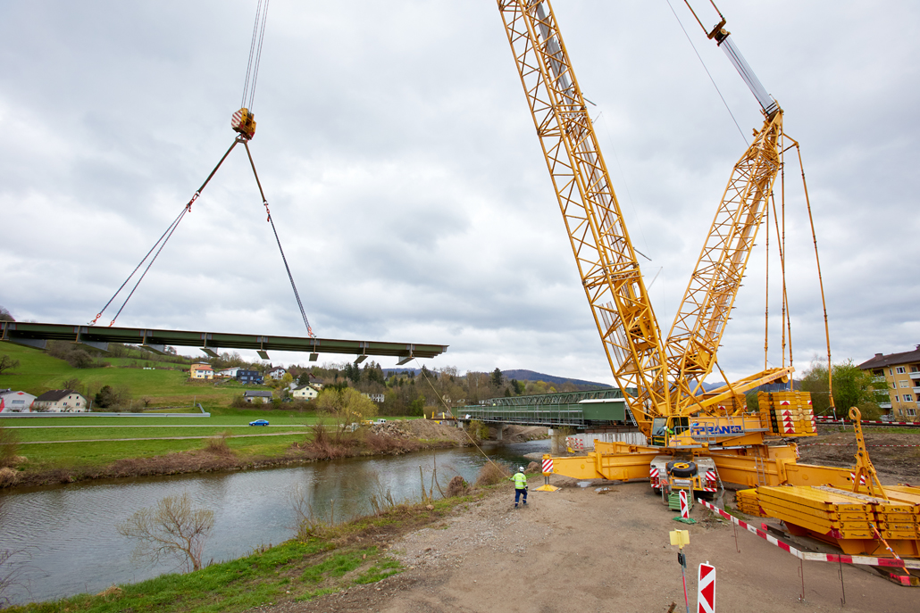 The Prangl team responsible for the project initially faced extensive preparatory works - not just in terms of logistics, crane selection and manpower planning; access to the area around the bridge in particular proved very difficult because the route crossed a goods road and bridge along it, which had an undefined load-bearing capacity. Following preliminary testing, it was therefore necessary to assume that this overpass was capable of bearing a total weight of 96 tonnes, which meant the access bridge had to be approved by a structural engineer.
