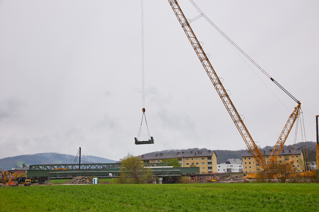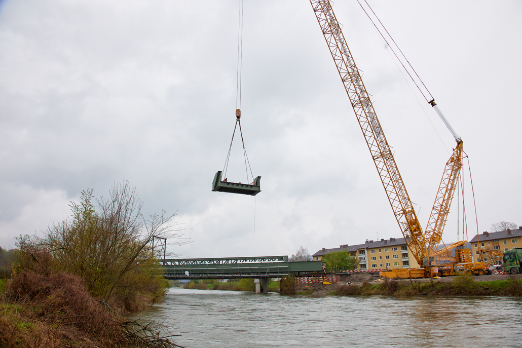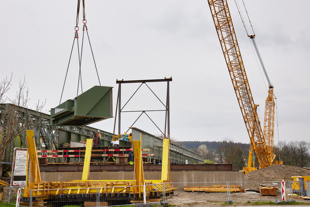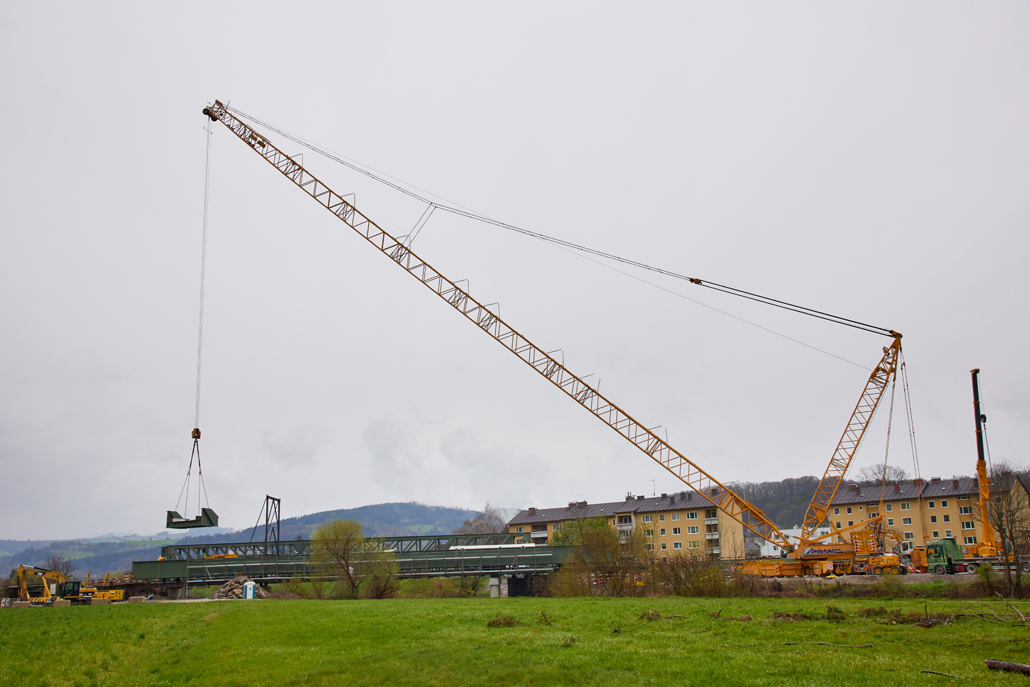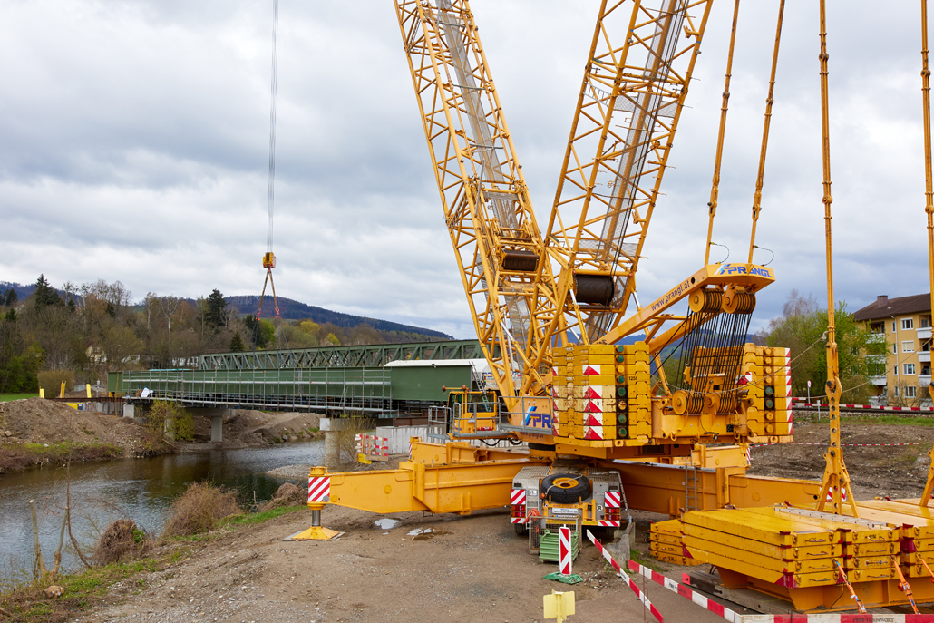 The main crane required a great deal of space: A 600 tonne lattice boom crane was the optimum choice due to the vast boom projection of 114 metres and the lifting weight (the heaviest bridge components weighed in at 36 tonnes). Meanwhile, a 100-tonne telescopic crane acted as an erection or auxiliary crane. Its task was to lift and "float" the ballast from the ballast table. Several other pieces of equipment were also used for preparation and follow-up work: a 45-tonne truck-mounted crane, an 85-tonne loader crane, a telehandler and an articulating boom lift. Once well prepared, the project could get going.