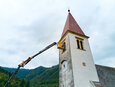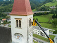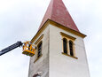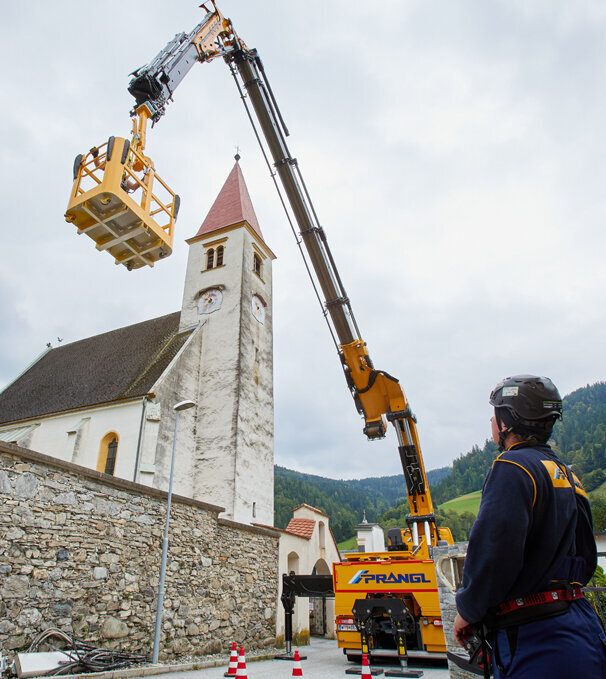 Mobile phone masts are essential for nationwide communication. Sometimes they are not visible from a distance, as is usually the case, because they are ‘hidden’ in church towers, for example. Prangl was called to such an unusual installation because it needed to be renovated. The difficulty was that there was hardly any space around the church for large equipment.