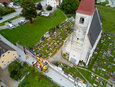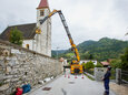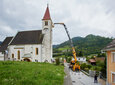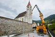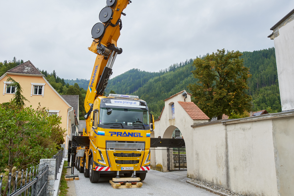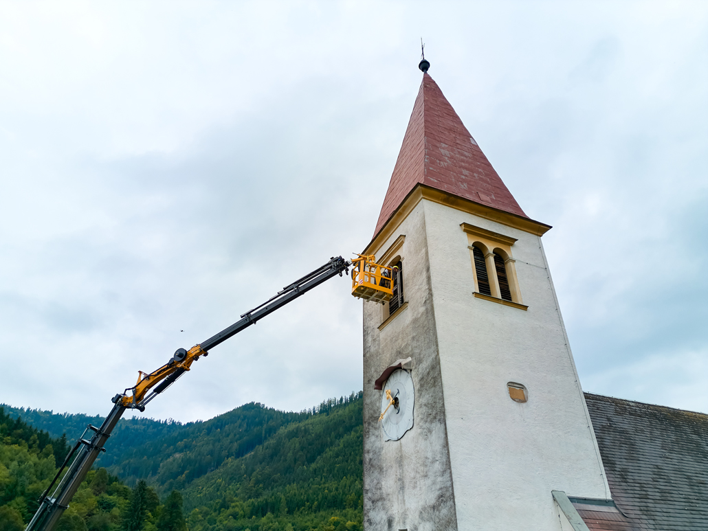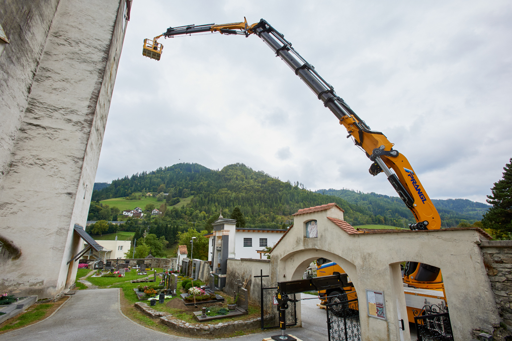 The parish church in Übelbach is a late Gothic wall-pier church. The two long sides of the church are lined by the cemetery, and access is only possible via the narrow church lane. This situation presented the Prangl team with a particular challenge. On the one hand, the equipment to be used had to be safely positioned in the lane and, on the other hand, it had to achieve the necessary reach while also bearing the required load. A new machine in the Prangl fleet made it possible to fulfil all aspects of this task simply and efficiently.