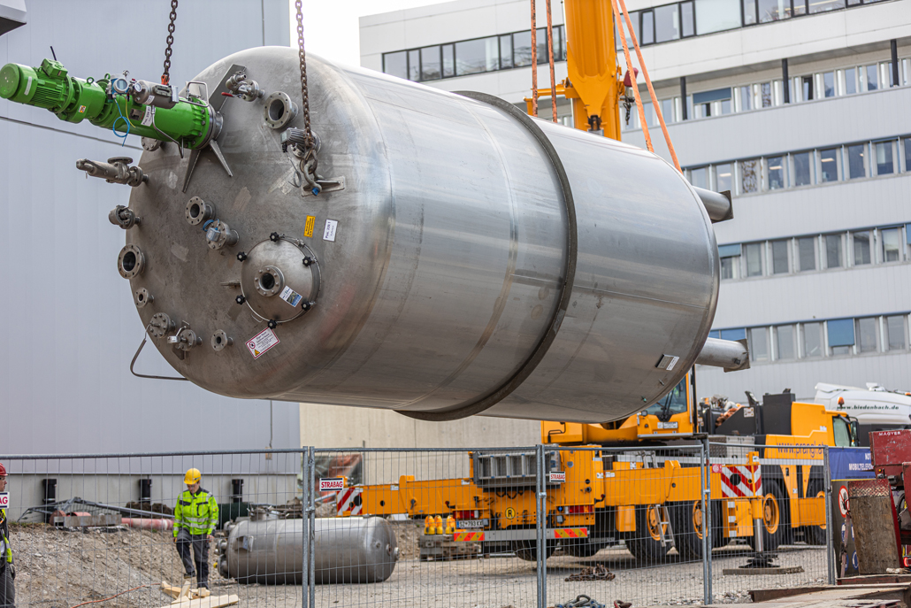 First, the roof was opened with the help of a construction crane. This cleared the way for the cranes positioned on the outside of the hall, along the fence to the road. A 250 tonne telescopic crane was selected as the main crane. Thanks to its 78 metre telescopic boom, the entire operation could be carried out from just one location. Due to the limited space in the tank farm, the silos had to be excavated with millimetre precision. And in the outdoor area, pipe bridges with pipes that transport sensitive liquids posed a particular challenge.