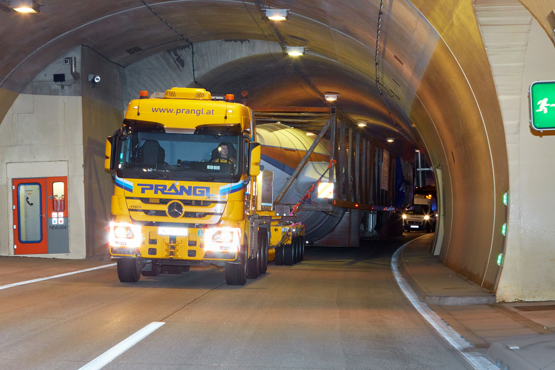 Precision work was already called for in Lower Austria, but things got really tight in Graz. In addition to crossing a number of traffic islands, it was also necessary to temporarily disassemble traffic lights, street lighting masts, flagpoles, traffic signs and a ventilation shaft. Furthermore, a railway crossing was also provisionally adapted. The parking spaces on both sides of some road sections had to be cordoned off, to allow the transporter to pass through. The wings, tail, engines and other accessories had been delivered a few days beforehand.