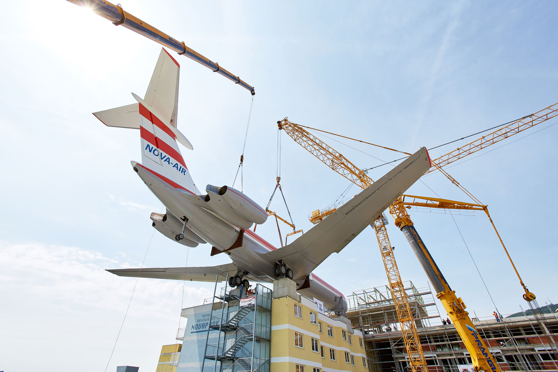 There was then a break of several weeks for Prangl while the aircraft was assembled. However, as soon as it was in its fully assembled state, a 500 ton and a 200 ton telescopic crane lifted the 62 ton heavy object with wings onto the hotel roof at a height of roughly 25 metres. Graz therefore has a new attraction: The aircraft “landed” on the hotel roof on time. The outstanding efforts of the entire Prangl team transformed this exceptional project into a complete success. Countless onlookers can personally attest to this.