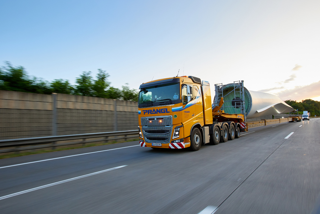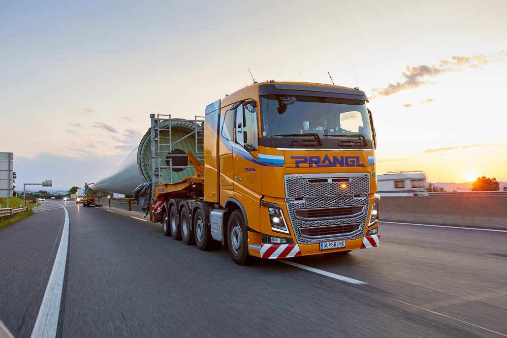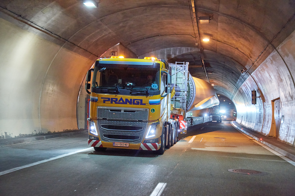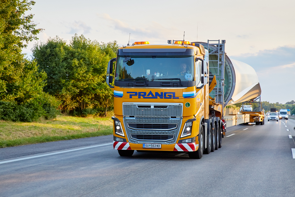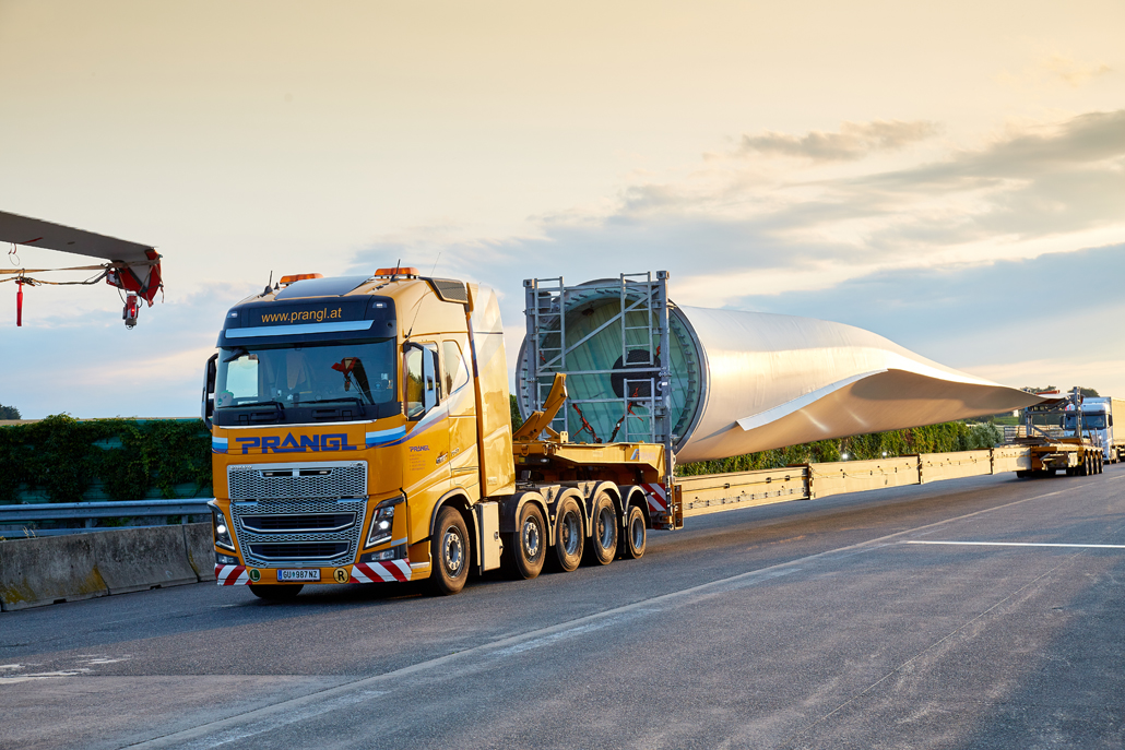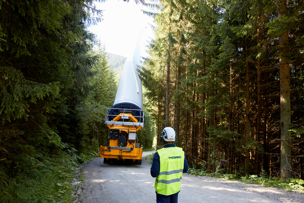 Road transport from the factory in Germany, load transfer in Mürzzuschlag (Austria), mountain transport and assembly: Prangl put together a total package for the new wind turbines. This naturally included support for advance planning of routes and crane parking areas. Special equipment designed specifically for transporting and lifting wind turbine components was deployed.