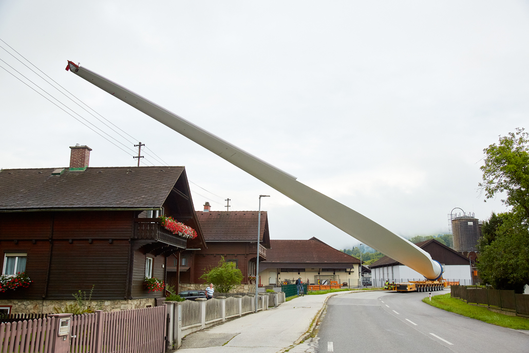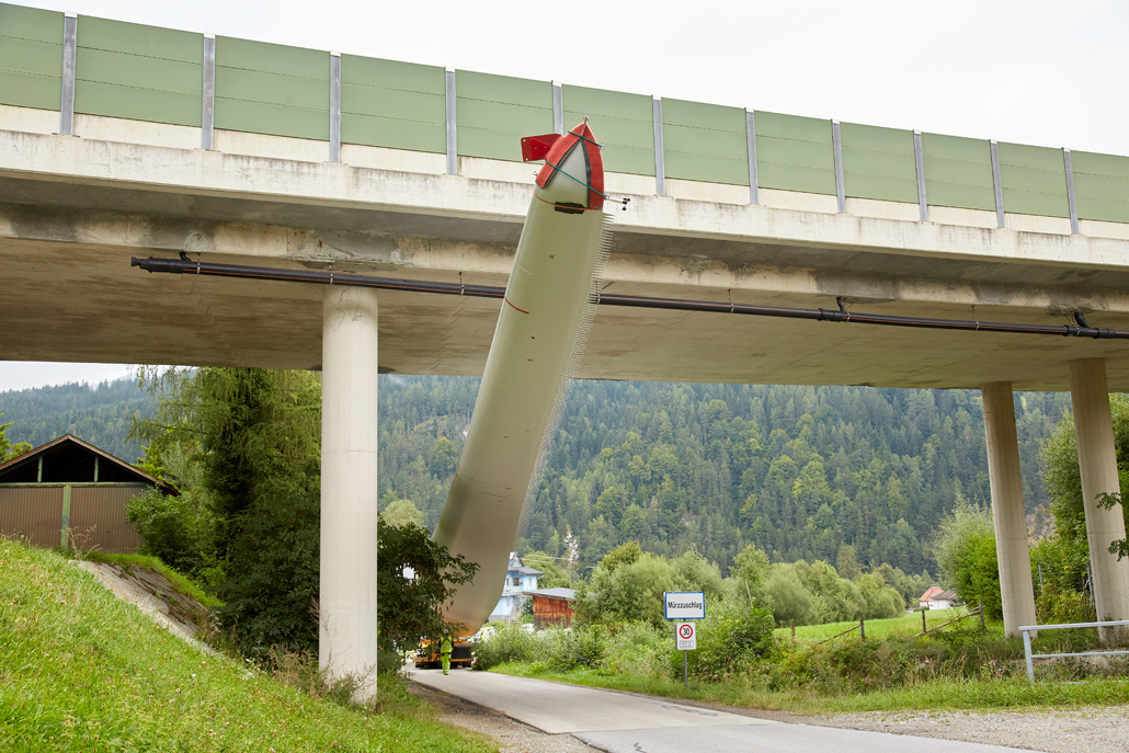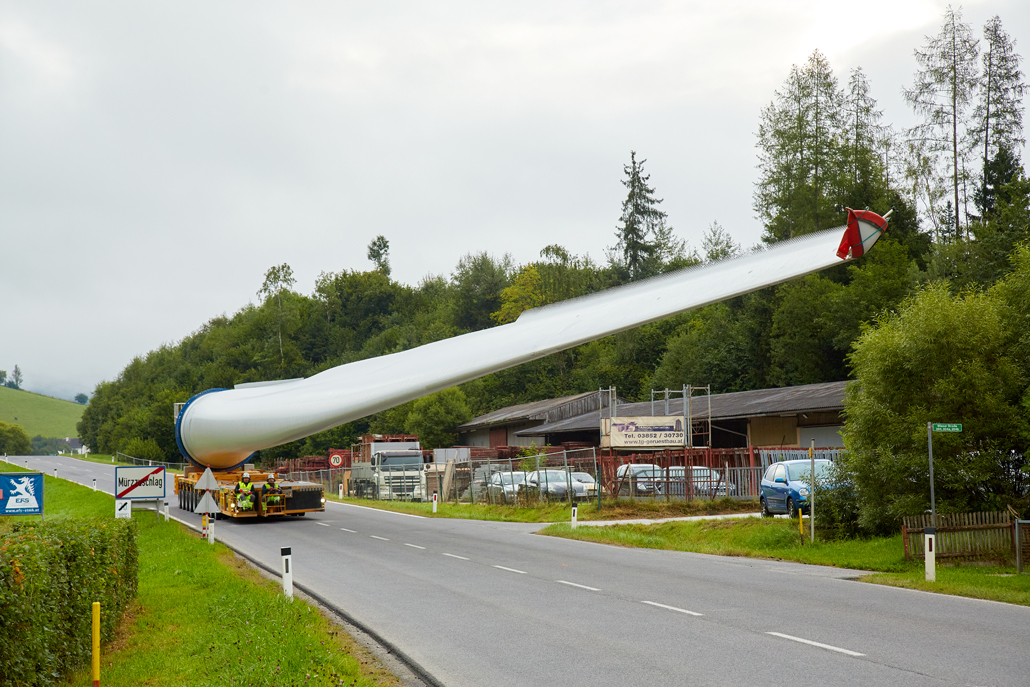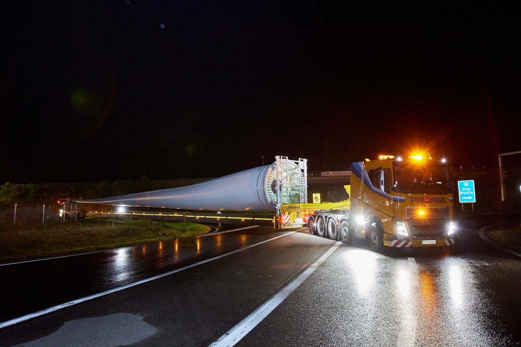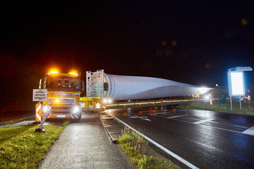 The road transport was undertaken by various machines, depending on the load: a four-axle tractor unit with a tower adapter for the steel towers, a five-axle tractor unit with a four-axle blade trailer for the rotor blades, a three-axle traction unit with a nine-axle semi-trailer for the nacelles, a three-axle traction unit with a one-axle dolly and a four-axle low-bed semi-trailer for the hubs, and a three-axle traction unit with a two-axle dolly and a four-axle or six-axle low-bed semi-trailer for the generators. These vehicles completed the meticulously prepared 1,750-kilometre transport to Mürzzuschlag in 46 individual journeys.