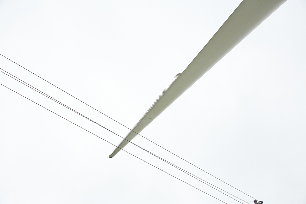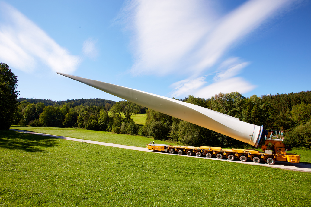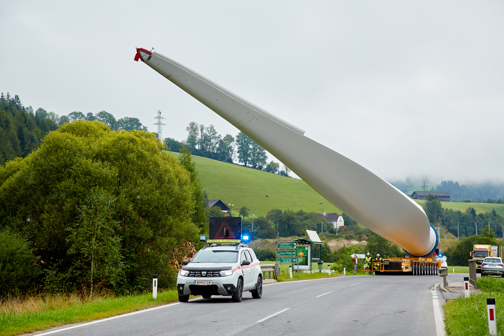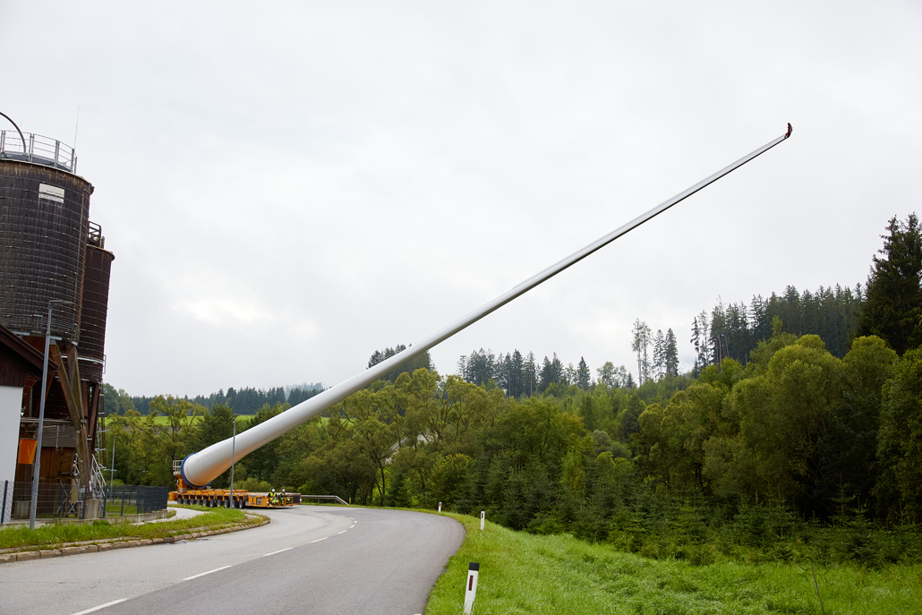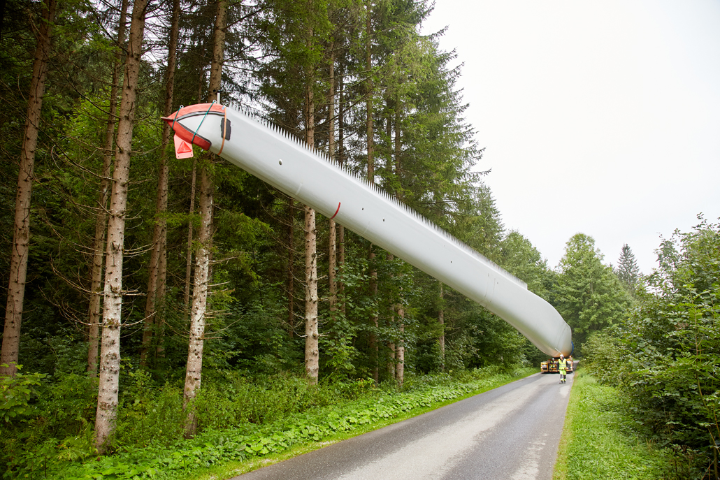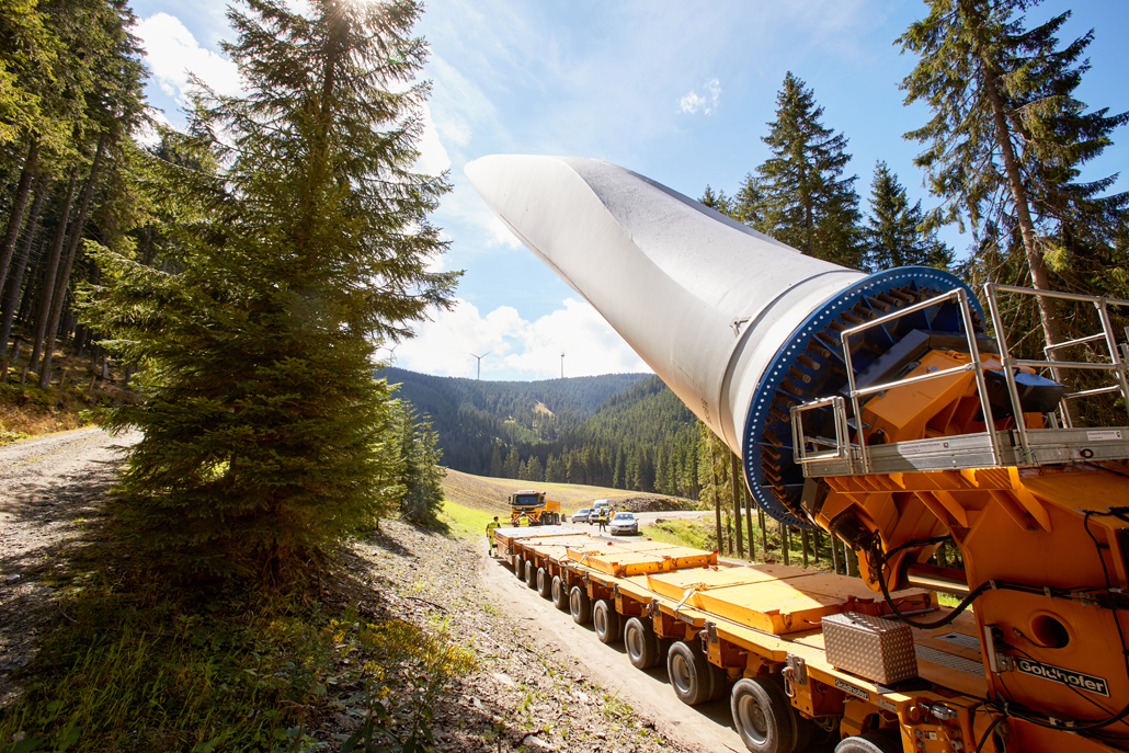 The road transport was undertaken by various machines, depending on the load: a four-axle tractor unit with a tower adapter for the steel towers, a five-axle tractor unit with a four-axle blade trailer for the rotor blades, a three-axle traction unit with a nine-axle semi-trailer for the nacelles, a three-axle traction unit with a one-axle dolly and a four-axle low-bed semi-trailer for the hubs, and a three-axle traction unit with a two-axle dolly and a four-axle or six-axle low-bed semi-trailer for the generators. These vehicles completed the meticulously prepared 1,750-kilometre transport to Mürzzuschlag in 46 individual journeys.