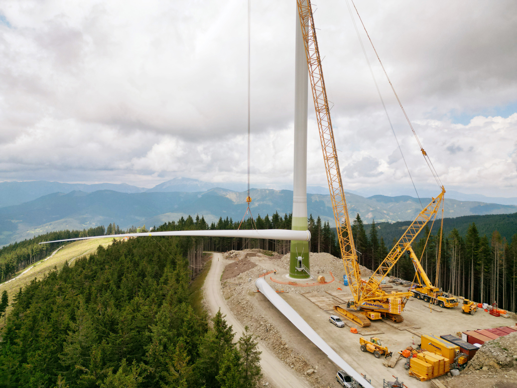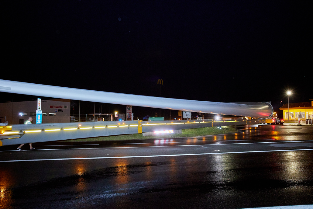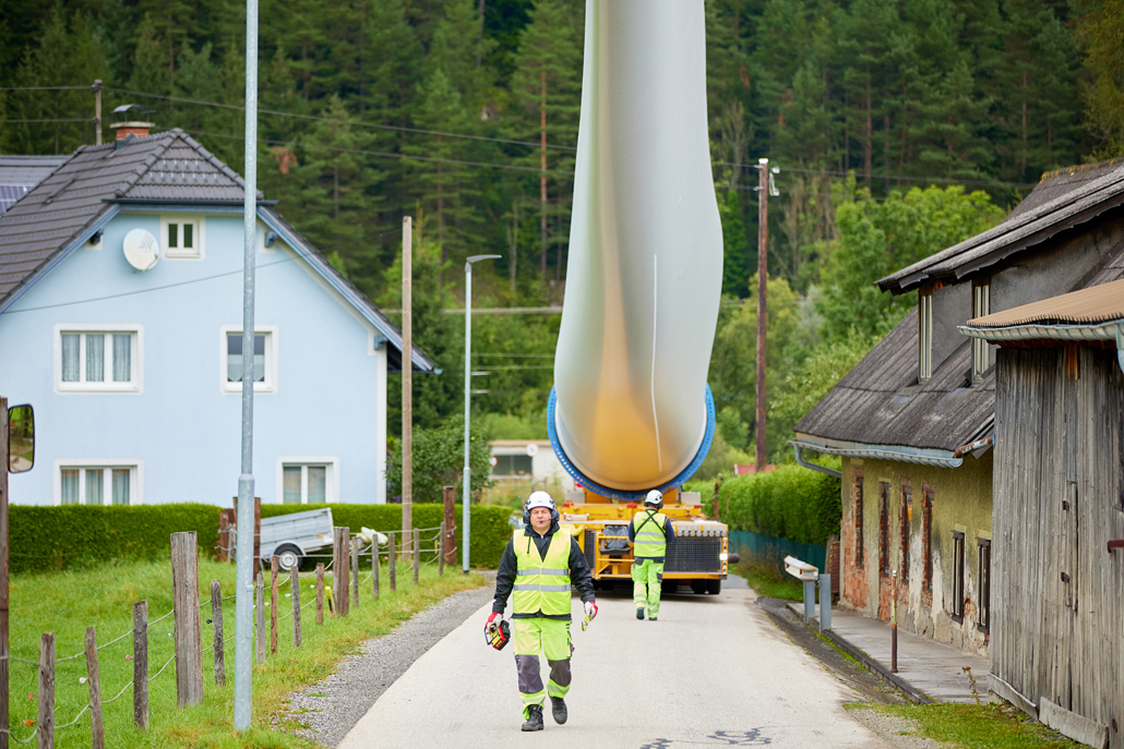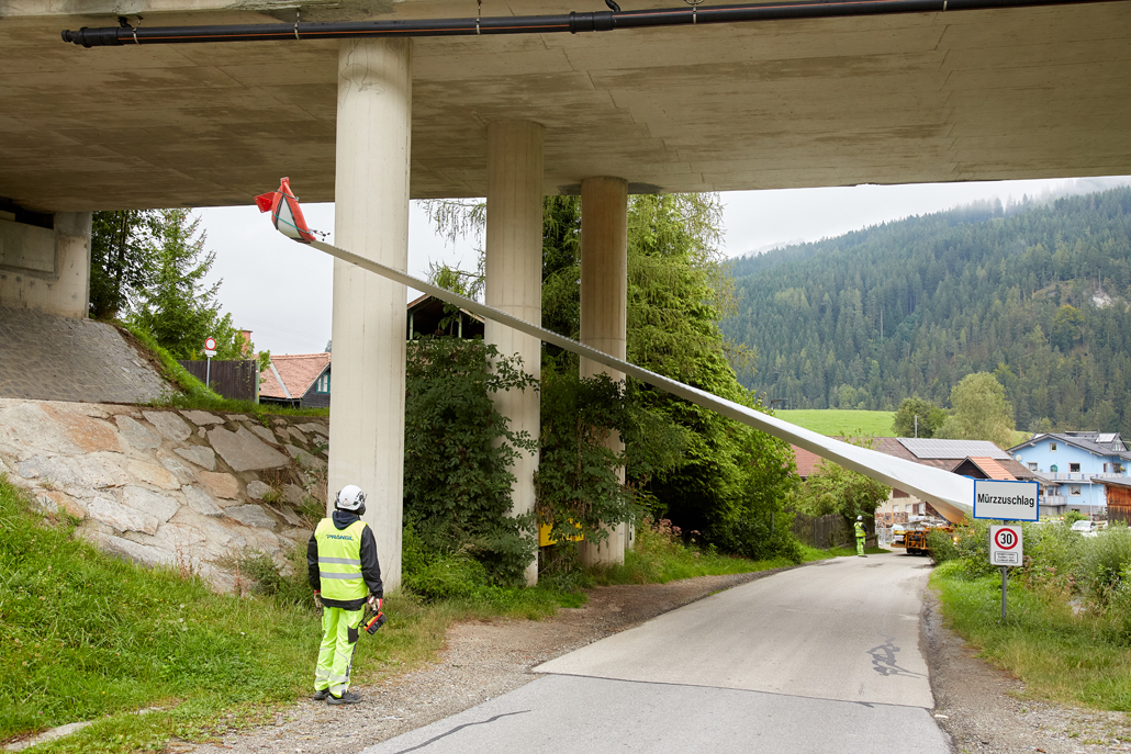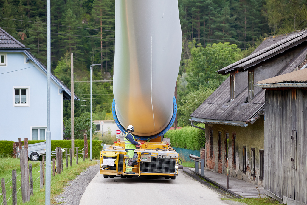 The total weight of the heaviest convoy was over 130 tonnes (tower components), and the longest transporter was 78.5 metres long (rotor blades). All convoys were just under five metres wide and about four to five metres high. Together with support vehicles for safety, the heavy transporters reached the transfer point in Mürzzuschlag after three to four nights of driving. A 400-tonne crawler crane awaited the wind turbine components there. The fact that this crane is drivable allowed best possible use of storage space to be made. A 220-tonne telescopic crane and a 7.2-tonne telehandler provided assistance.