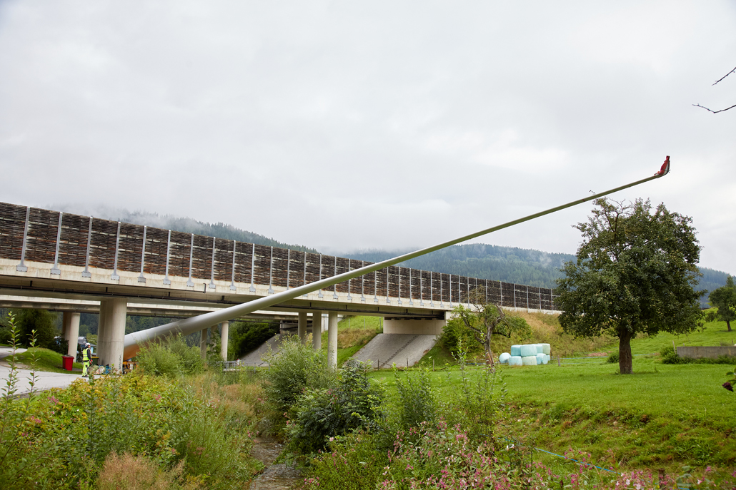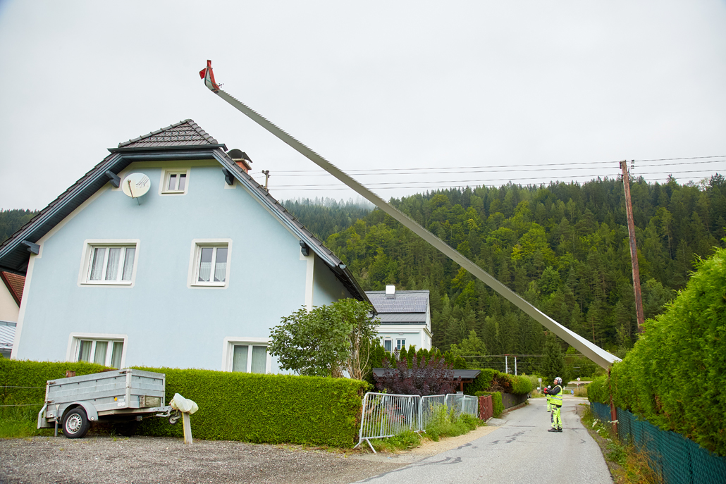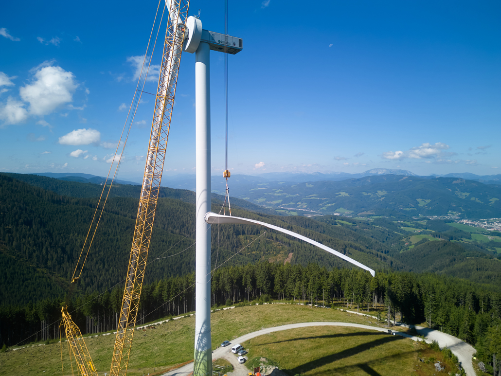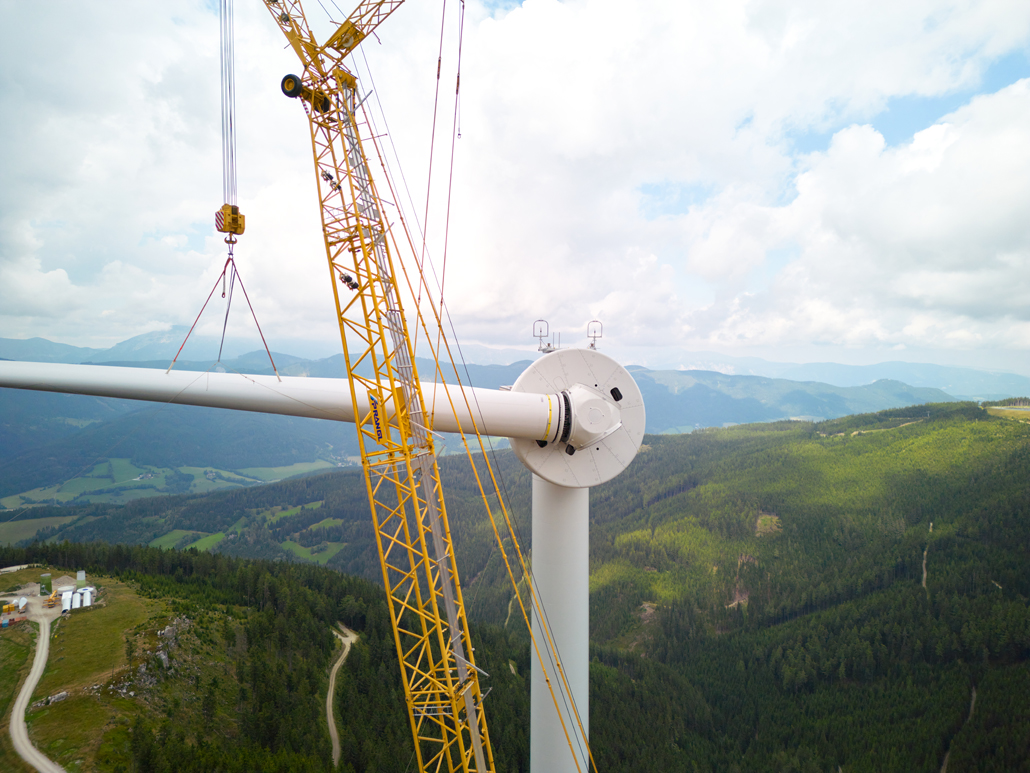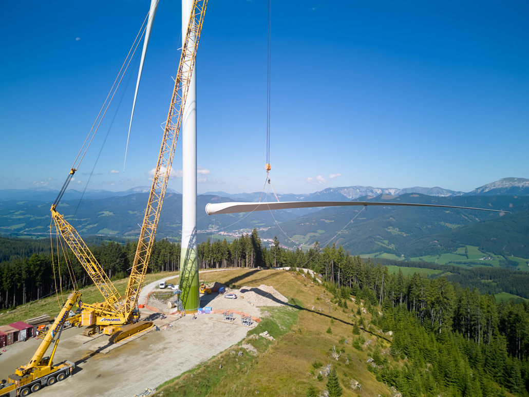 The total weight of the heaviest convoy was over 130 tonnes (tower components), and the longest transporter was 78.5 metres long (rotor blades). All convoys were just under five metres wide and about four to five metres high. Together with support vehicles for safety, the heavy transporters reached the transfer point in Mürzzuschlag after three to four nights of driving. A 400-tonne crawler crane awaited the wind turbine components there. The fact that this crane is drivable allowed best possible use of storage space to be made. A 220-tonne telescopic crane and a 7.2-tonne telehandler provided assistance.