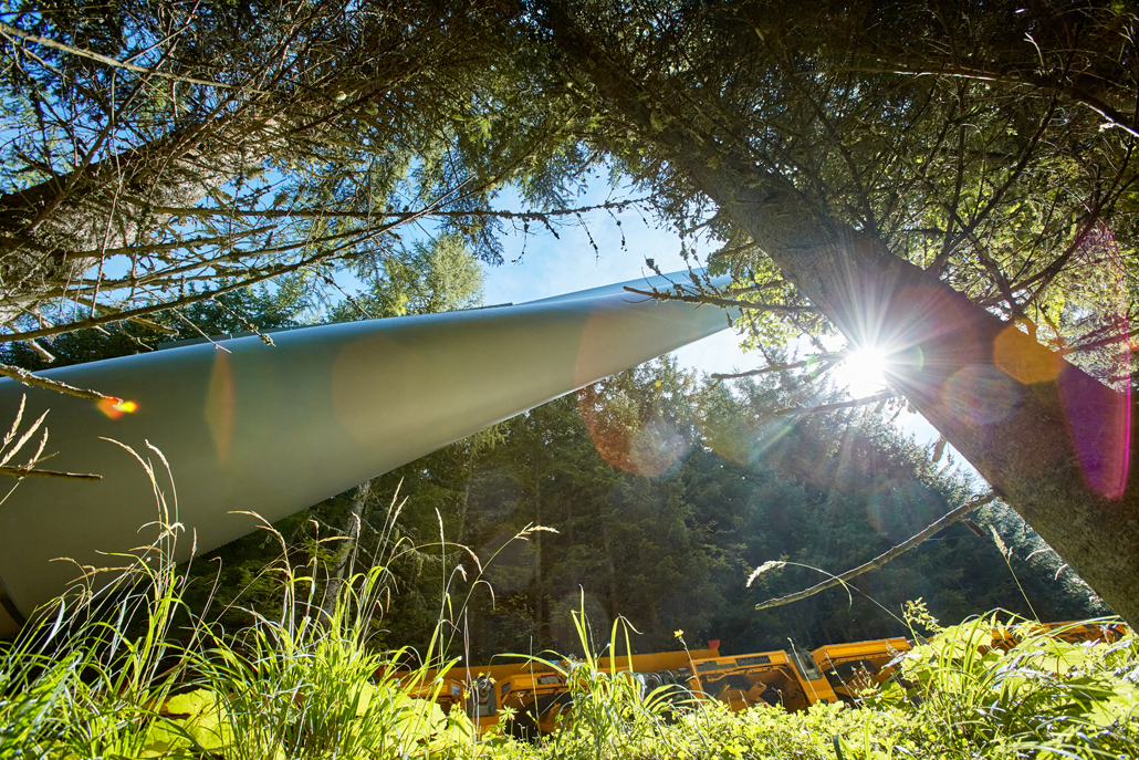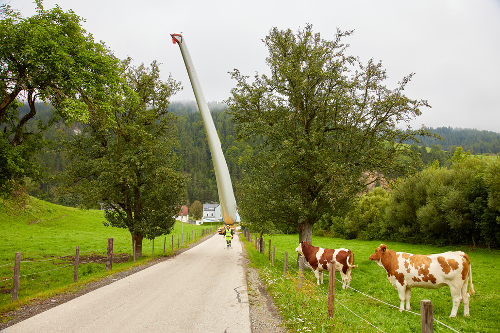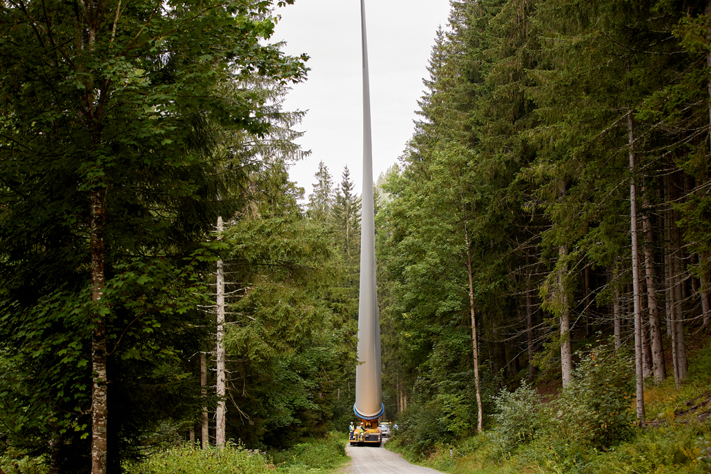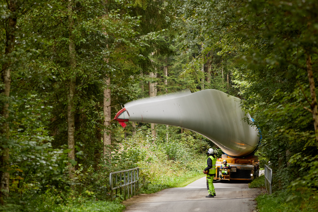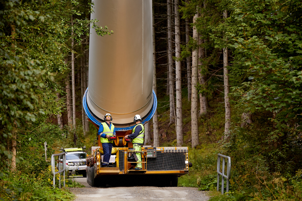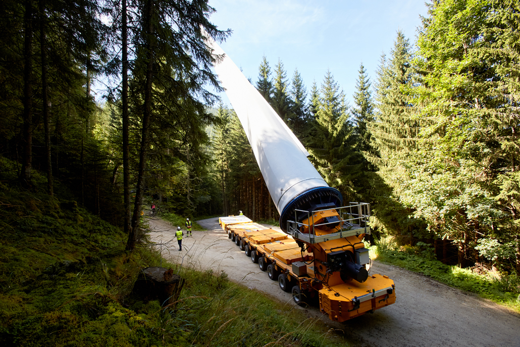 The components were transferred to a variety of machines suitable for mountain transport: ten-axle self-propelled trailers with and without blade devices, four-axle all-wheel drive traction units plus five-axle heavy duty modules, three-axle all-wheel drive traction units with ballast trailers (for towing) and all-wheel drive traction units with loader cranes and flatdecks. One wind turbine component after another, in order of assembly, was carefully brought up the mountain on gradients of up to 16 percent. Transporting the over 60 metre-long rotor blades, in particular, demanded the utmost concentration from the Prangl team.