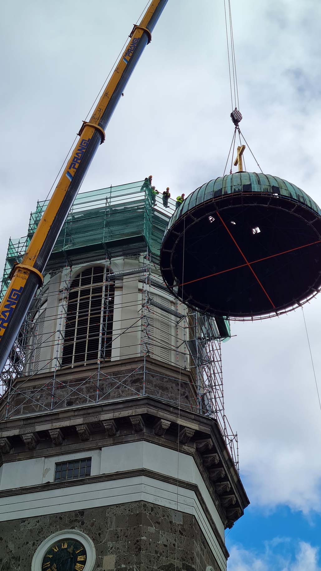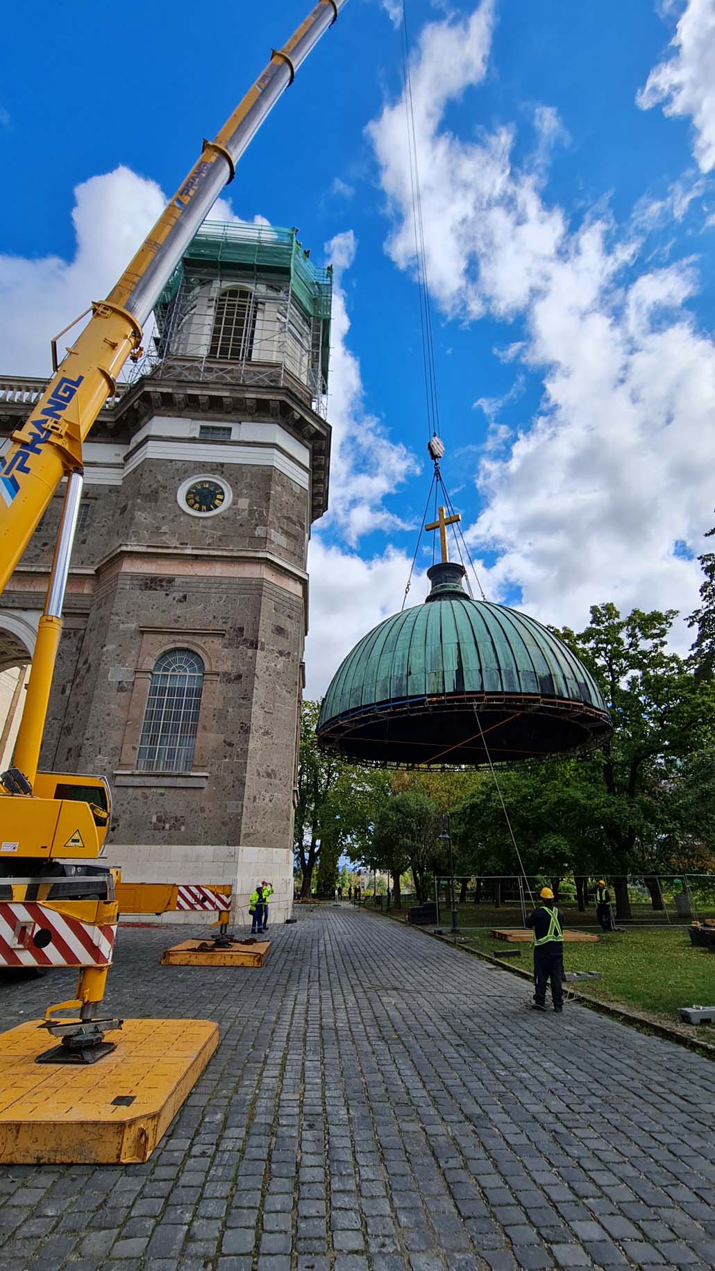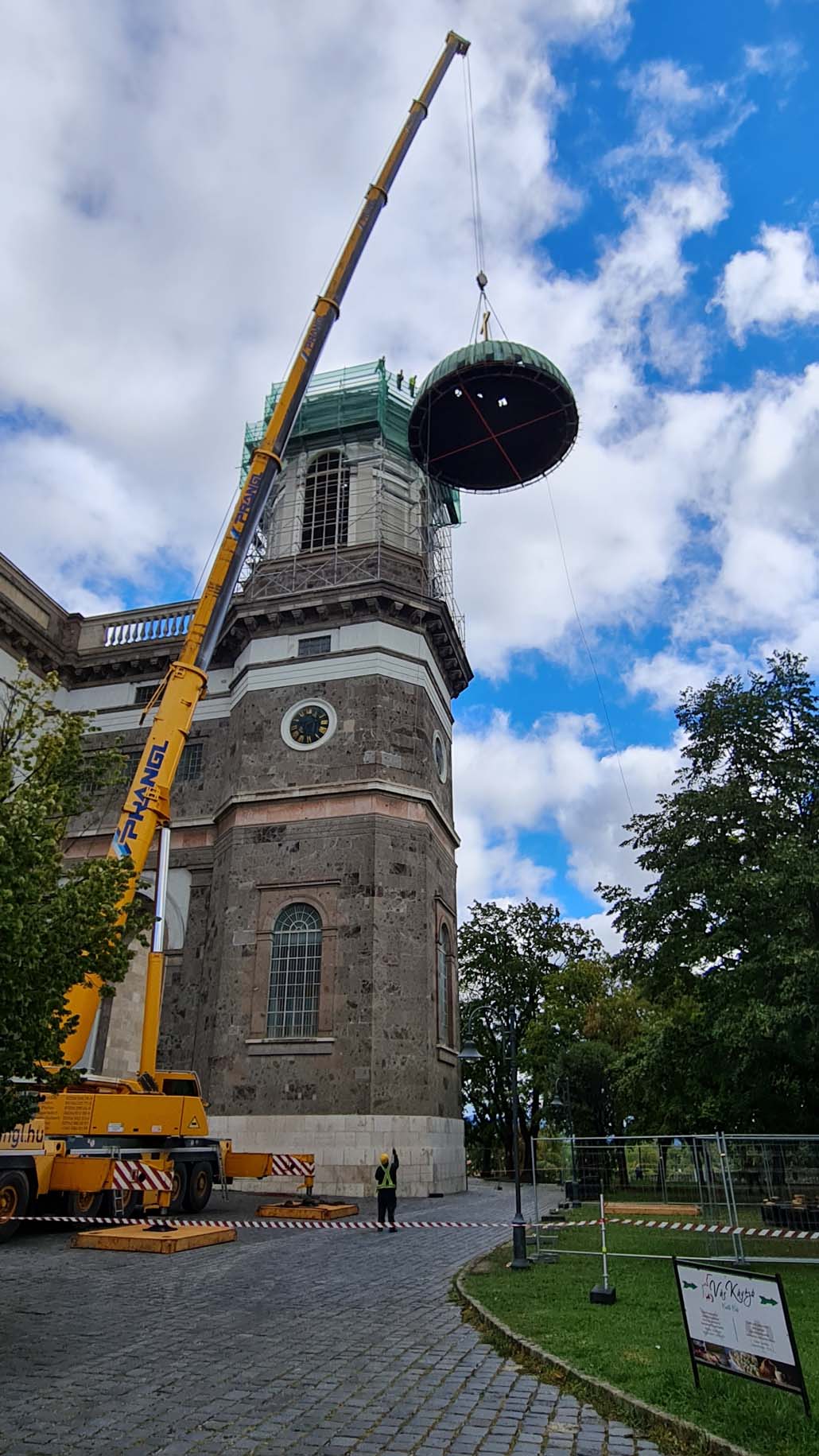 A 250 tonne telescopic crane proved to be the most efficient solution in this case. Although a smaller crane with an auxiliary jib would have sufficed for the loads to be lifted, the tight schedule did not allow time for the installation of an auxiliary jib. The larger telescopic crane was able to perform all the lifts with its 72-metre main boom (counterweight 47.5 tonnes). As the first step of the extensive lifting work, the dome, whose highest point including the cross is at a height of 60 metres, was carefully lifted off. It was deposited at the site next to the basilica, where the restoration is also being carried out.