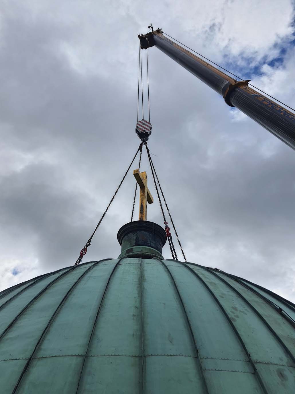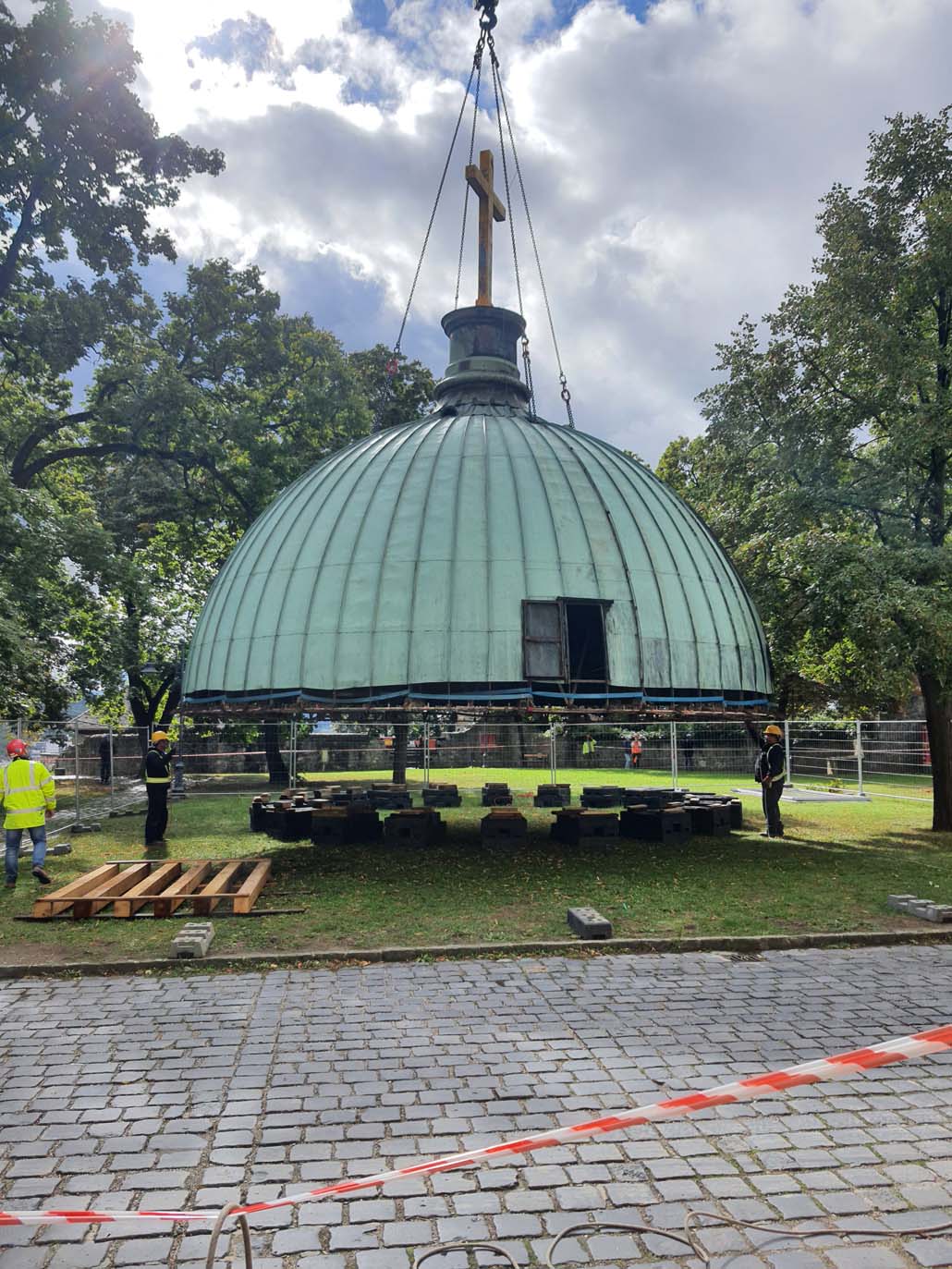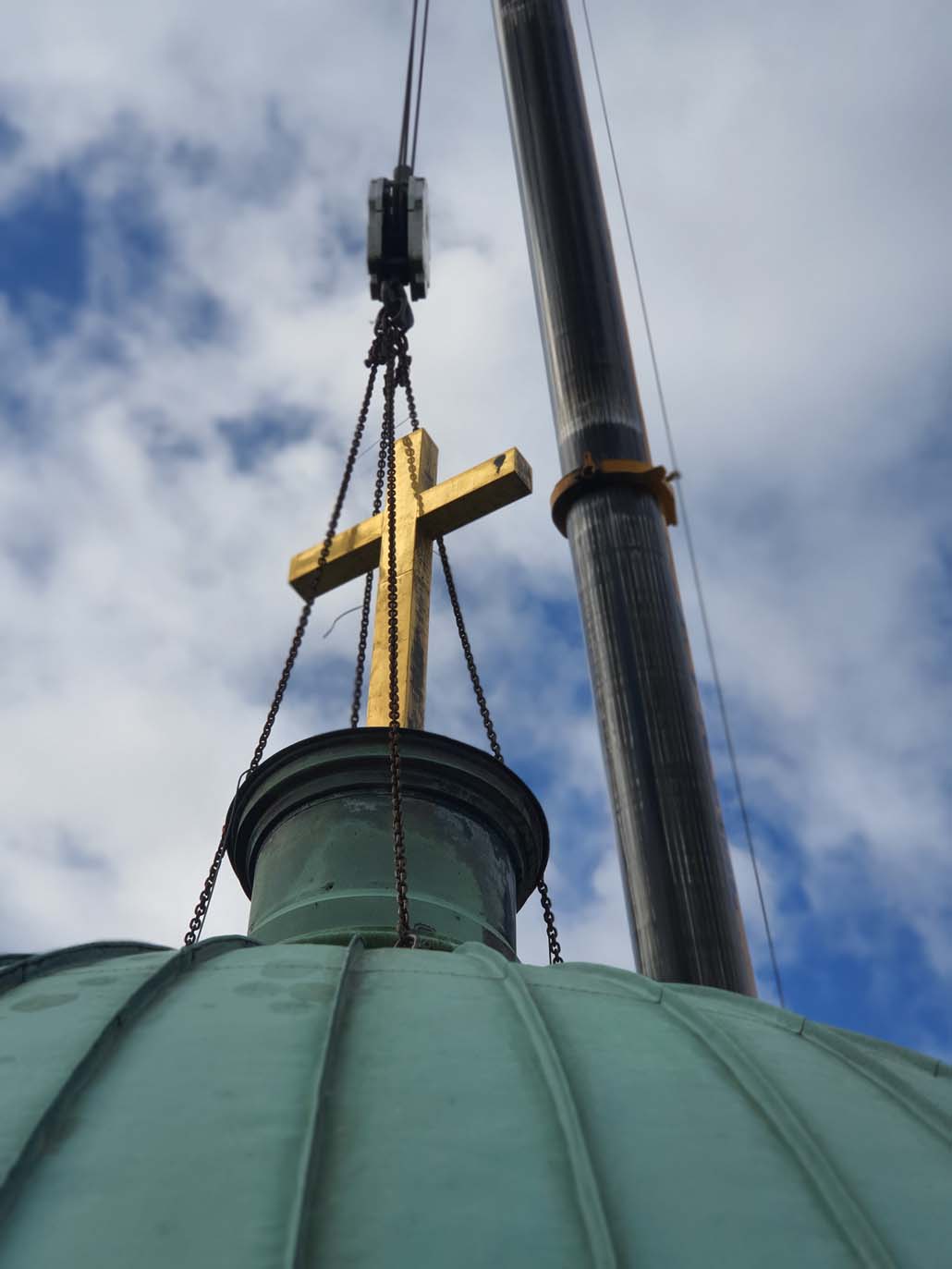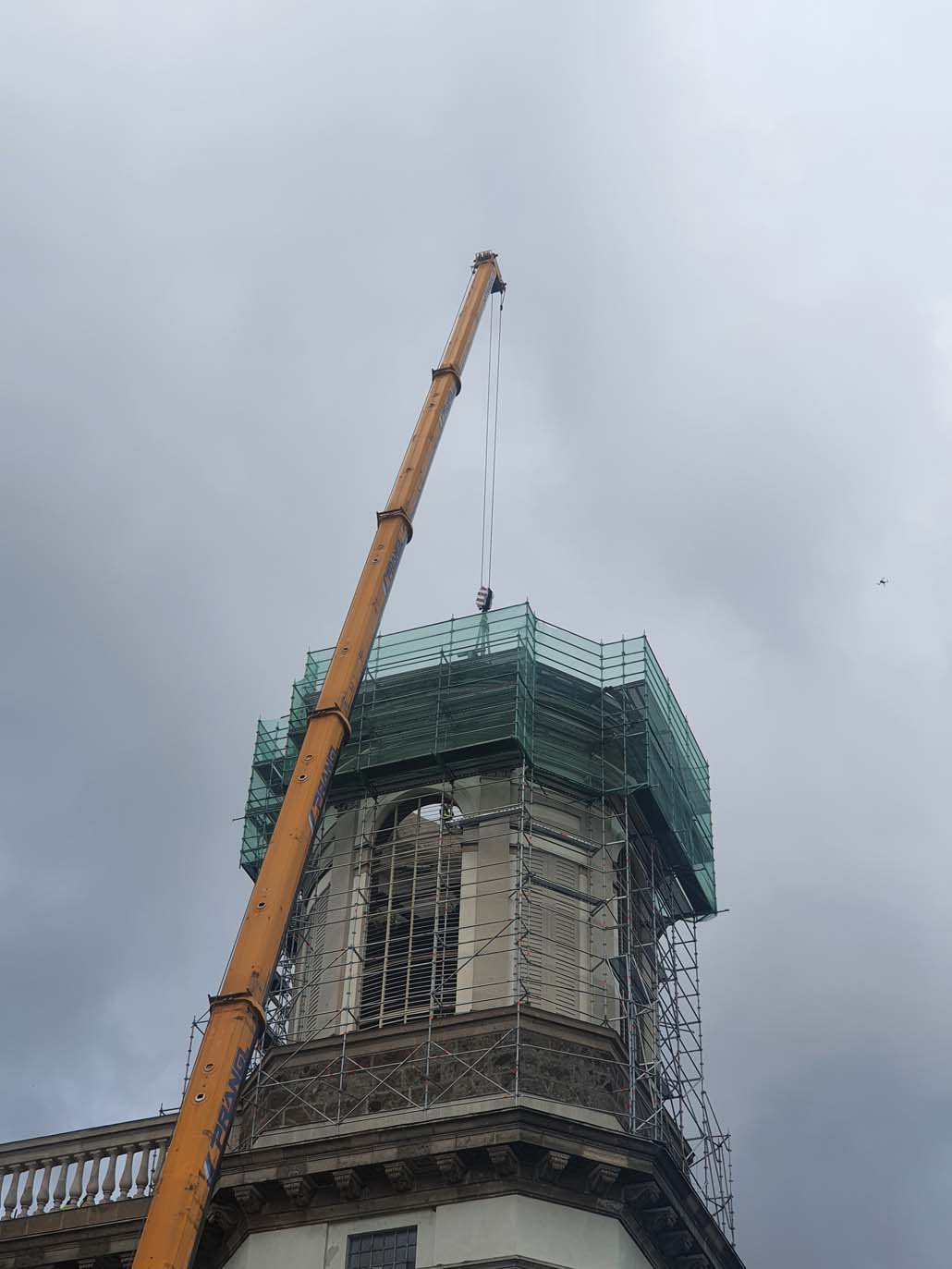 A 250 tonne telescopic crane proved to be the most efficient solution in this case. Although a smaller crane with an auxiliary jib would have sufficed for the loads to be lifted, the tight schedule did not allow time for the installation of an auxiliary jib. The larger telescopic crane was able to perform all the lifts with its 72-metre main boom (counterweight 47.5 tonnes). As the first step of the extensive lifting work, the dome, whose highest point including the cross is at a height of 60 metres, was carefully lifted off. It was deposited at the site next to the basilica, where the restoration is also being carried out.
