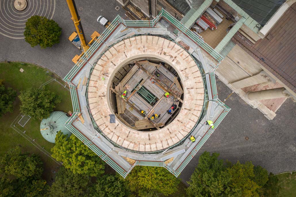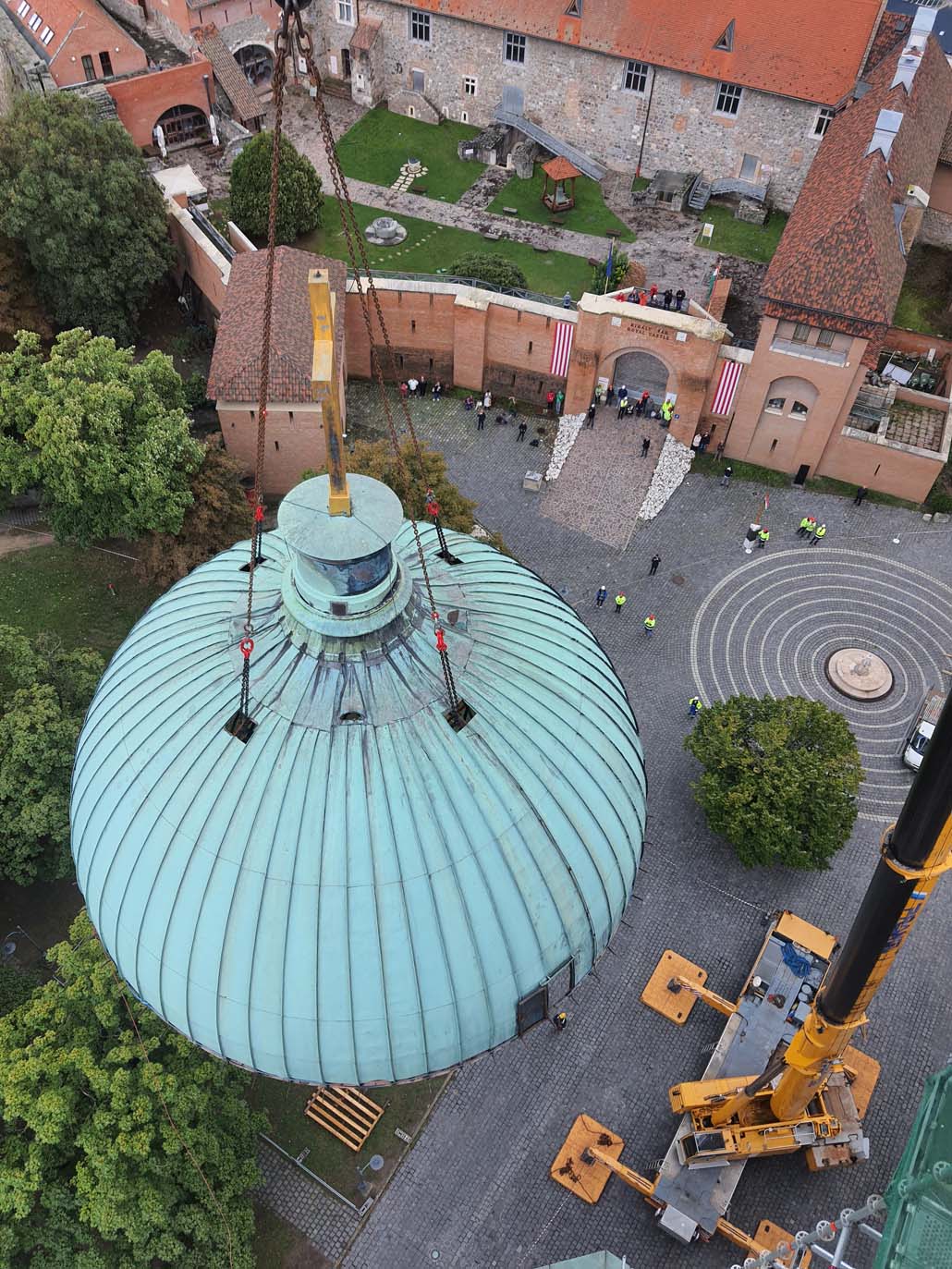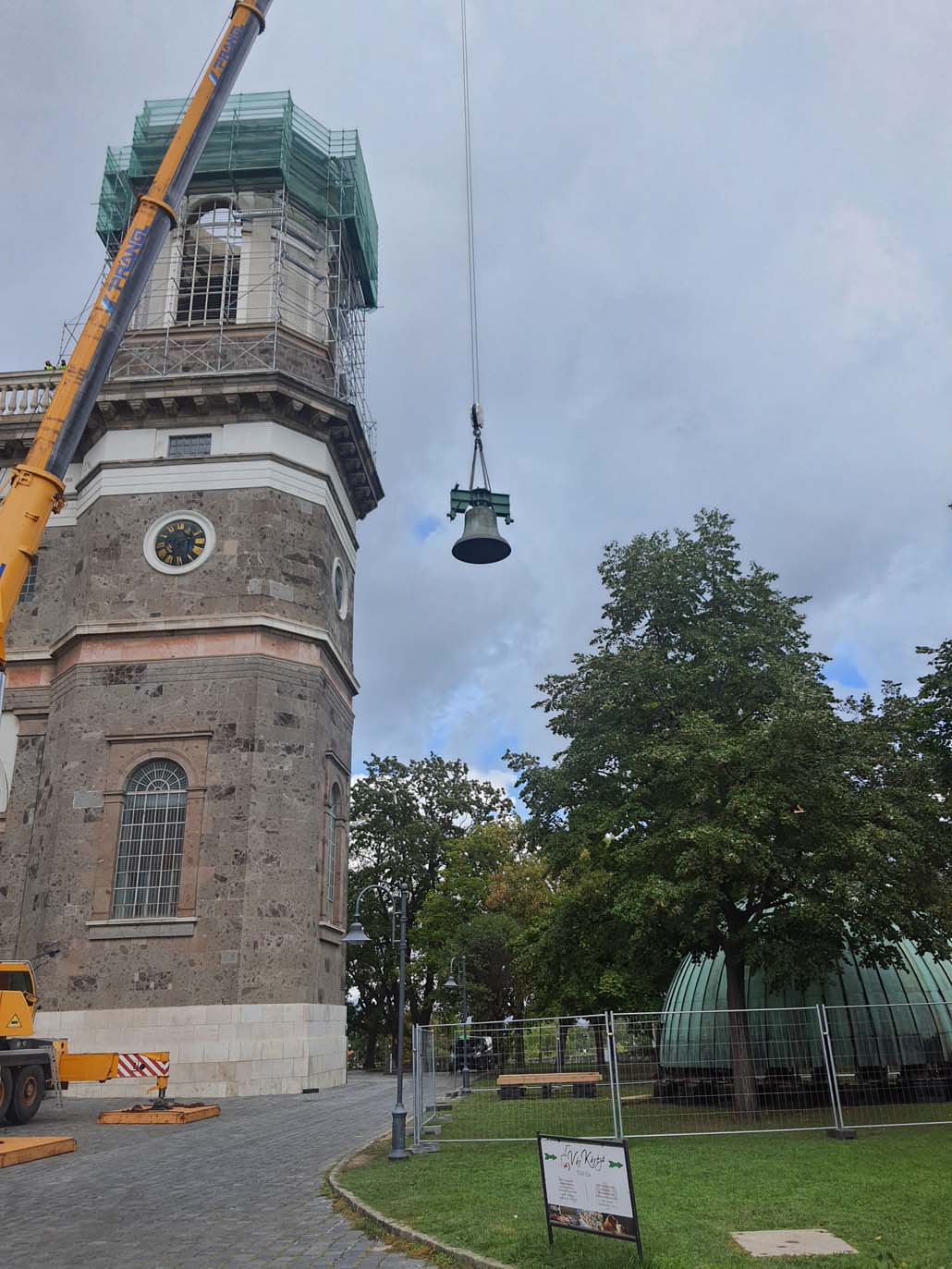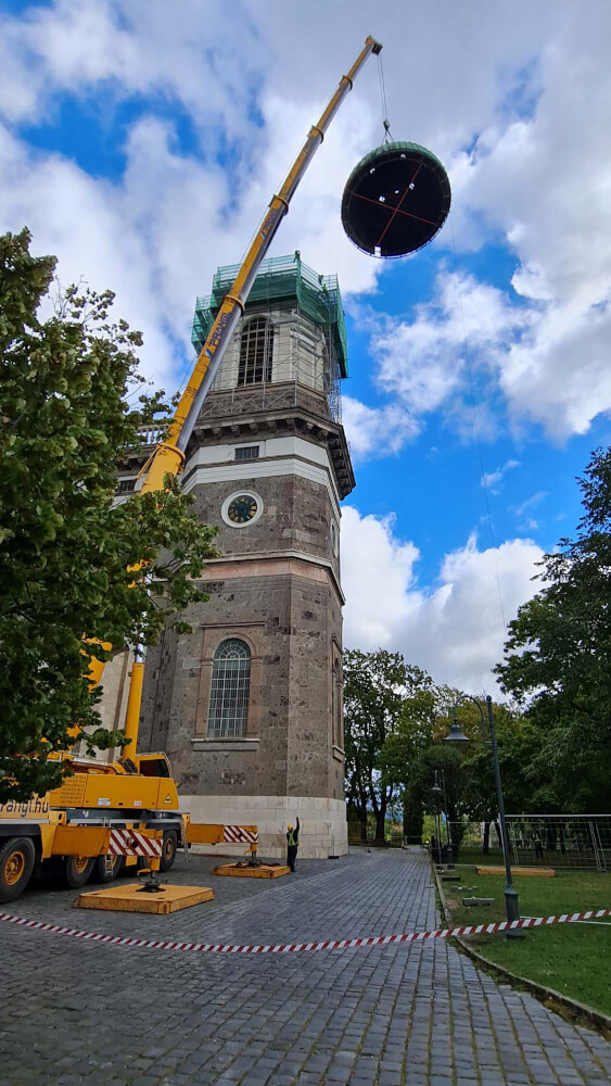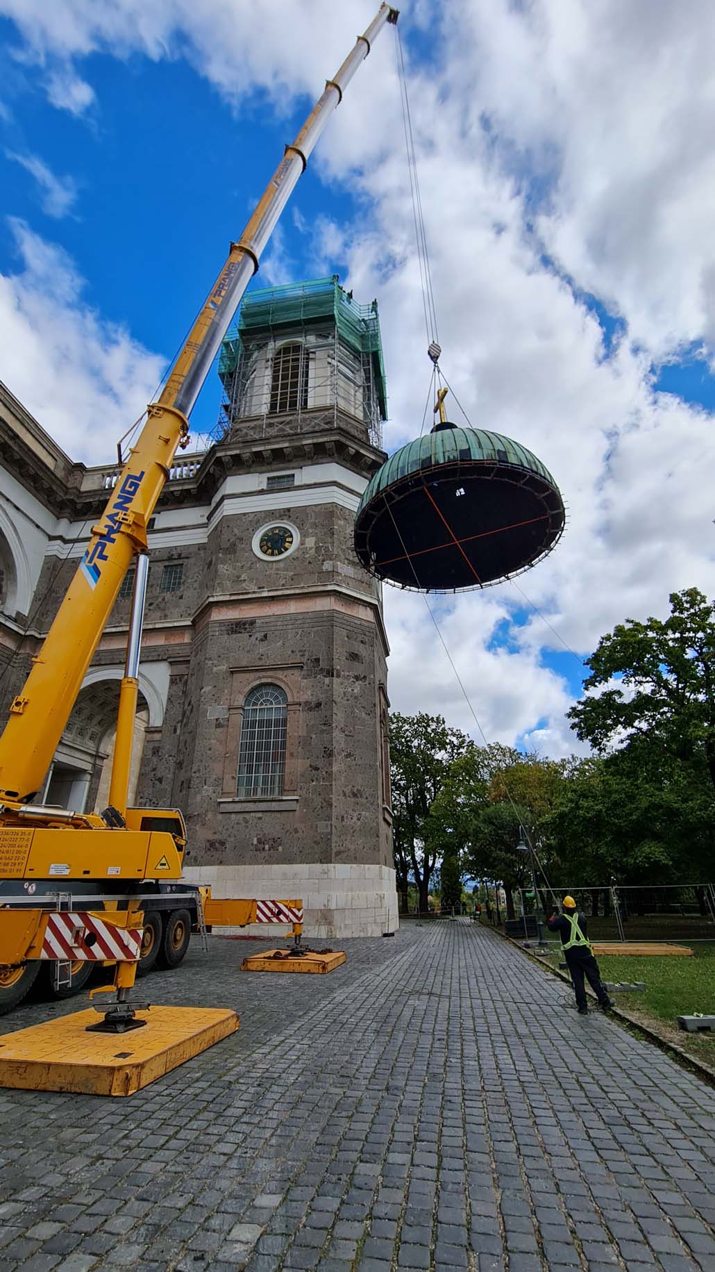 Esztergom Cathedral, a 100-metre-high neoclassical cathedral, is enthroned at the highest point of the city. With an area of 5,660 square metres, it is considered the largest church in Hungary and one of the largest basilicas in Europe. Now the magnificent church is being carefully renovated; the work is progressing. An important phase is the complete interior and exterior renovation of the south tower. In order to restore the largest of the three bells housed here - without destroying the masonry of the tower - the dome of the tower had to be lifted off and the entire roof structure removed.