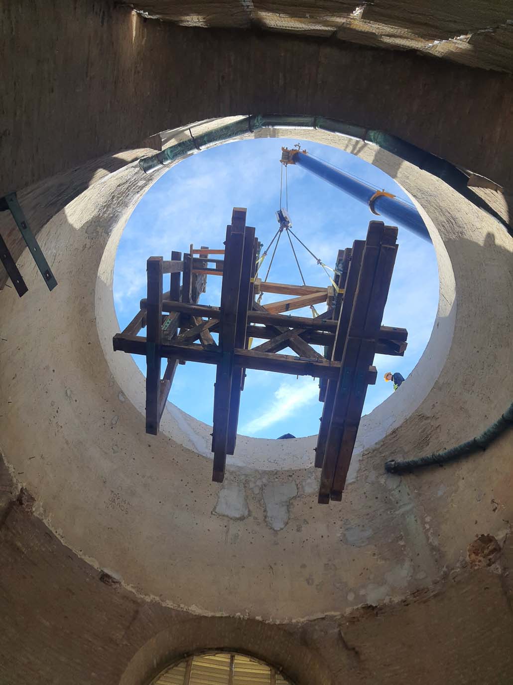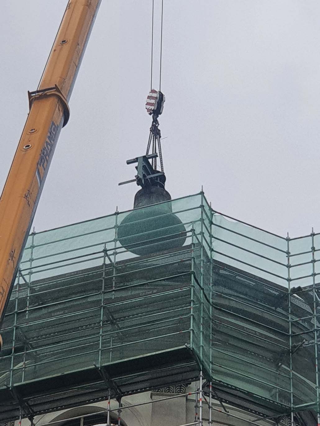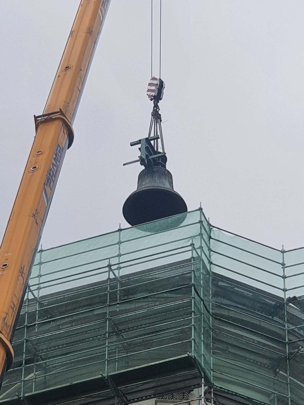 During the extensive renovation work, the task of the Prangl experts was not only to lift off the 11 tonne dome of the south tower in order to remove the large bell for renovation. It also had to be almost completely gutted. This is because completely new ceiling and belfry beams will in future be able to carry five to six bells instead of the previous three.