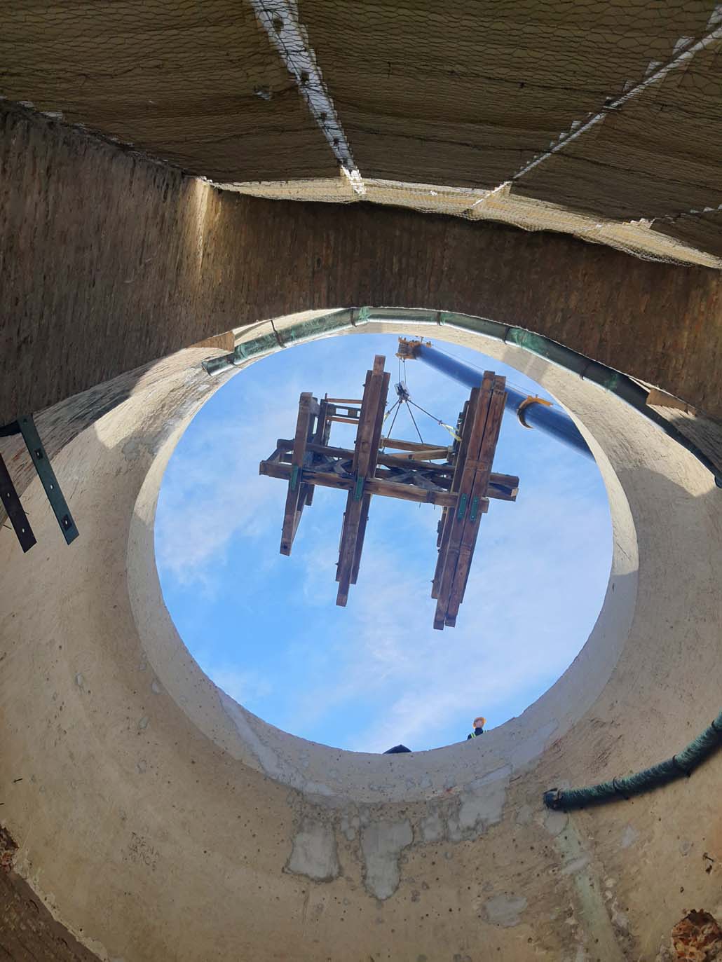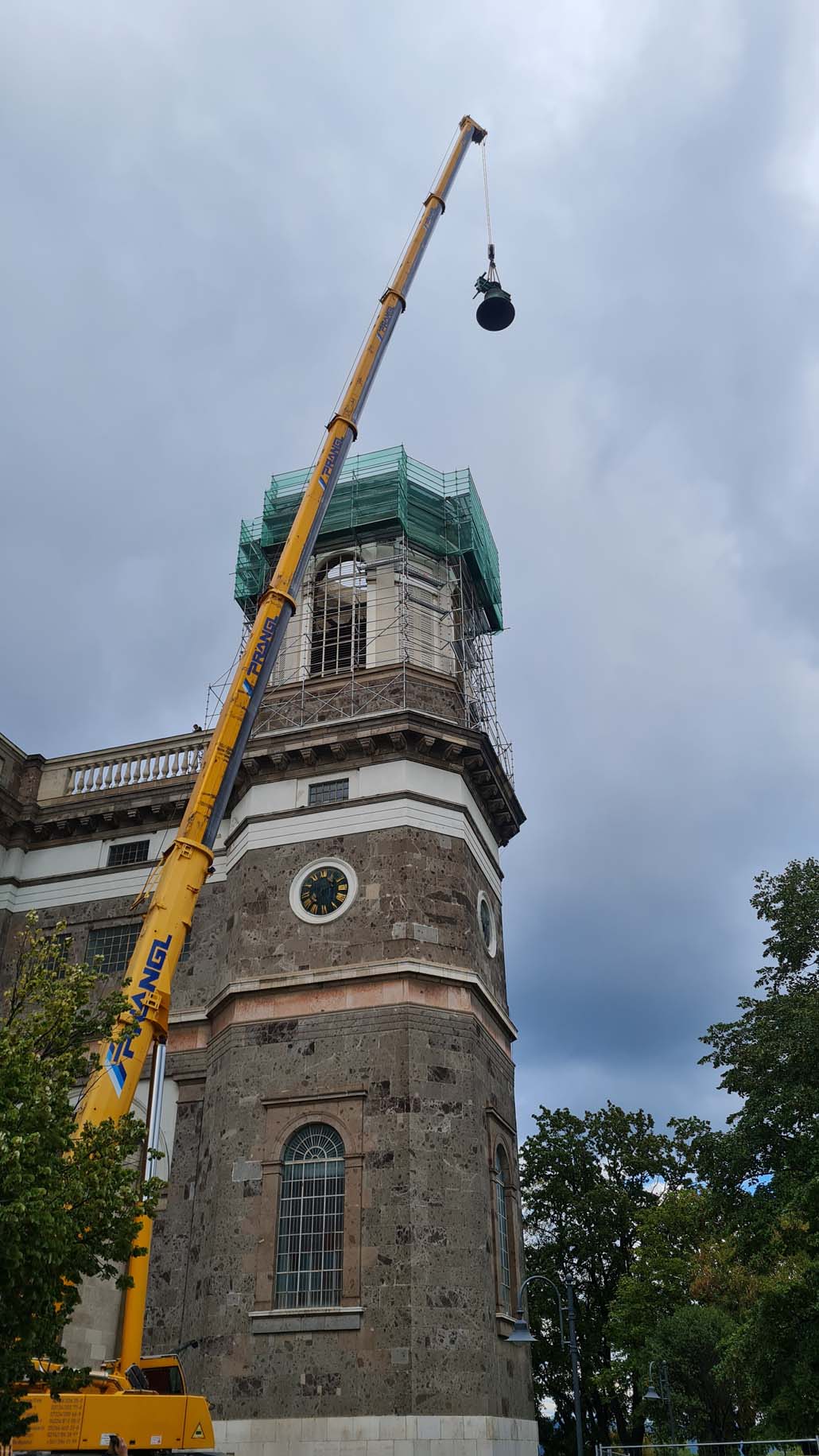 The next lifting operations were for the demolition and removal of the ceiling above the bells. The large bell with a diameter of almost 2.2 metres and a weight of about 6 tonnes was next in line. It was lifted out together with a beam weighing about 1.3 tonnes. The second bell, weighing around 300 kilograms and with a diameter of 0.8 metres, followed. During the subsequent lifting out of the belfry, it was important that it was removed in as large units as possible. This meant that it was disassembled into two parts, each weighing 5.5 and 6 tonnes, and these were lifted out individually.