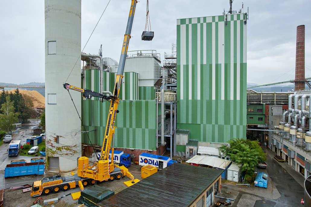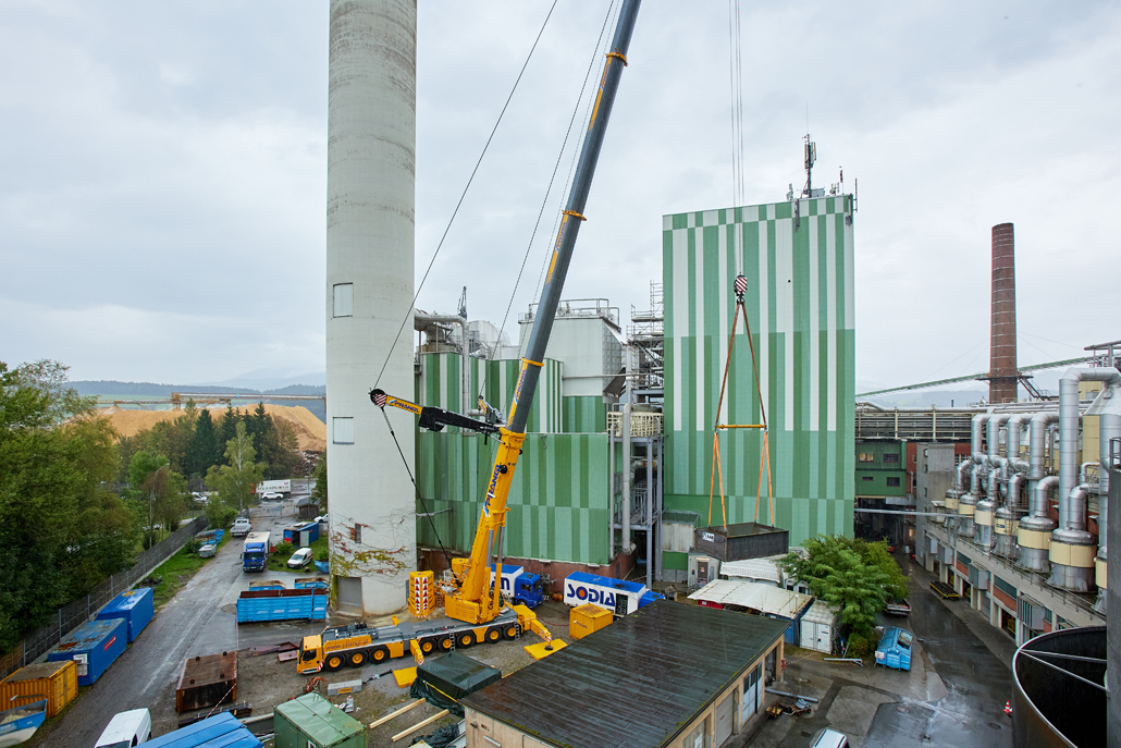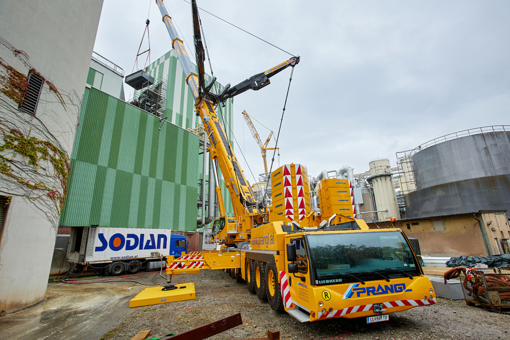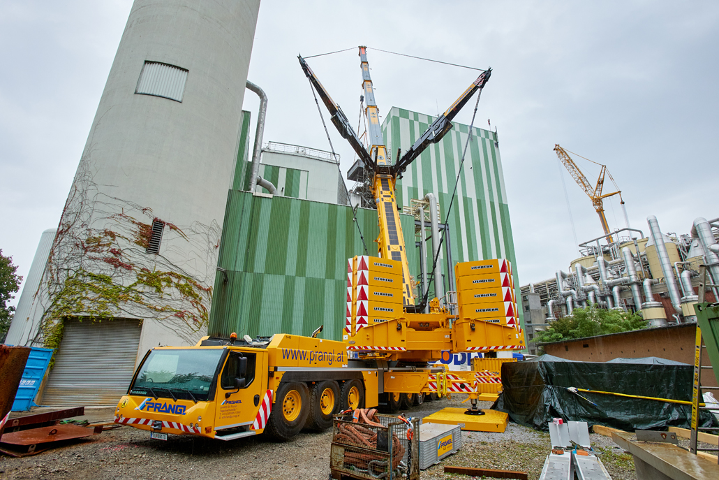 The Prangl team carried out a special assignment at Hallein: AustroCel, a manufacturer of environmentally-friendly pulp and bio-energy, commissioned the family business with demanding lifting work. The goal of the project was to replace massive heat exchanger packs - each 5 metres long, 3.4 metres wide, 1.6 metres high and weighing about 28 tonnes - which needed to be moved precisely and safely.