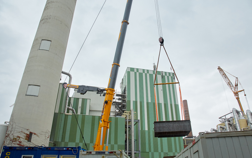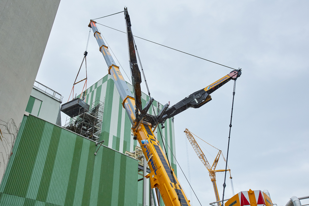 In the first step, the hall wall was opened at the height of the heat exchanger with the help of a 160 tonne telescopic crane, followed by assembly of an auxiliary structure. Then, a specially designed rail system was installed which made it possible to slide in and out as well as lift the heat exchanger packs. The precisely positioned 700 tonne mobile crane first lifted out the smaller components of the old heat exchanger. The main pack of the old heat exchanger was pushed out and safely removed by the heavy-duty crane. Then, the new heat exchanger was placed on the auxiliary structure with millimetre precision, inserted and installed.