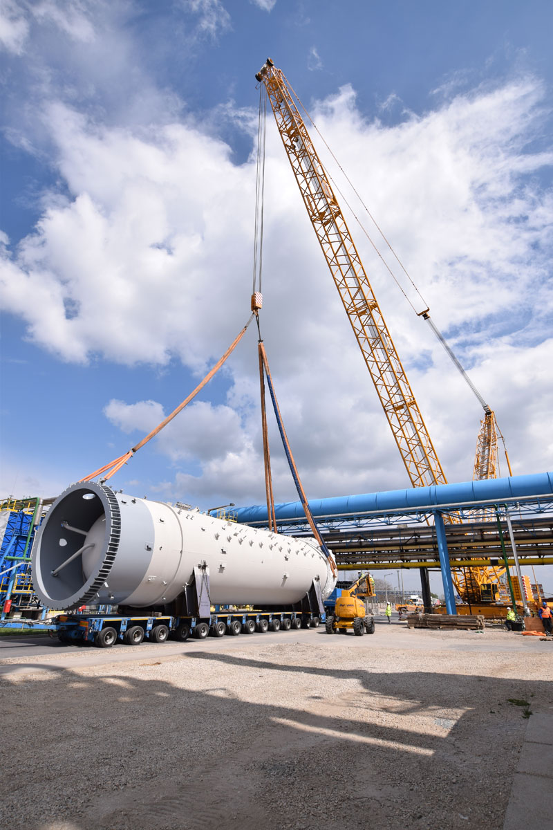 The heavy lifting was planned for April/May 2016. A pipe bridge inside the fertiliser plant with an elevation of 4.8 metres meant that six of the eight appliances that arrived had to be lifted over. The limited space and tight schedule were particularly challenging. A 400 tonne crawler crane with a 66 metre main boom and a Superlift counterweight of 200 tonnes was used to lift over the pipe bridge. With individual weights of 112 tonnes and 80 tonnes, and total lengths of just under 23 metres, the heaviest items lifted were the two parts of the absorption tower.