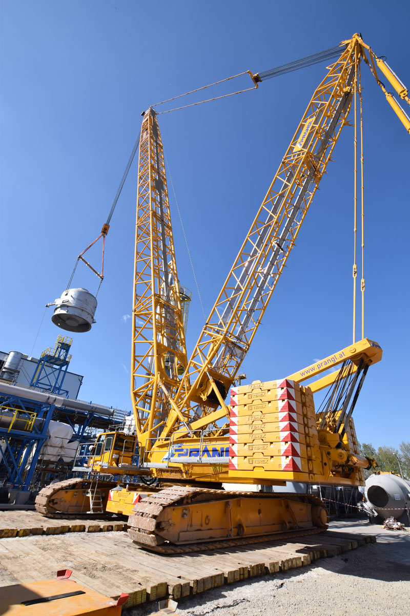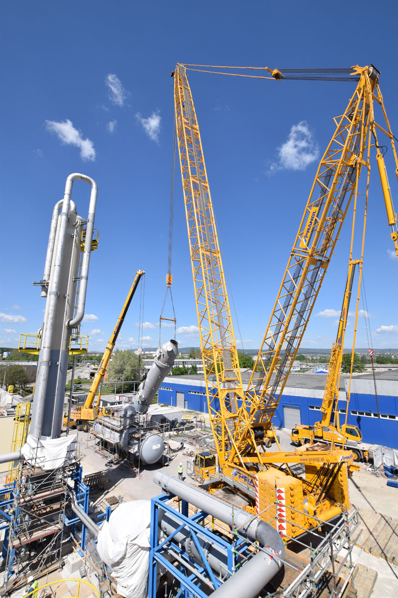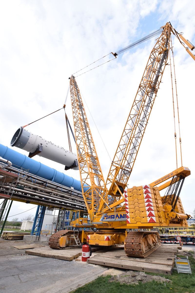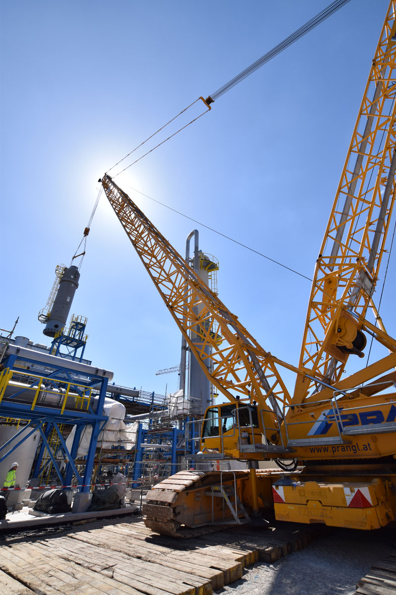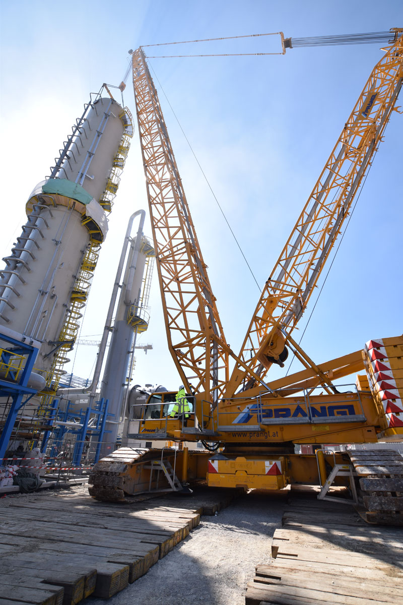 After this project step was complete, the 400 tonne crawler crane was driven back to the north side, again in a fully assembled condition, where it worked in tandem with a 350 tonne telescopic crane to turn and lift the two parts of the absorption tower. A 100 tonne telescopic crane with personnel basket was brought in for the final installation work. Thanks to the active assistance of the entire Prangl team, the planned work was able to be carried out quicker than predicted and to the full satisfaction of all involved.