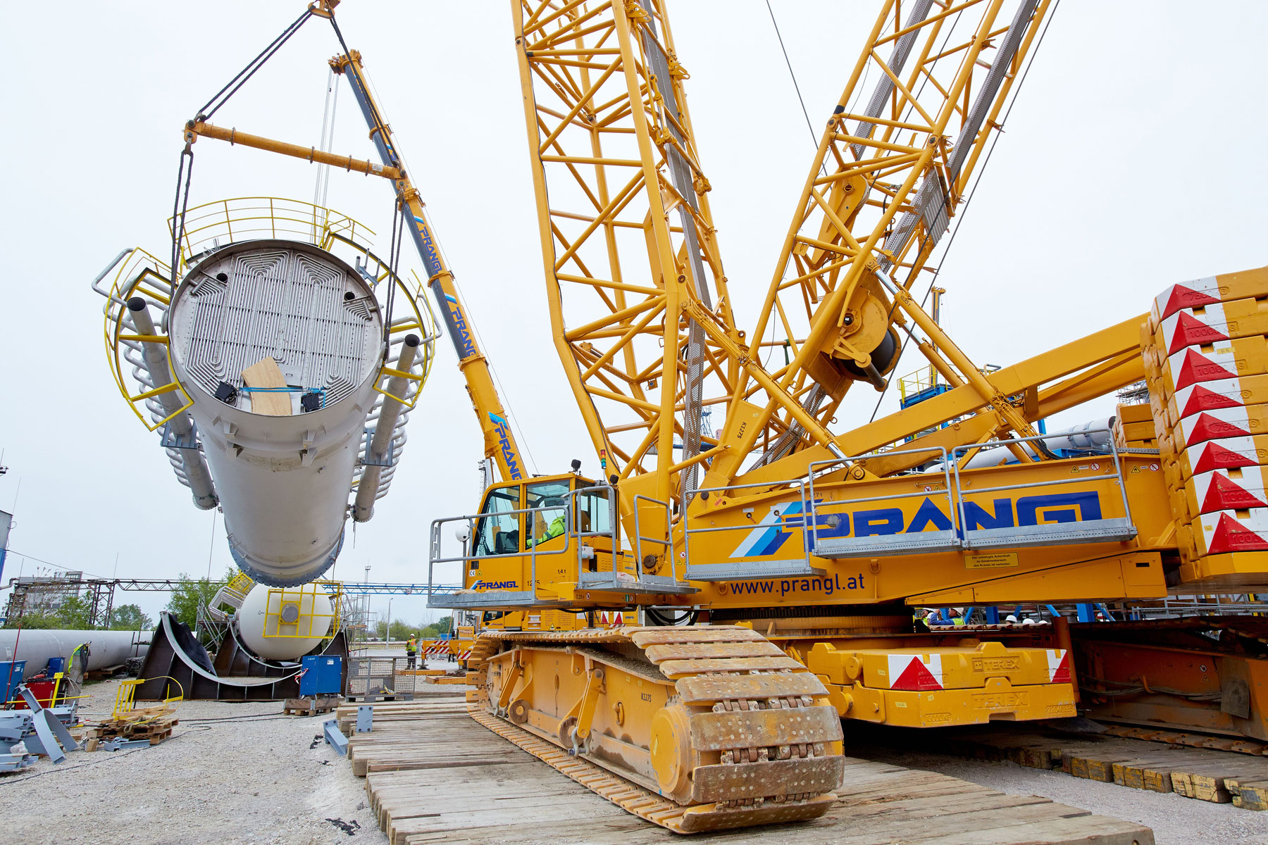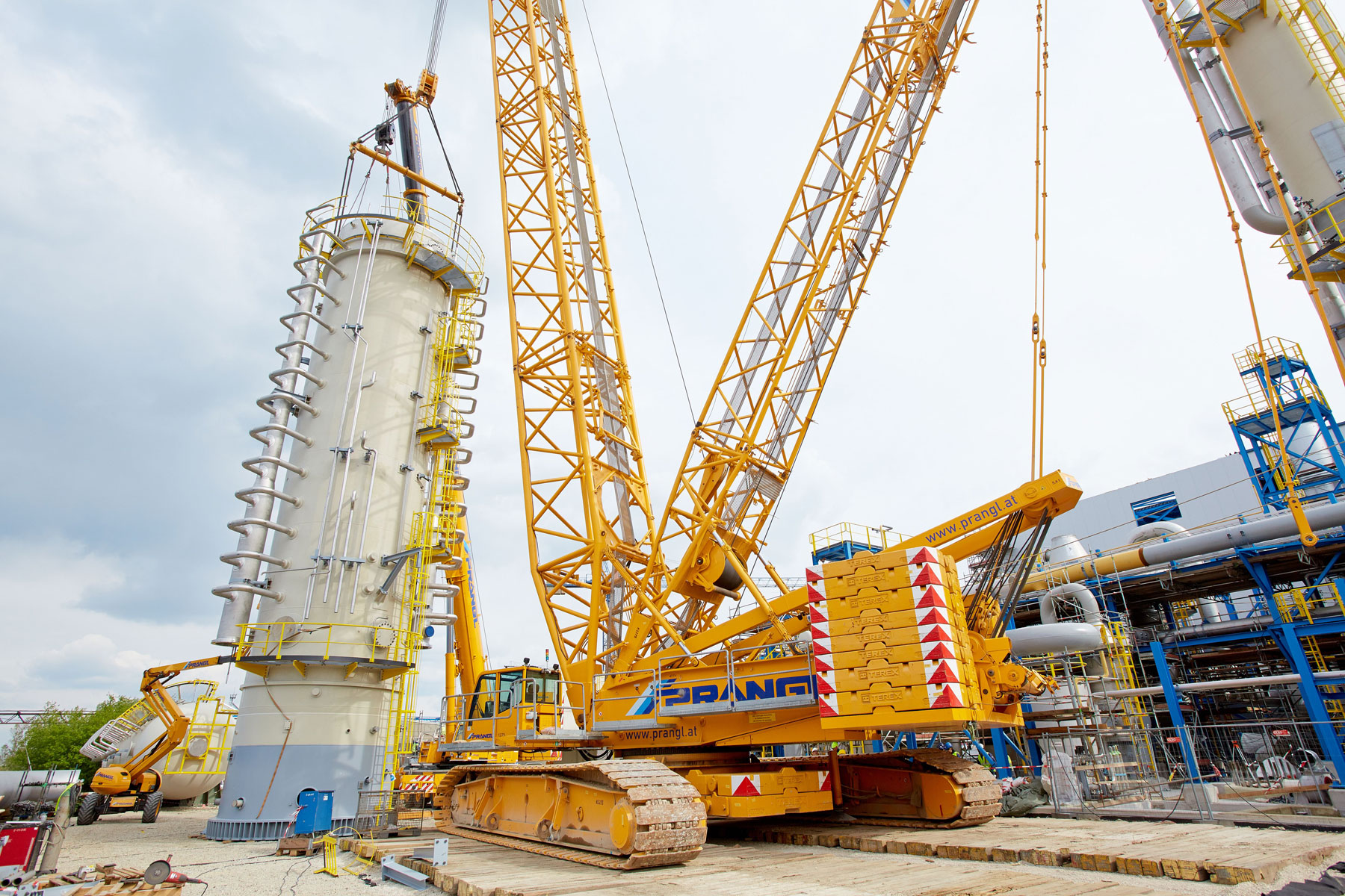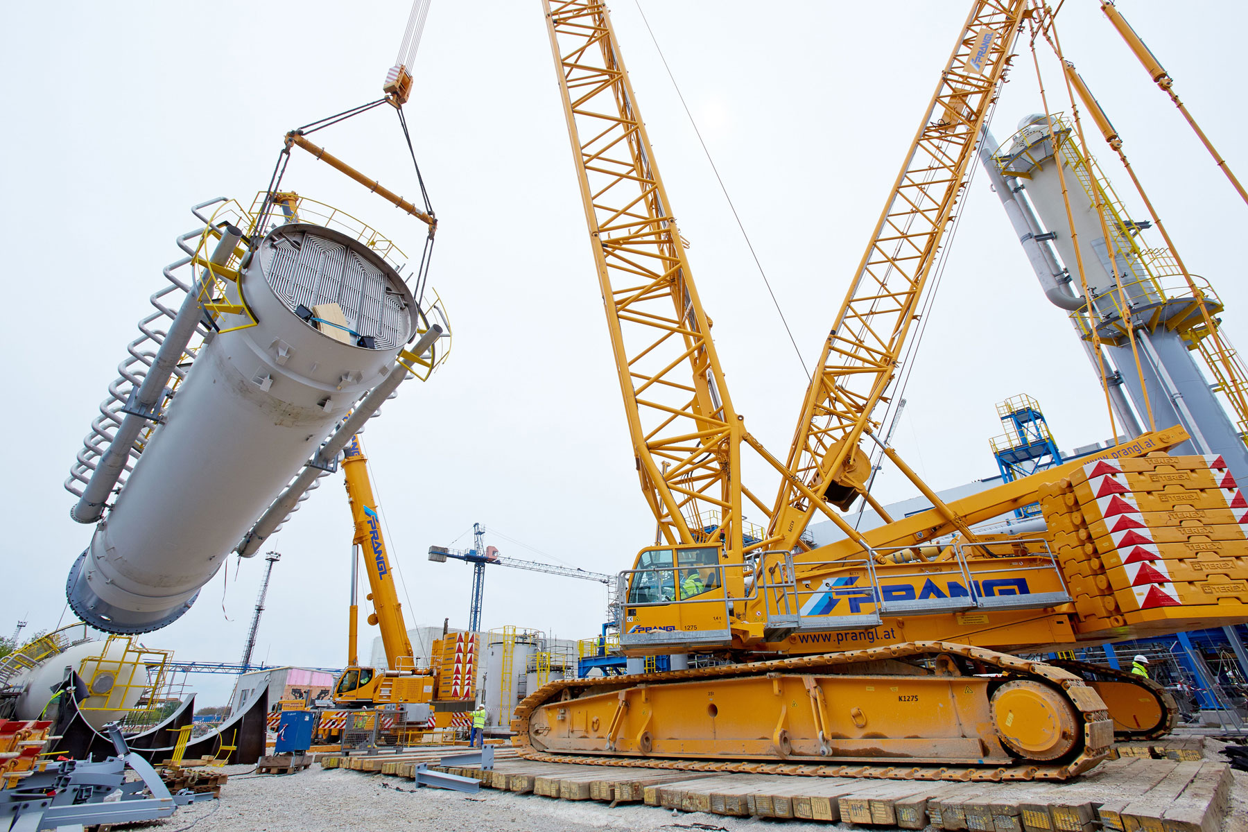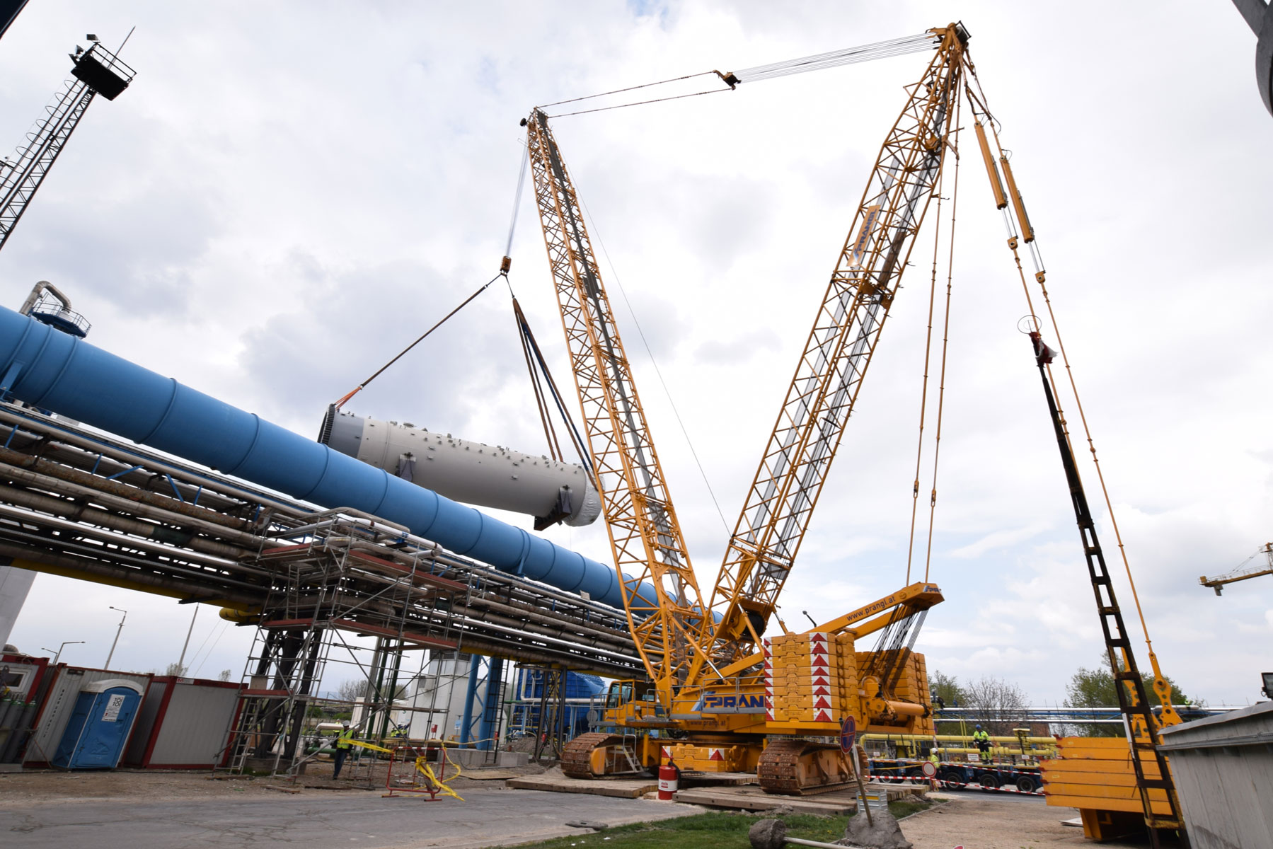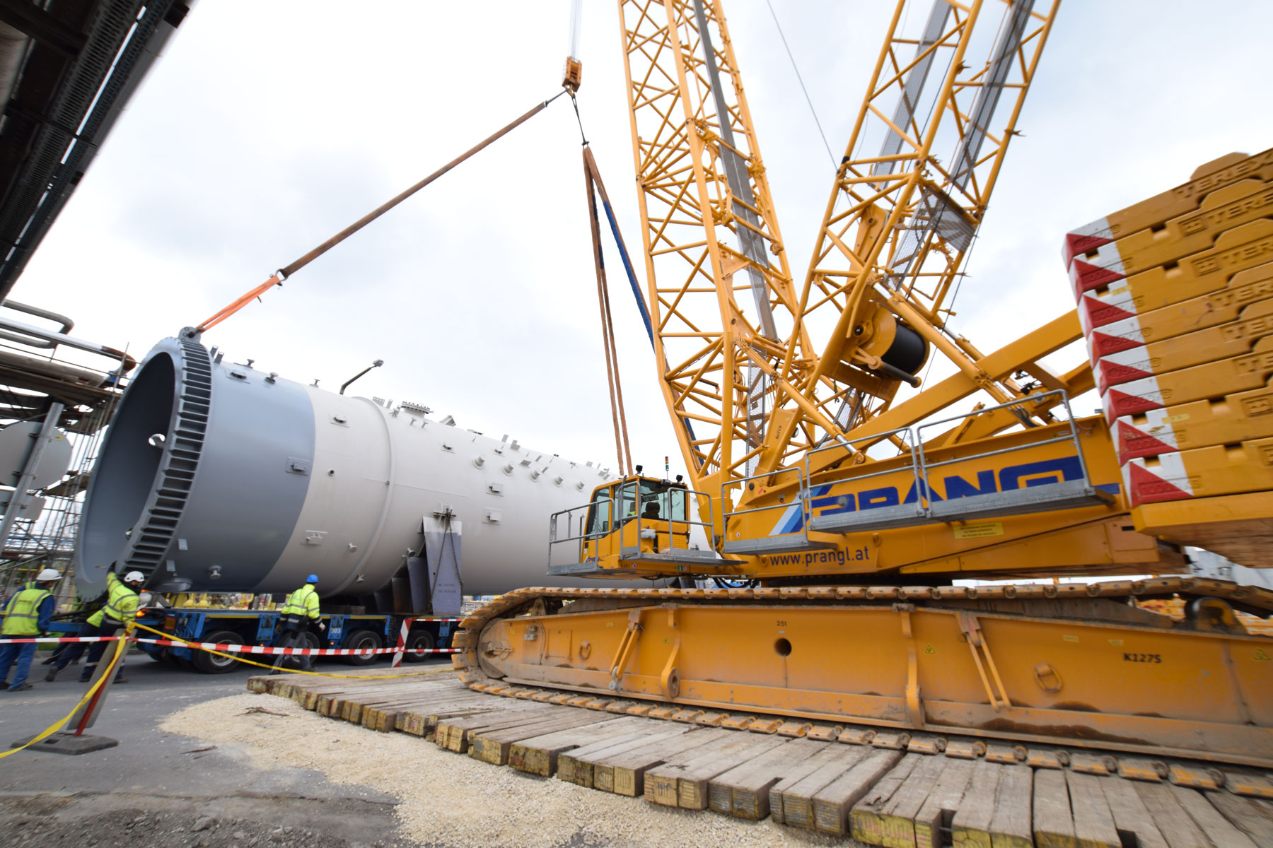 After this project step was complete, the 400 tonne crawler crane was driven back to the north side, again in a fully assembled condition, where it worked in tandem with a 350 tonne telescopic crane to turn and lift the two parts of the absorption tower. A 100 tonne telescopic crane with personnel basket was brought in for the final installation work. Thanks to the active assistance of the entire Prangl team, the planned work was able to be carried out quicker than predicted and to the full satisfaction of all involved.
