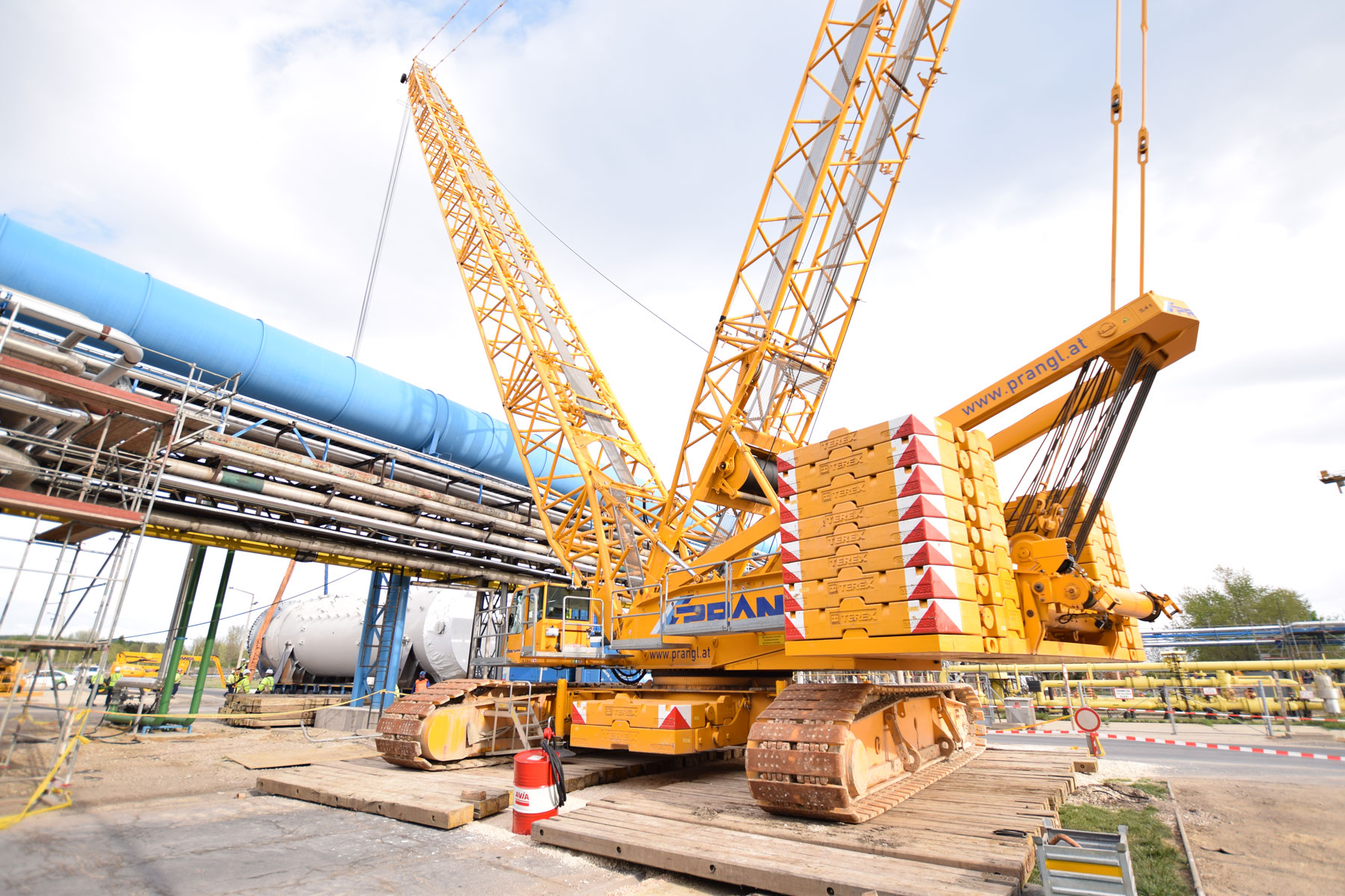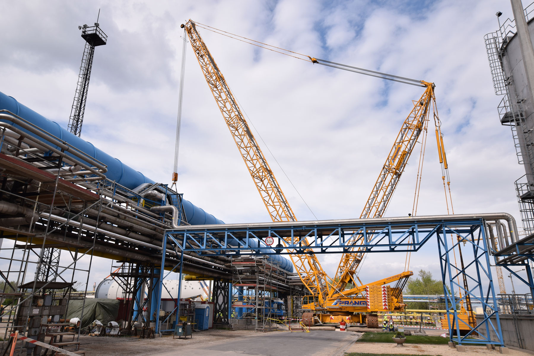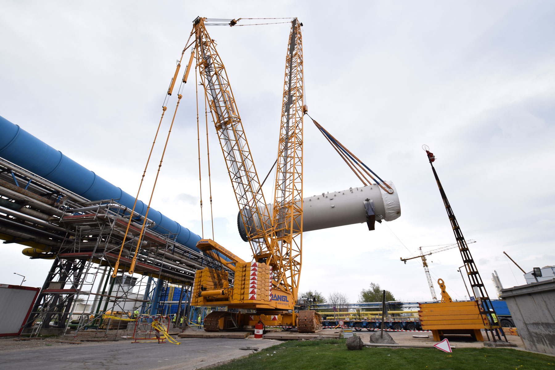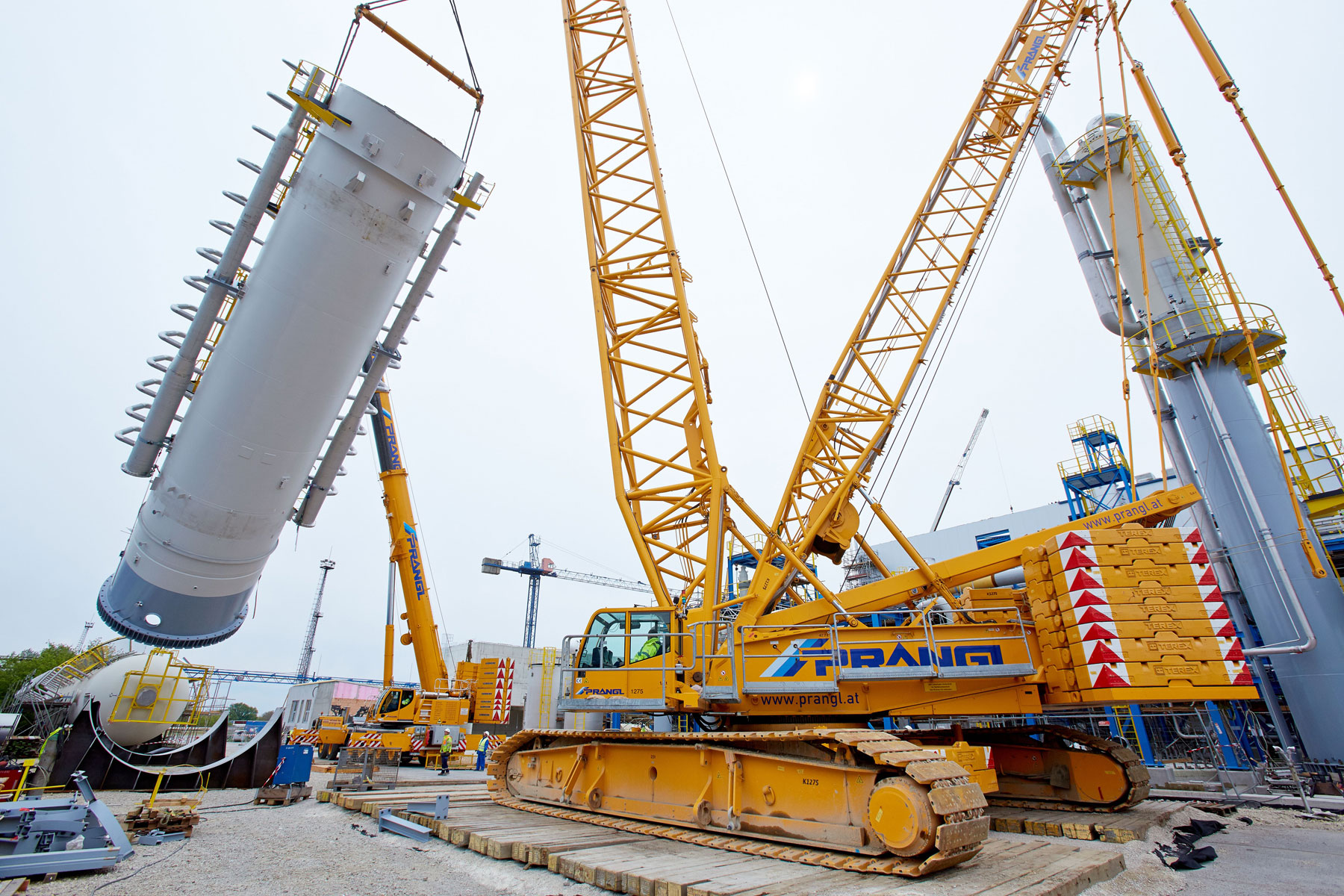 After this project step was complete, the 400 tonne crawler crane was driven back to the north side, again in a fully assembled condition, where it worked in tandem with a 350 tonne telescopic crane to turn and lift the two parts of the absorption tower. A 100 tonne telescopic crane with personnel basket was brought in for the final installation work. Thanks to the active assistance of the entire Prangl team, the planned work was able to be carried out quicker than predicted and to the full satisfaction of all involved.