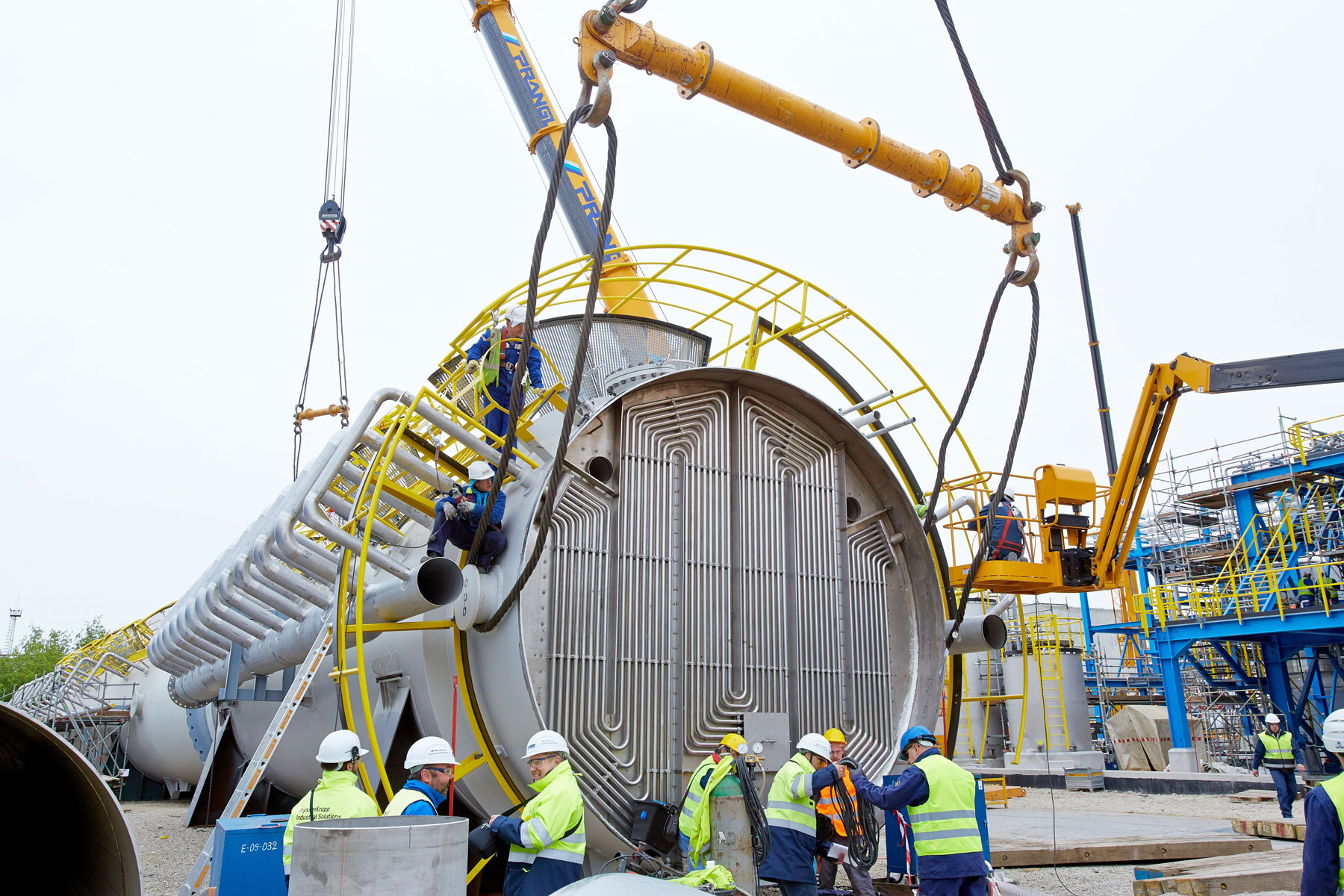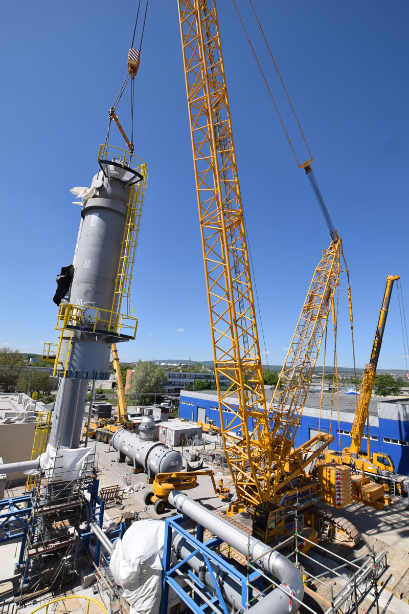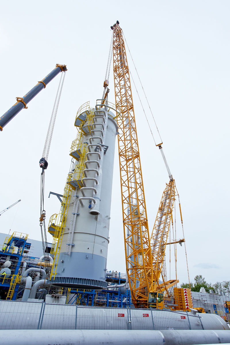 Another challenge was lifting the process gas cooler that weighs 93 tonnes, has a diameter of 5.8 metres and is 5.4 metres high. Due to the limited space, the entire team was also challenged when storing the eight appliances intermediately. A 350 tonne and a 160 tonne telescopic crane were used to put all components into their proper place on the same day as planned. The crawler crane was then relocated from the pipe bridge to the north construction site. As driving was not possible, the large crane had to be completely dismantled and re-assembled.