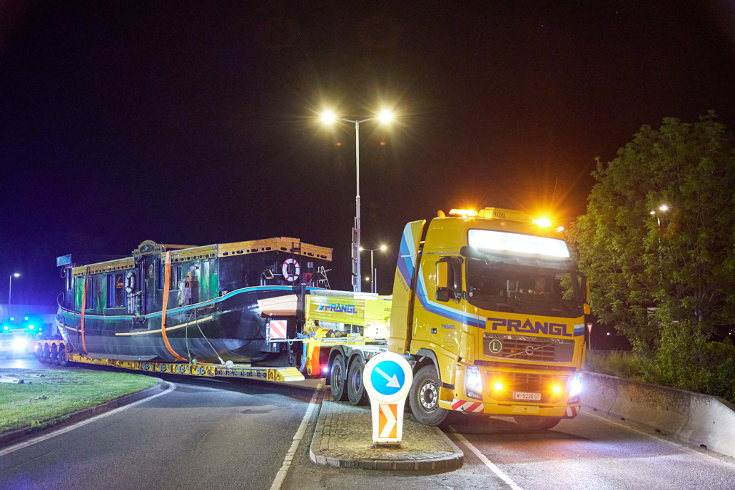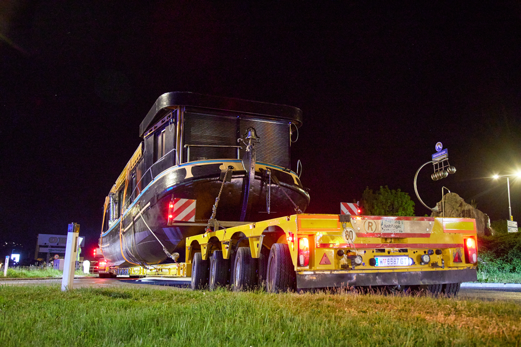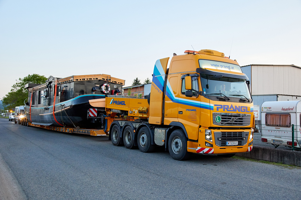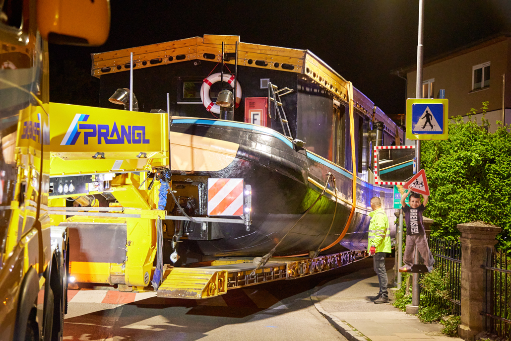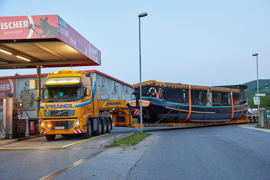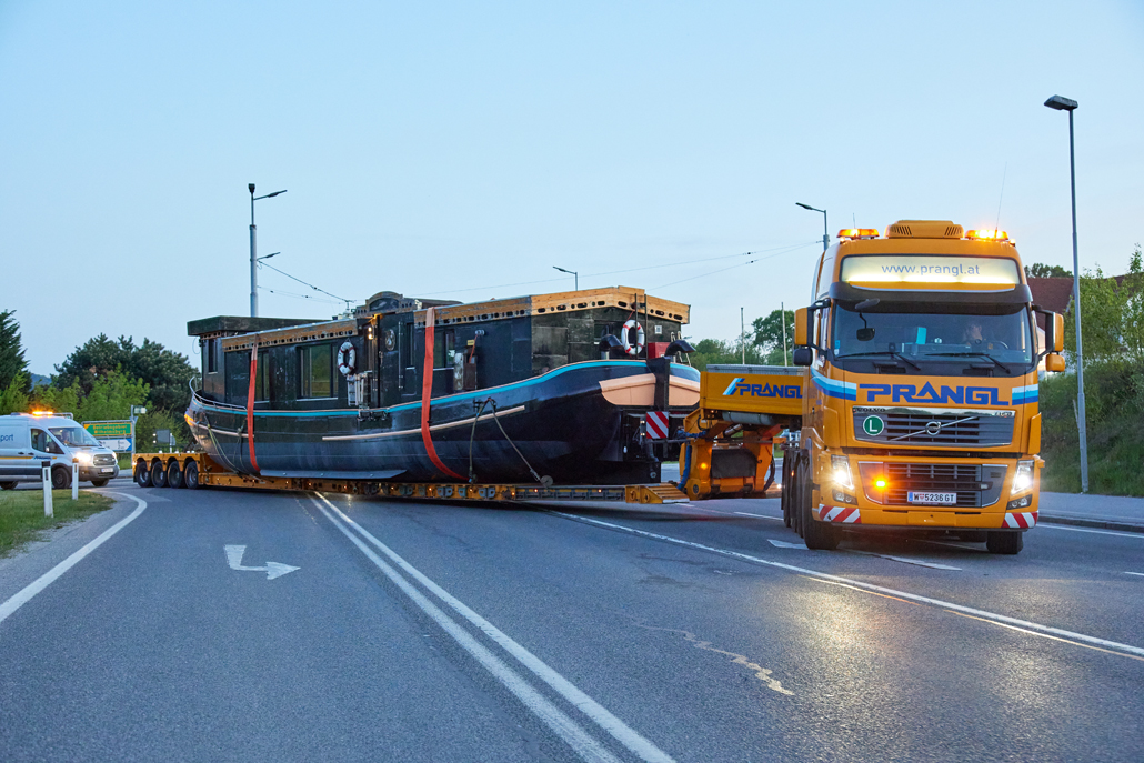 A houseboat that once travelled the canals of Amsterdam in the Netherlands found itself a new owner in Austria. This new owner spent years renovating it in a boatyard in Wilhelmsburg, adapting it to his requirements. And once the work was complete, it was to be launched in the Danube. Prangl was entrusted with this unusual heavy duty transportation.