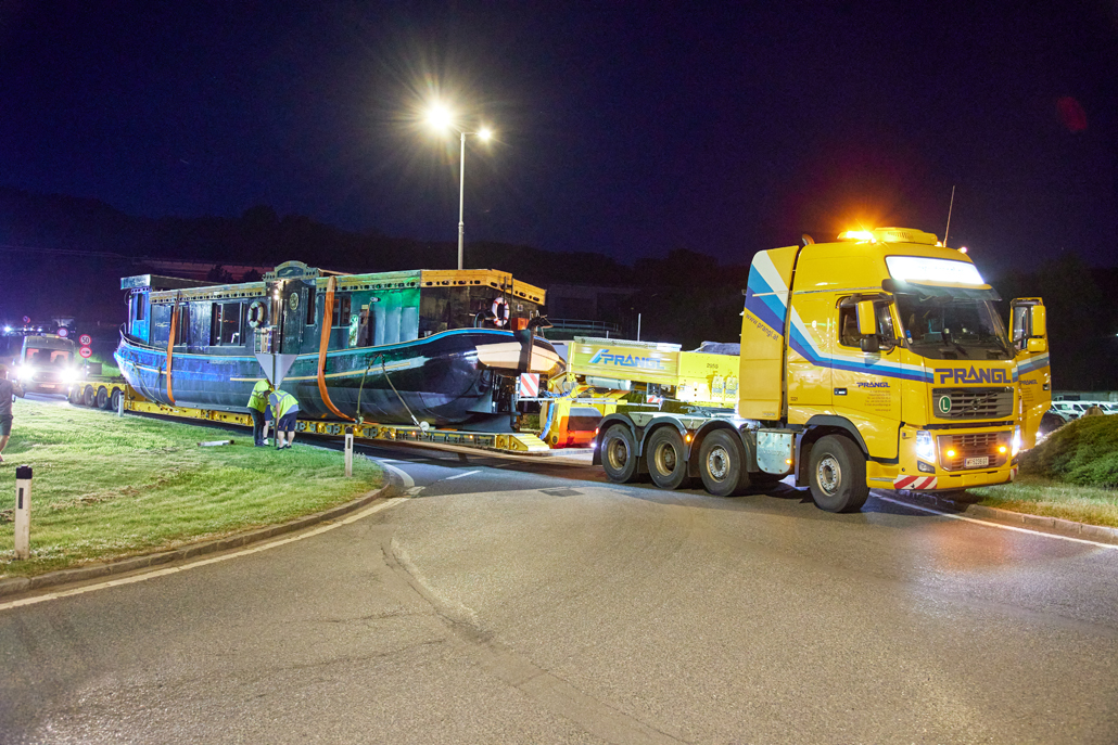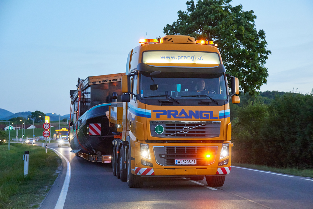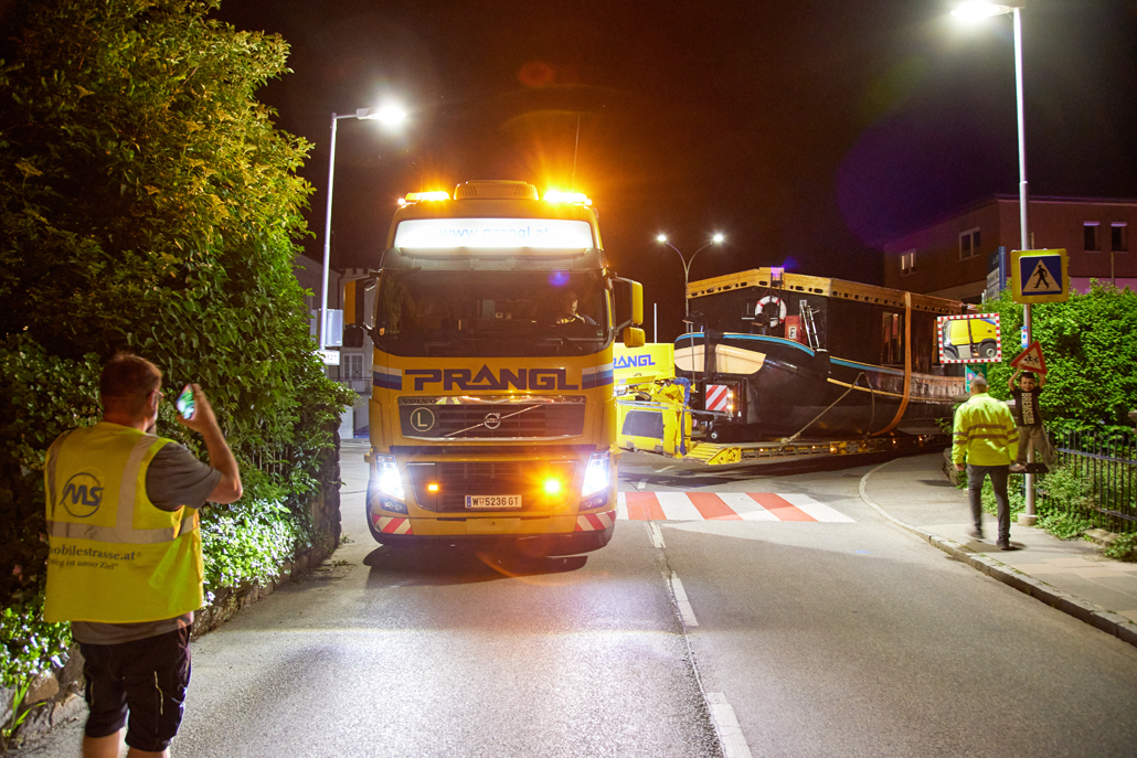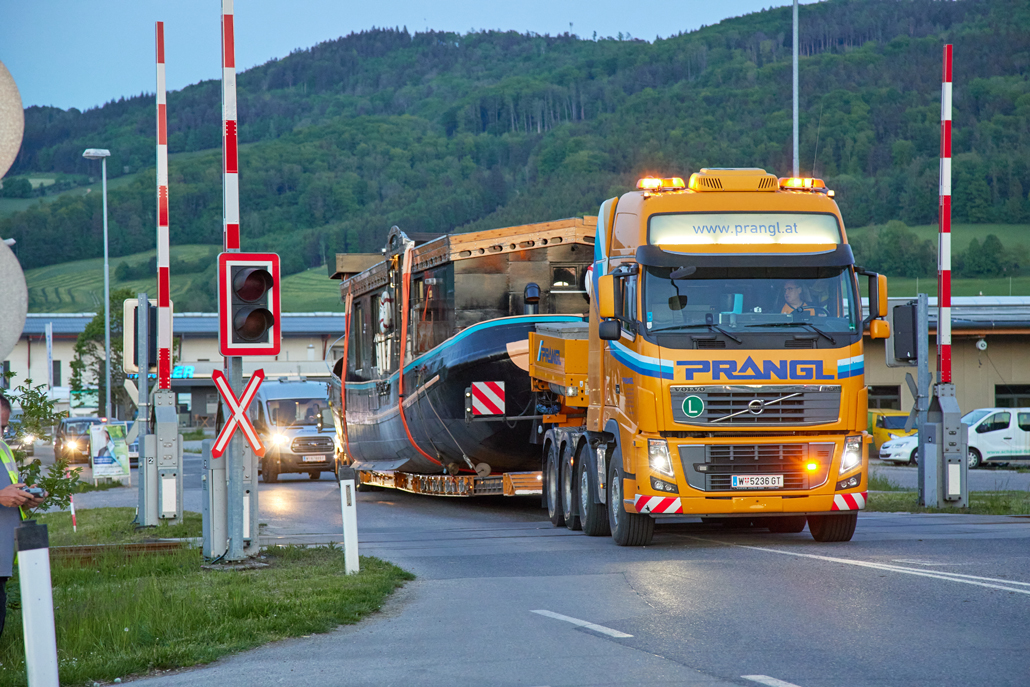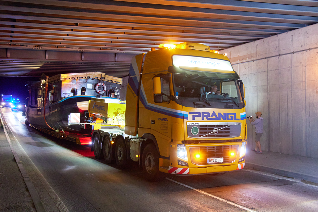 With a length of 35.0 metres, a width of 4.3 metres, a height of 4.5 metres and a total weight of 75 tons, the final transport train exhibited impressive parameters. In the evening, it set off on time, accompanied by several road patrol vehicles – making its way along the chosen route, which was 40 kilometres long. The convoy quickly made its way along the first section on the motorway, which took care of most of the physical mileage. But even at the Pöchlarn motorway exit, it became clear that tight bends would be a challenge for the driver and support crew.