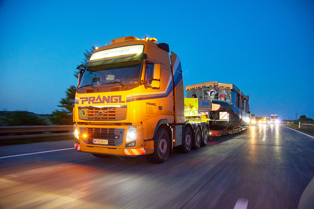 It goes without saying that shifting a 31-ton houseboat with a length of 20.0 metres, a width of 4.3 metres and a height of 4.0 metres is no small feat. Transporting cargo of these dimensions places very specific demands on the specialist transporters. It was clearly necessary to identify a suitable route between Wilhelmsburg and Pöchlarn with consideration to the aspects of weight, width and height. And the perfect transport equipment was naturally also essential. A 250 ton telescopic crane was on hand to lift the houseboat onto a 4-axle tractor unit with a 4-axle low-bed semi-trailer.