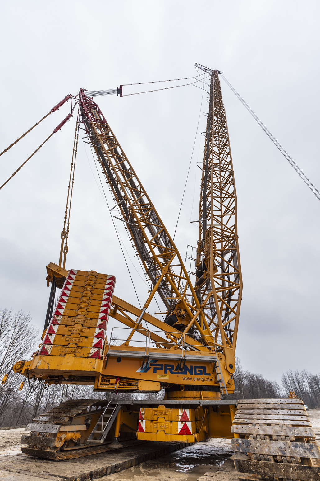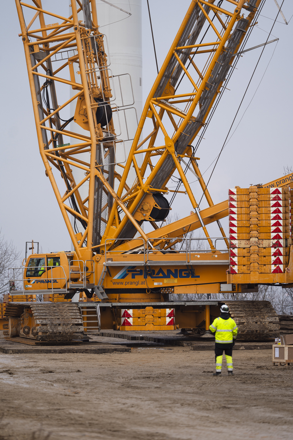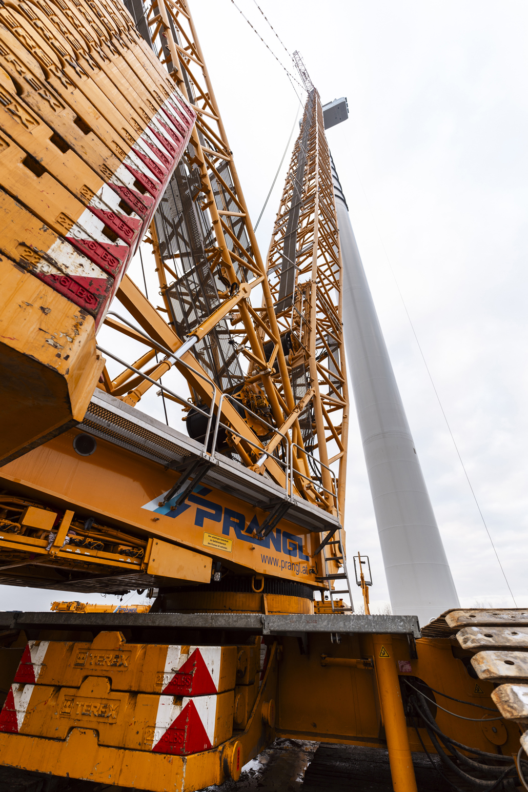The next step was to install the drive train and the hub on the ground using the 200-tonne auxiliary crane. Prangl’s strong crane (equipped with LSL+LF 8 up to 117 metres + 12 metres, 225 tonne main counterweights, 50 tonne central counterweights, 165 tonne SL counterweights) was then used to lift the drive train and the hub together. This lifting process weighed 107 tonnes. As the crawler crane is able to lift this type of weight, you save several hours of work during installation on every turbine.