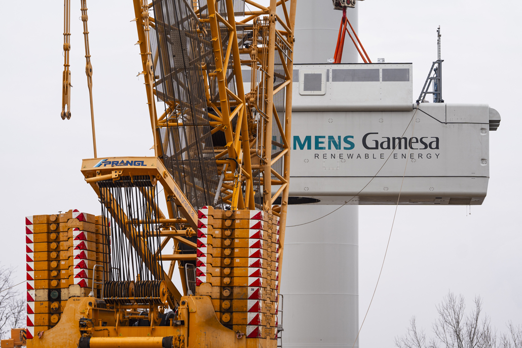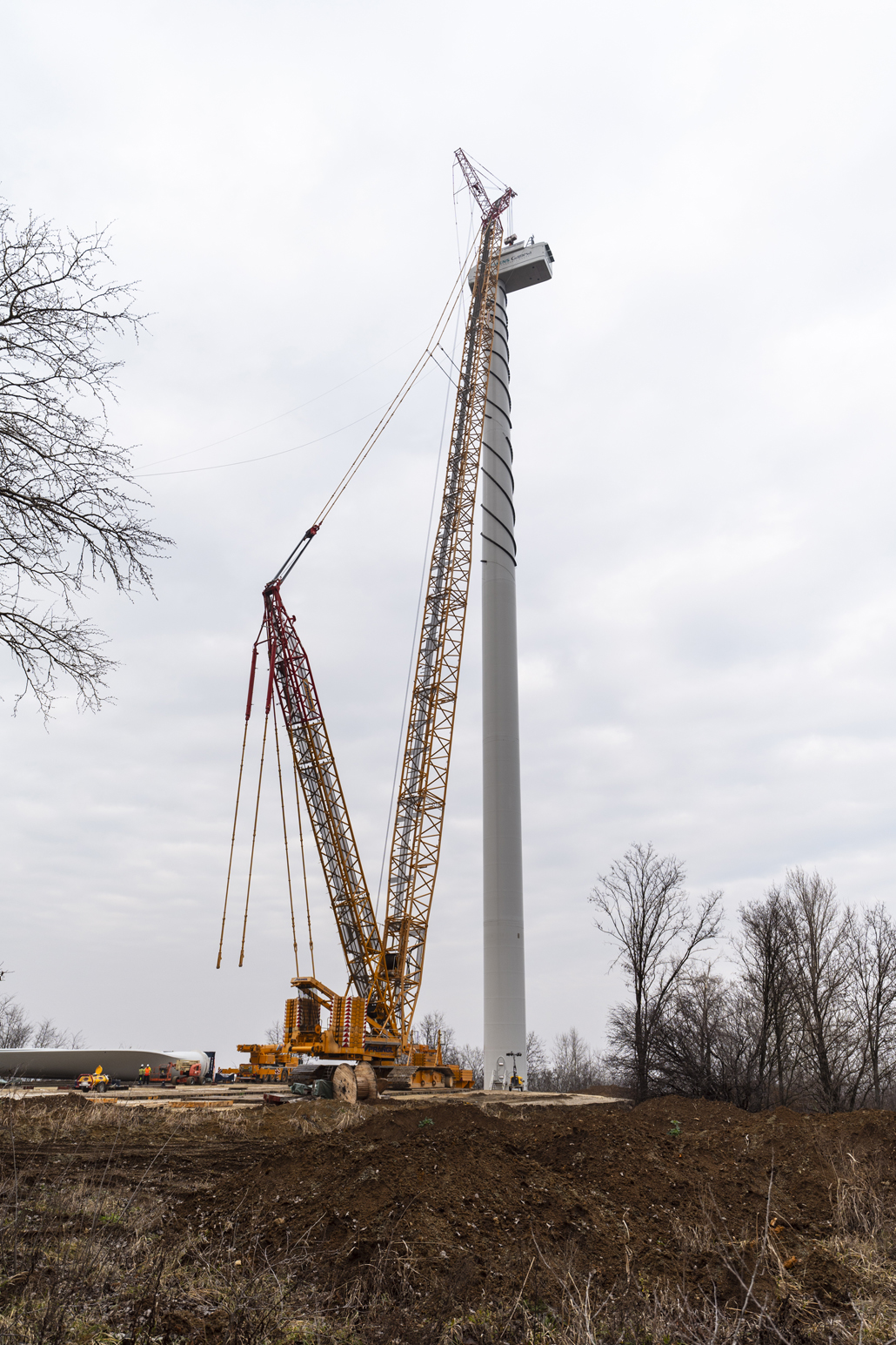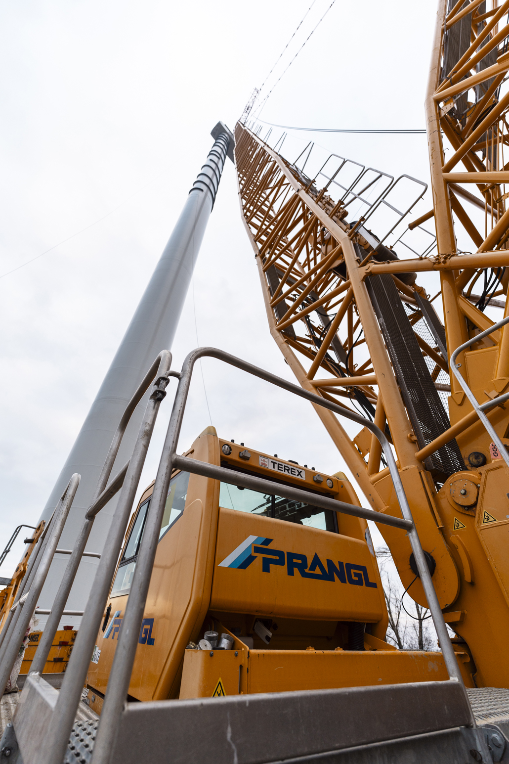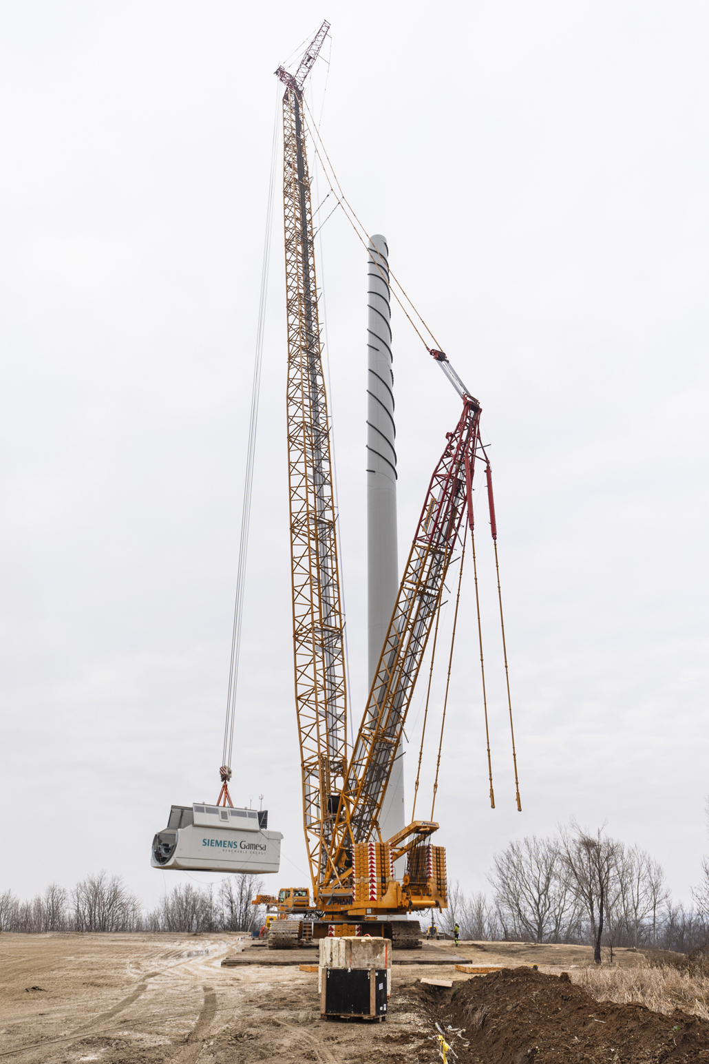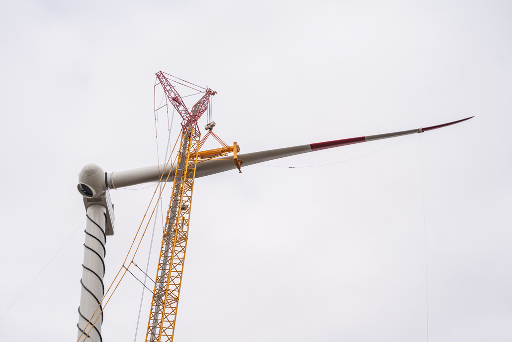 Thanks to its specifications, this crawler crane is able to move and lift all components and also to lift at a smaller radius than other cranes. Five tower segments, the nacelle, hub and drive train, as well as three vanes had to be installed for each wind turbine. The first step was to erect the tower. A 200 tonne telescopic crane was provided as support for this work. Together with the 200-tonner, the 650-tonne giant lifted the tower sections (each weighing 90.5 tonnes, 82.1 tonnes, 62.5 tonnes, 53.9 tonnes and 50.5 tonnes) in tandem.