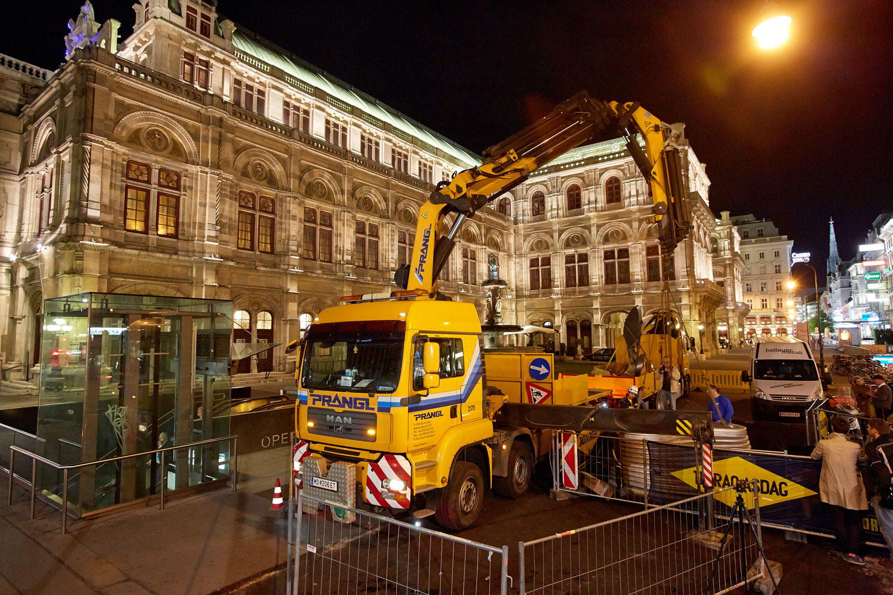 Due to the limited working space in front of the Vienna State Opera, Prangl's experts decided to use such a concept. Another reason for using both loader cranes was their flexibility and manoeuvrability making it possible for them to complete the lift in a very tight time window. Due to the thorough preparatory work, good local knowledge acquired from other jobs at the Herbert-von-Karajan-Platz and the precise work on site, this artistic project was successfully completed to the fullest satisfaction of all those involved.
