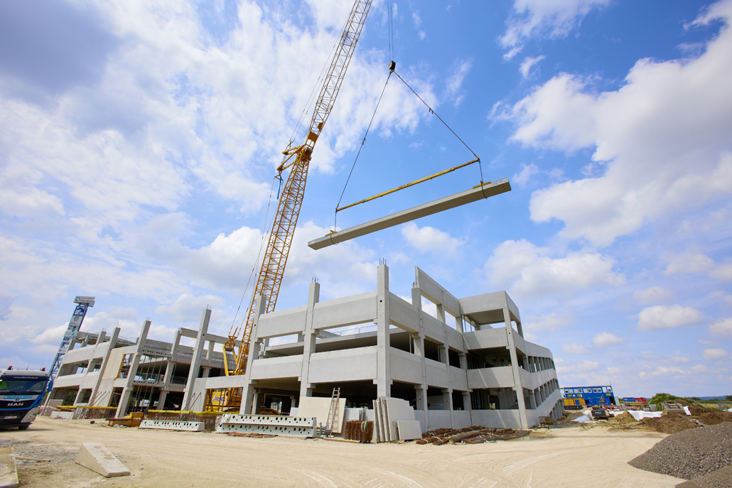 The next step was to install the ice walls and to concrete them in using a crane and a concrete bucket. The beams that weighed 11.9 tonnes (each with a length of 7.6 metres, a width of 1.9 metres and a height of 0.5 metres) and had to be installed between the pillars were up next. The hollow floors (each with a weight of 12.4 tonnes, a length of 18.50 metres, a width of 1.2 metres and a height of 0.45 metres) for the first floor were then laid and the connection joints concreted using a concrete bucket again. The steps starting from the beams were repeated one by one for the next 3 floors.