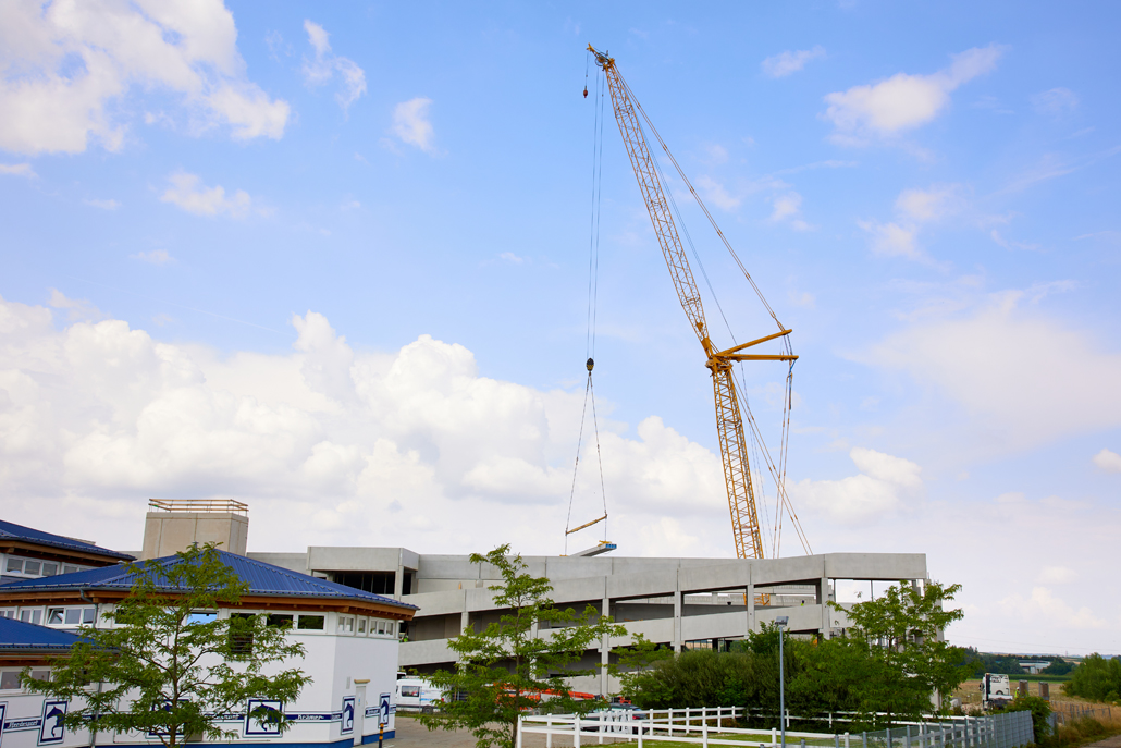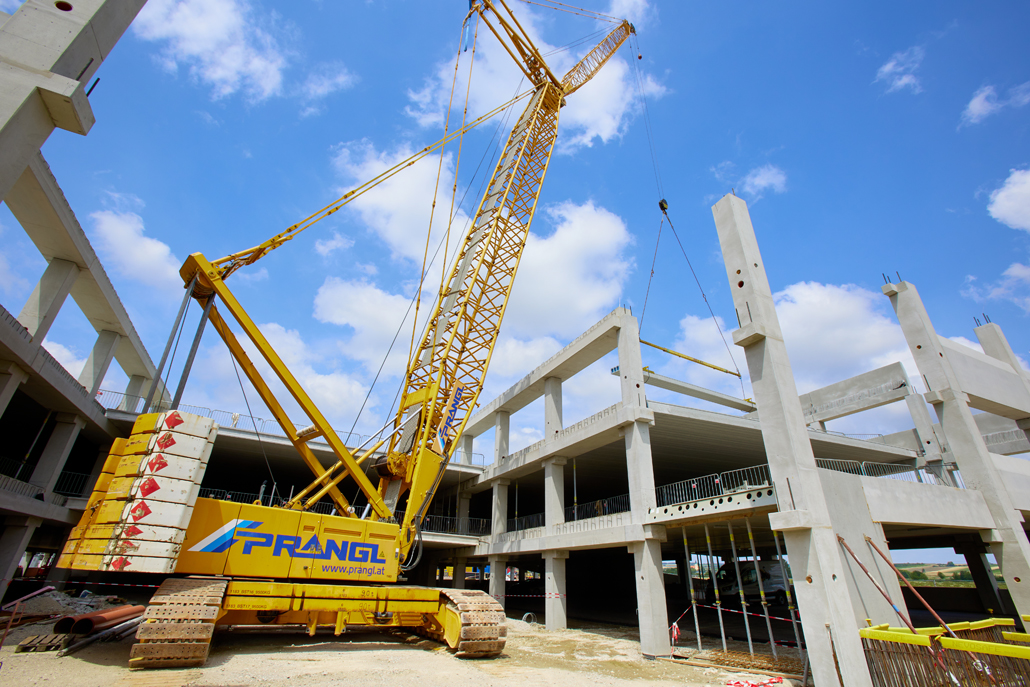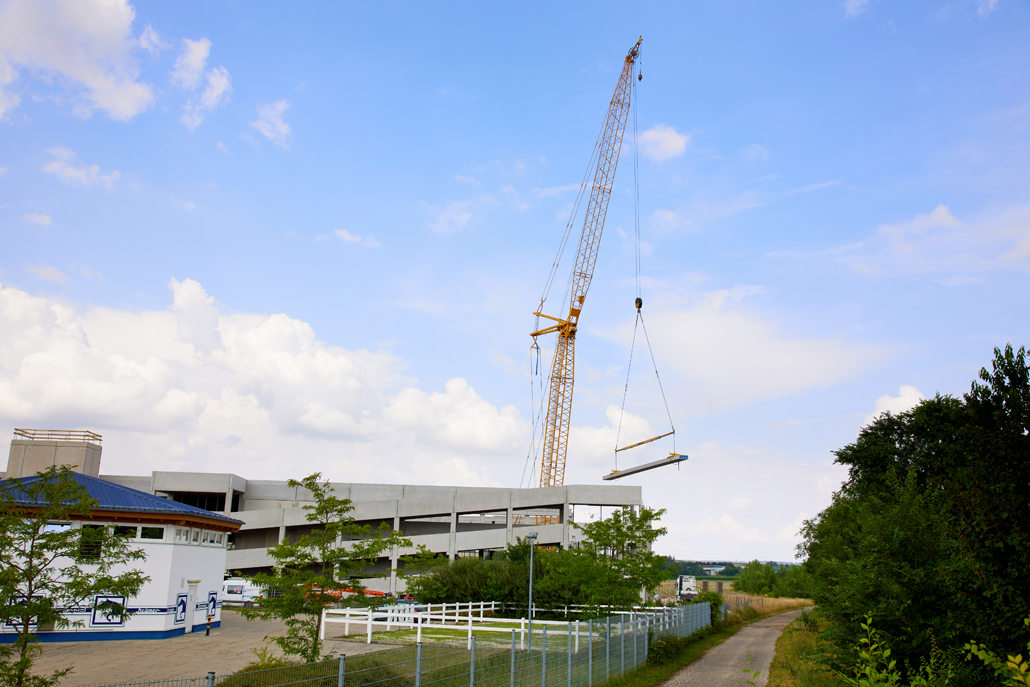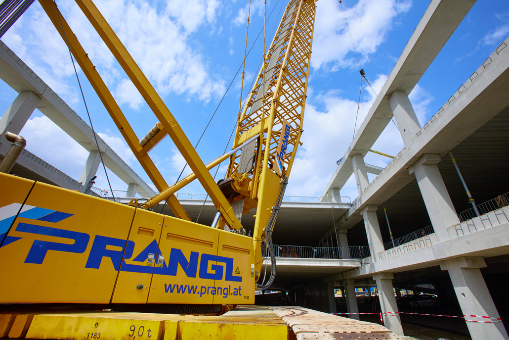 Prangl was commissioned for an interesting building project in the north of Vienna: A new 14 metre high multi-storey car park was added to the Amazon logistics centre in Großebersdorf. The crane work had to be performed as efficiently and quickly as possible. Planning the processes was the greatest challenge.