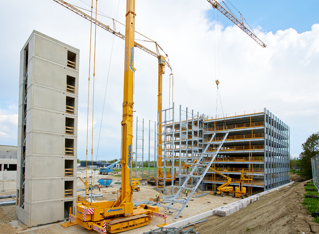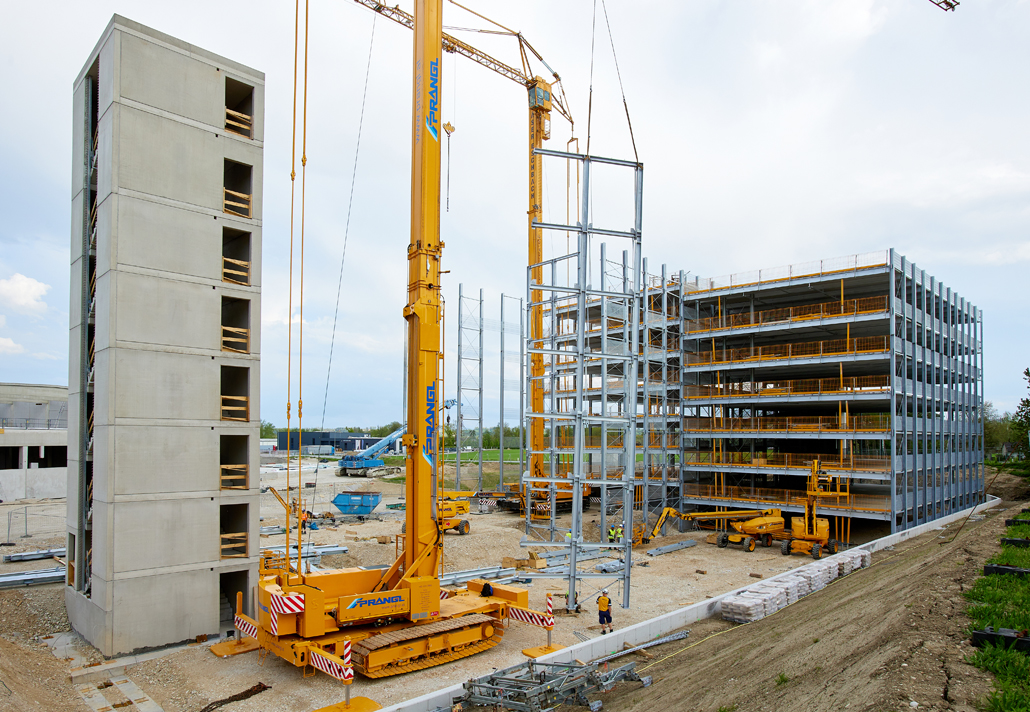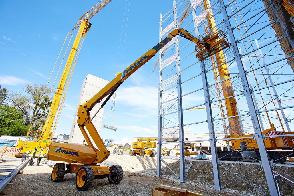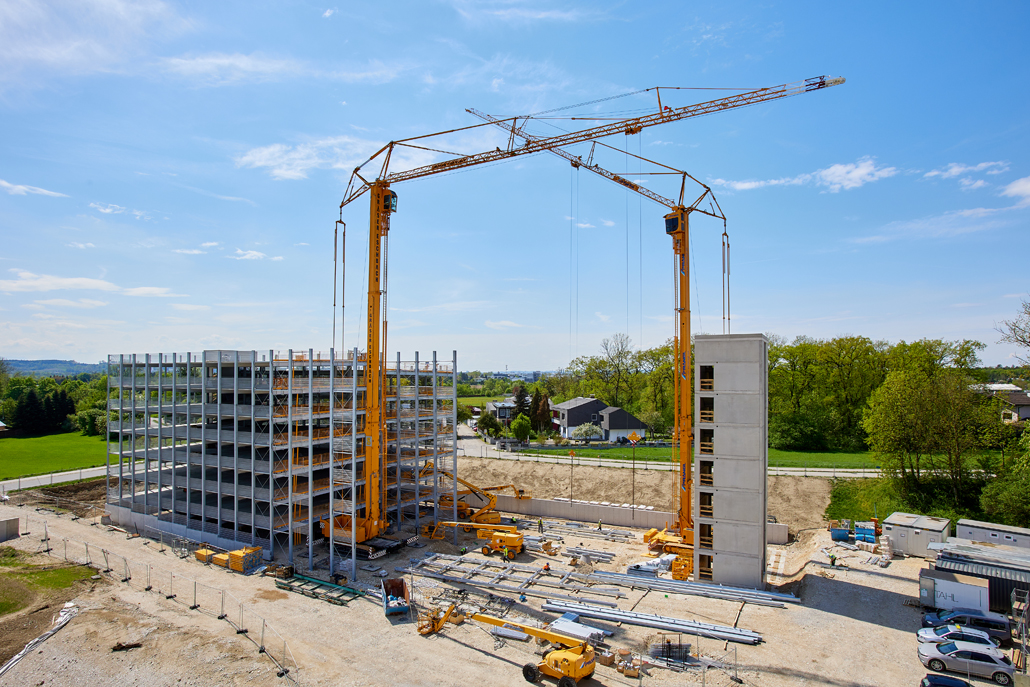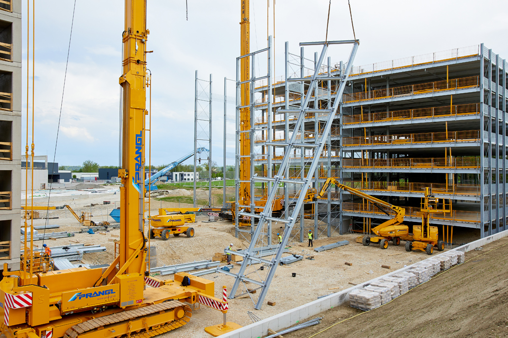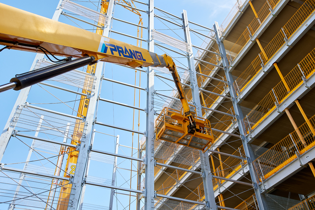 Building a modern multi-storey car park measuring 75 metres in length, 33 metres in width and 21 metres in height is no small undertaking. Especially when you bear in mind that its foundations consist of a total of 700 tonnes of steel and over 4,300 tonnes of concrete. Prangl was commissioned with the construction and devised a customised concept for all lifting and assembly work for the client.