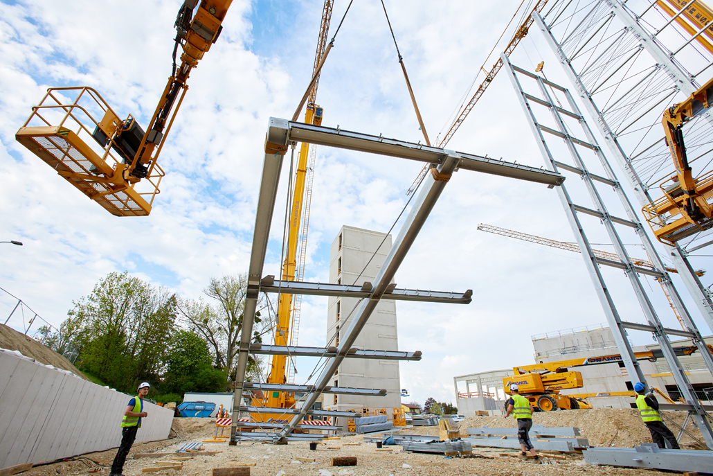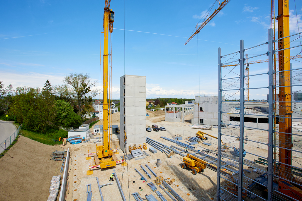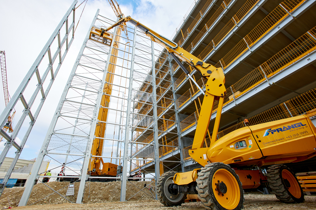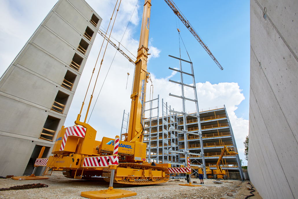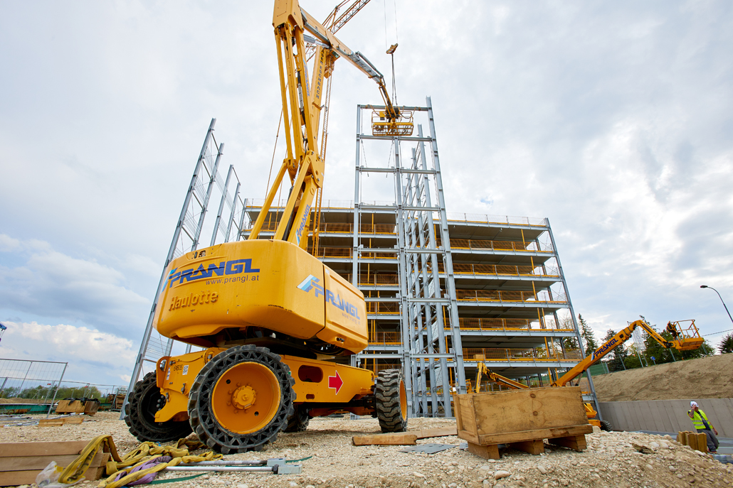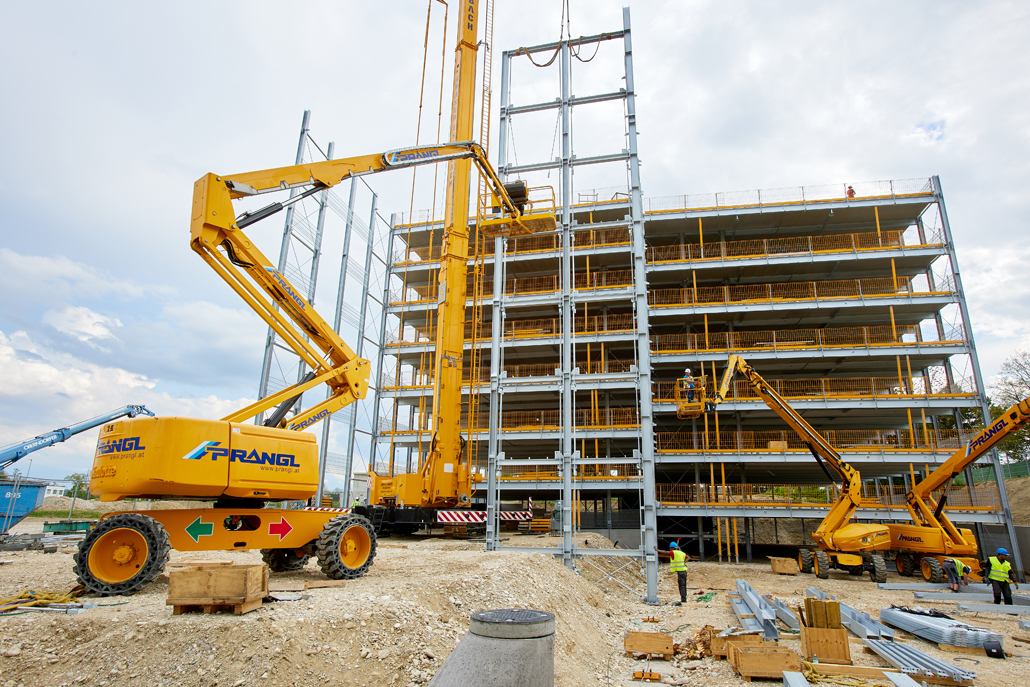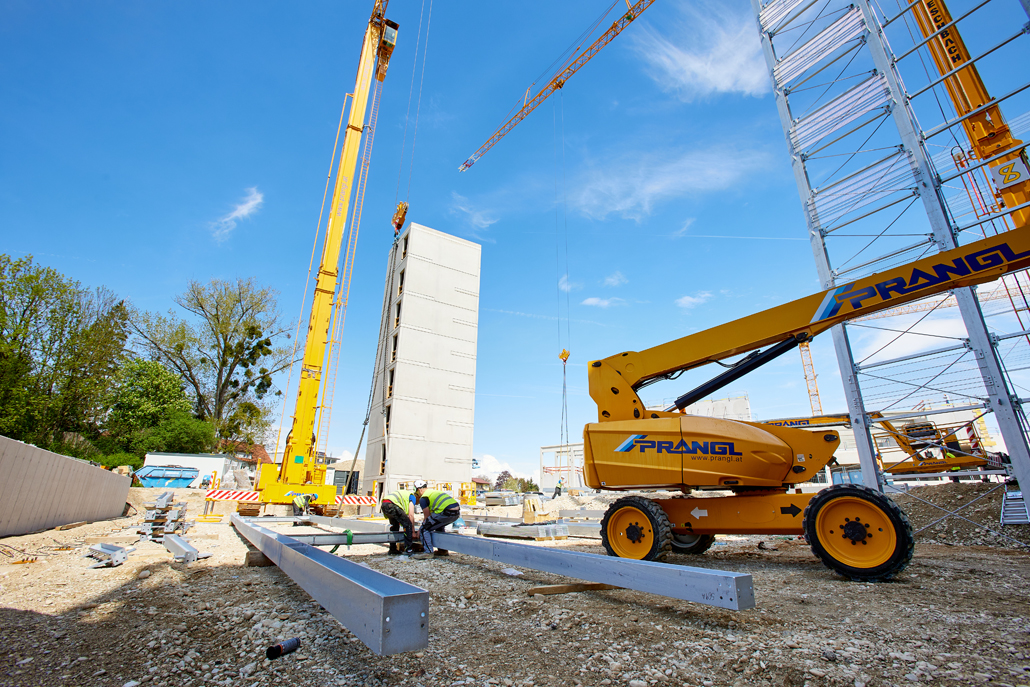 Building a modern multi-storey car park measuring 75 metres in length, 33 metres in width and 21 metres in height is no small undertaking. Especially when you bear in mind that its foundations consist of a total of 700 tonnes of steel and over 4,300 tonnes of concrete. Prangl was commissioned with the construction and devised a customised concept for all lifting and assembly work for the client.