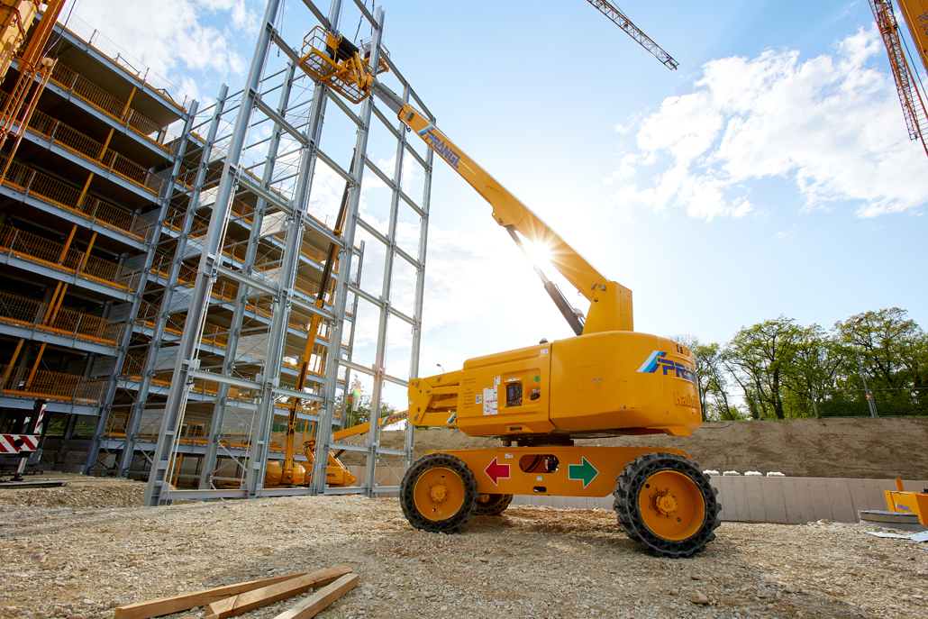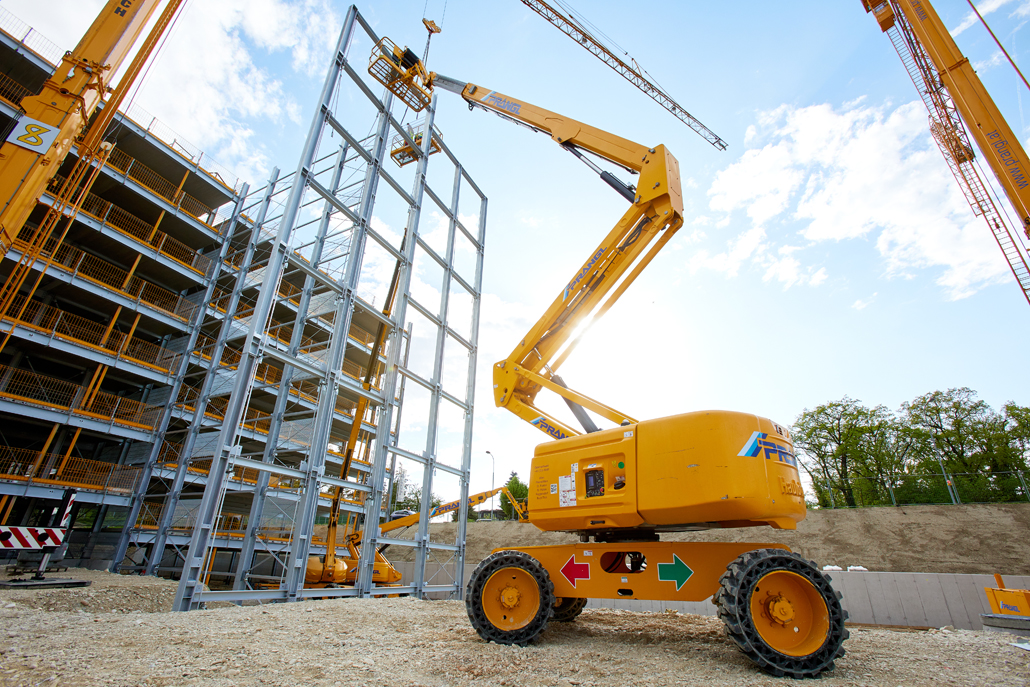 The additional aerial work platforms (telescopic boom lifts with a reach of 28 metres, scissor lifts with a working height of 6 metres), a telehandler (2.5 tonne load capacity and 6 metre telescopic length) and an articulating boom lift provided ideal support for the large crane. This meant that the telescopic boom lifts were used for assembly work at height, e.g. for attaching façade elements or installing building services components. The scissor lifts were used for activities at low heights, such as laying cables or installation work on ceilings. The small, lightweight scissor lifts impressed with their compactness and manoeuvrability on the intermediate floors.