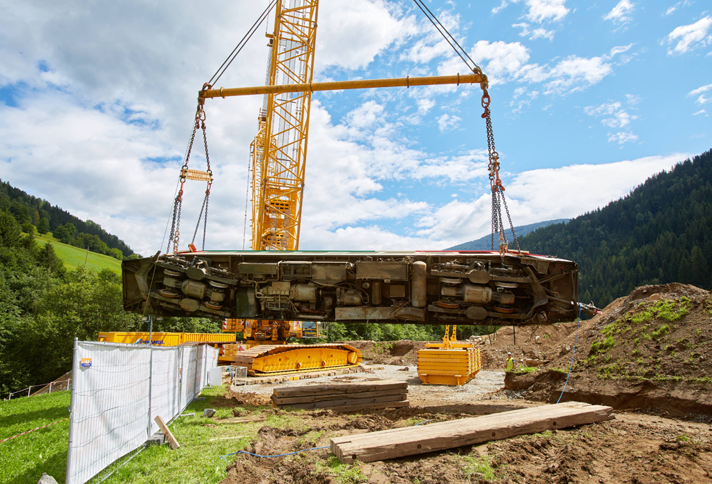 On 09.07.2021, a railcar of the Murtalbahn derailed and fell into the River Mur between Styria and Salzburg. Due to the local conditions, it quickly became clear that this would be no ordinary crane operation. Some preparatory work had to be done for the large crane: An access road about 90 metres long had to be established. In order to be able to place the yellow giant safely, an area of about 600 square metres had to be filled in. As if that were not enough, unique lifting equipment also had to be made.