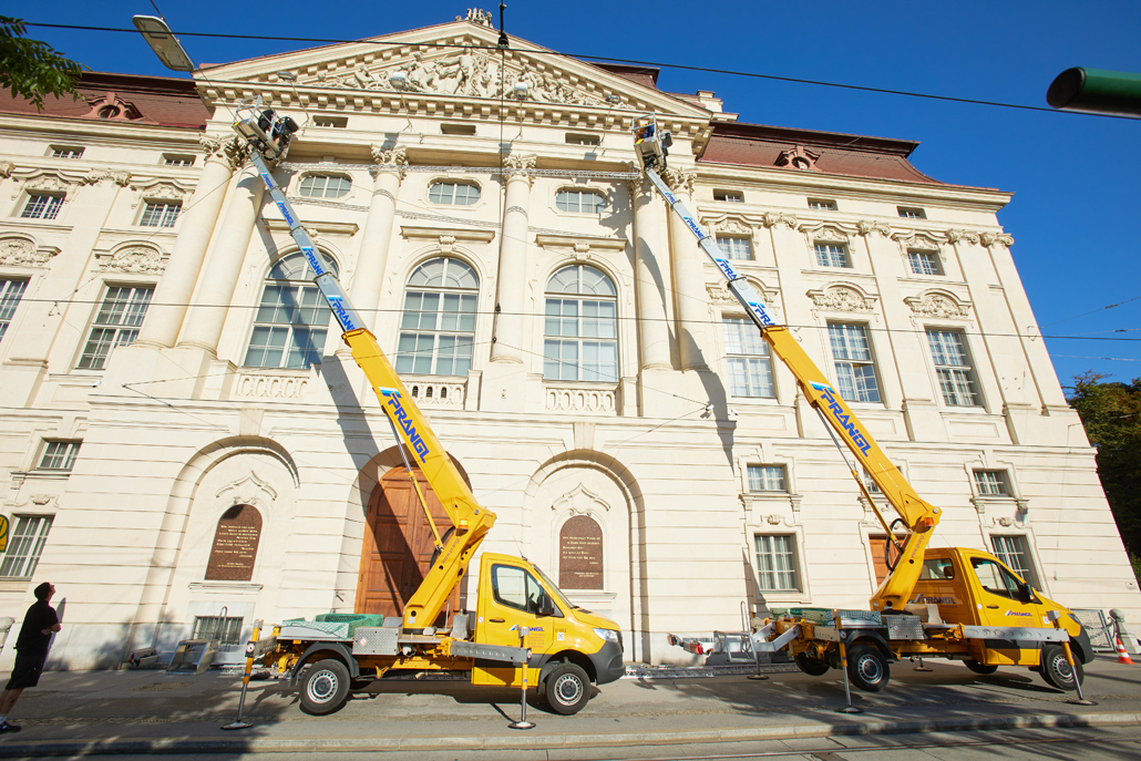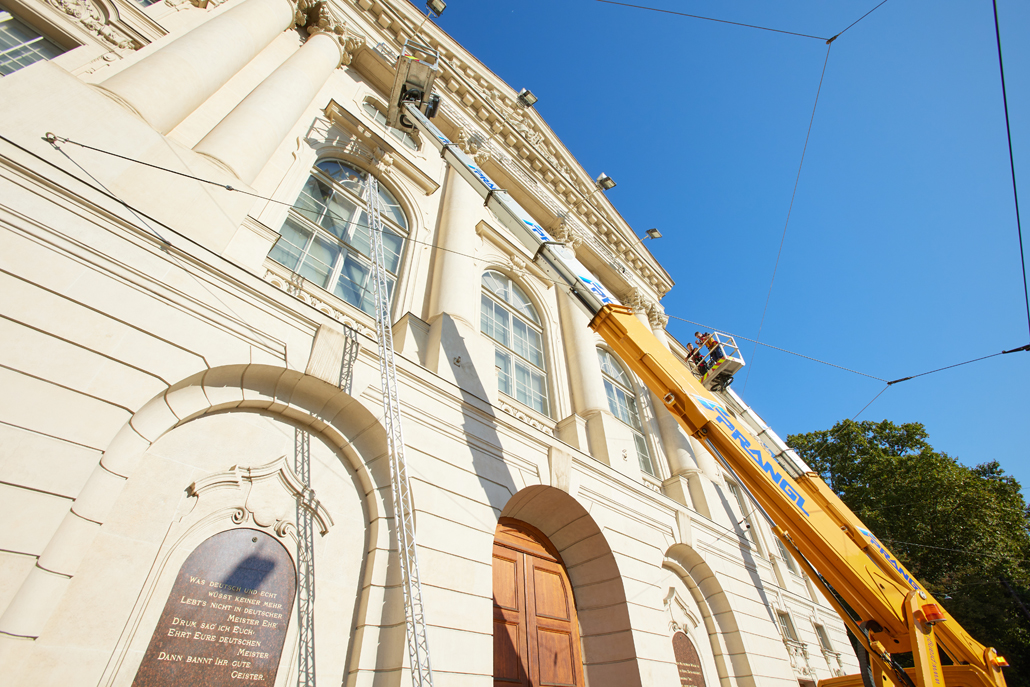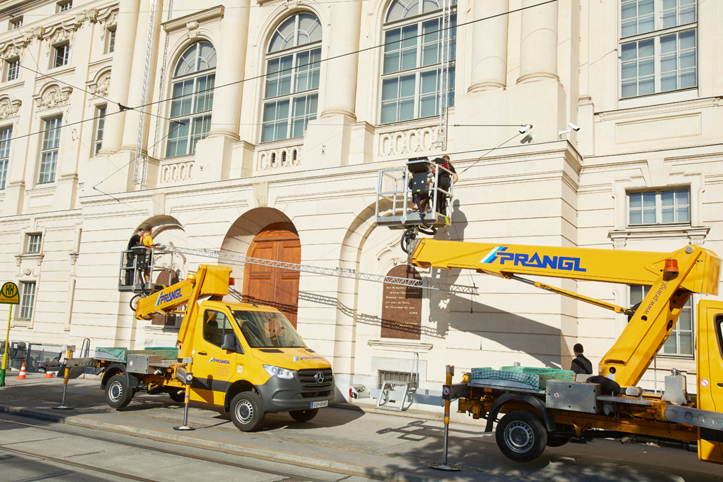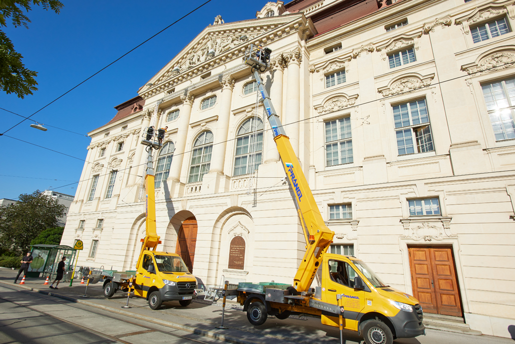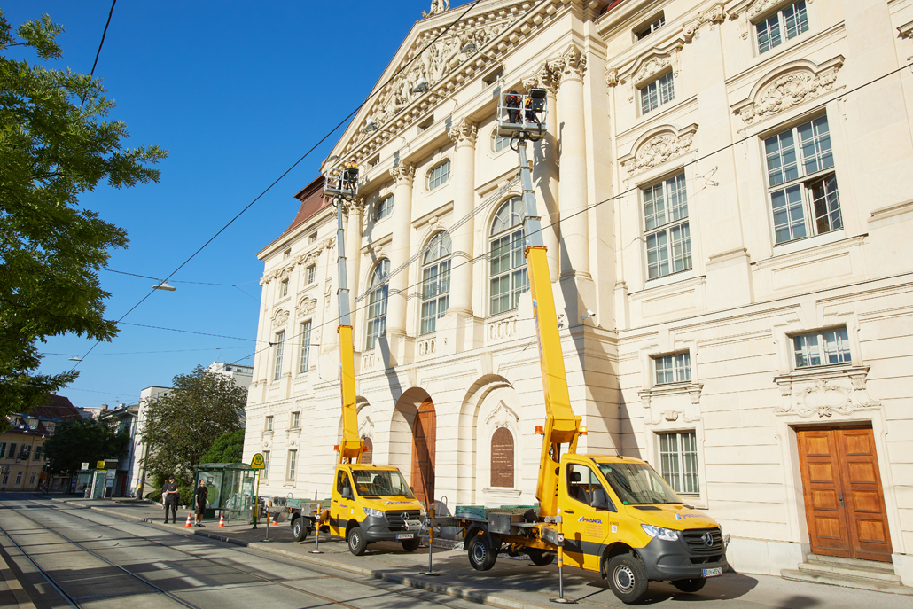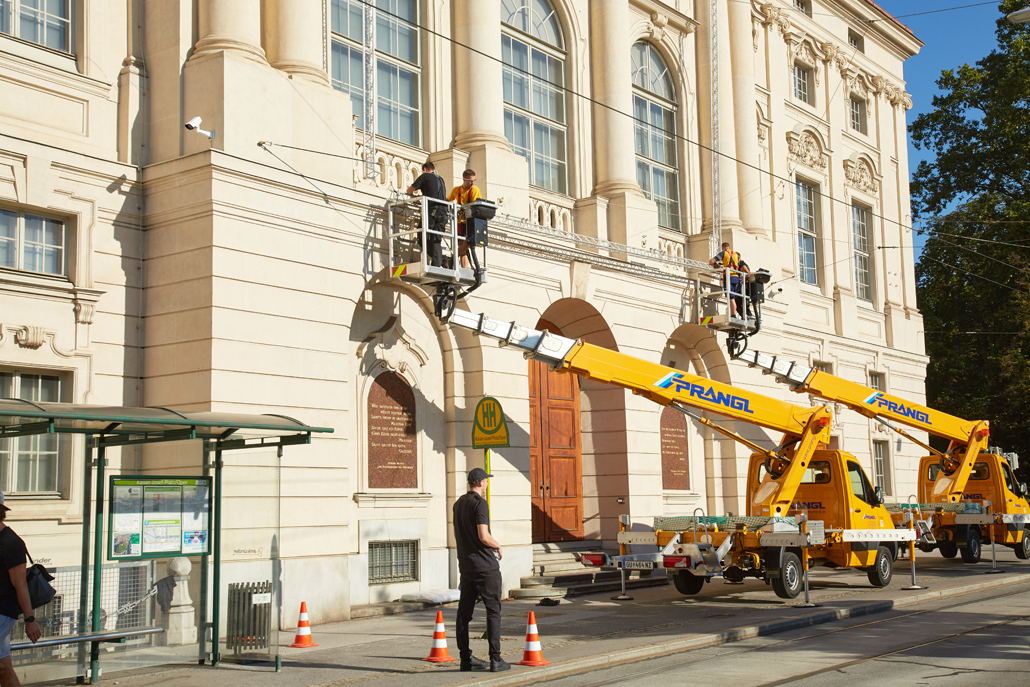 The Prangl employees positioned two truck-mounted work platforms on the narrow pavement directly adjacent to a tram stop. The aerial work platforms used here had a maximum working height of 27.60 metres, a load capacity of 230 kilograms and a horizontal reach of 17.00 metres, making them ideal for this task. Opera staff were assigned to “divert” passers-by from the danger zone. One fitter took a space in each work basket to first fit the four fastening rails at the specified points.