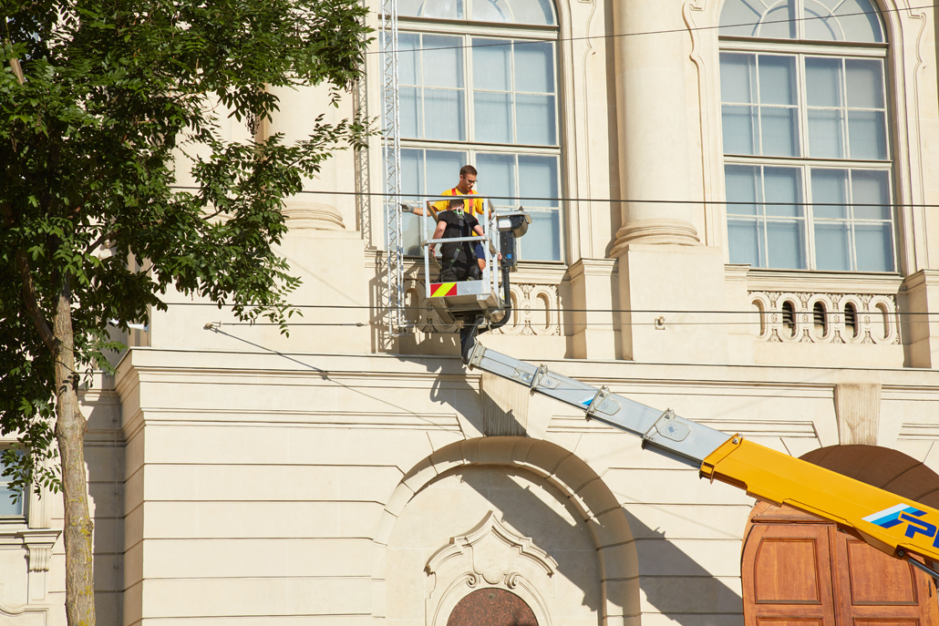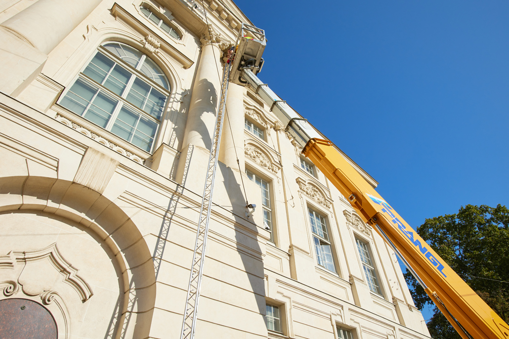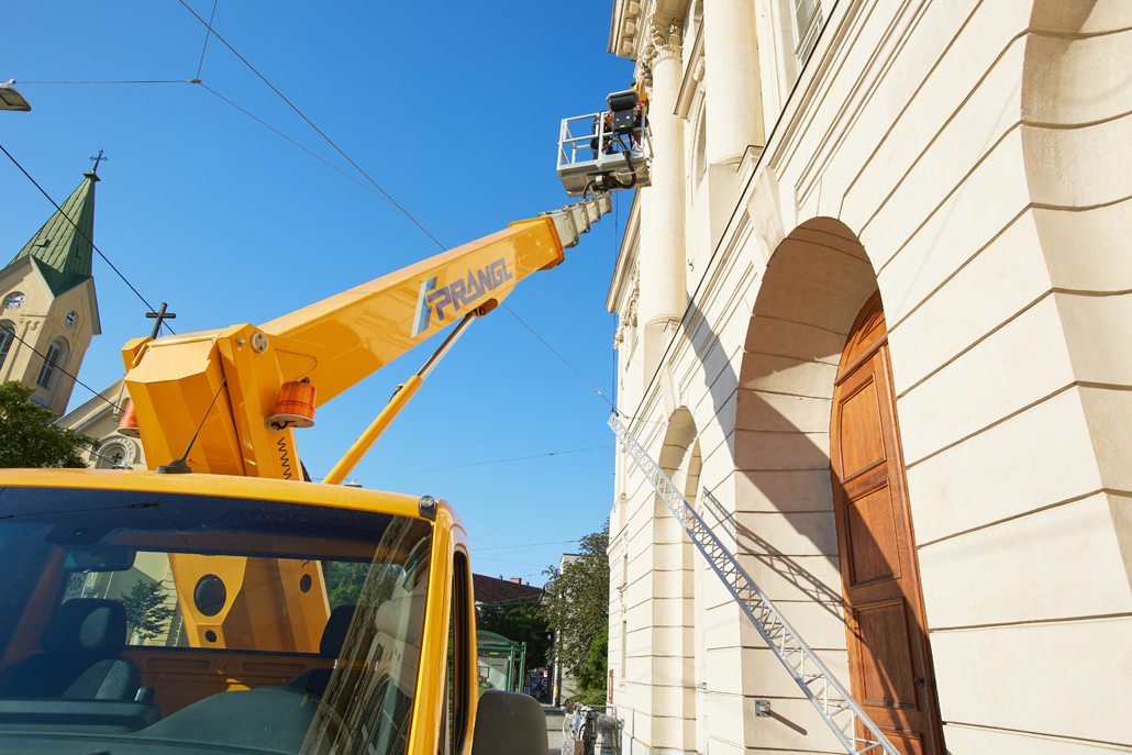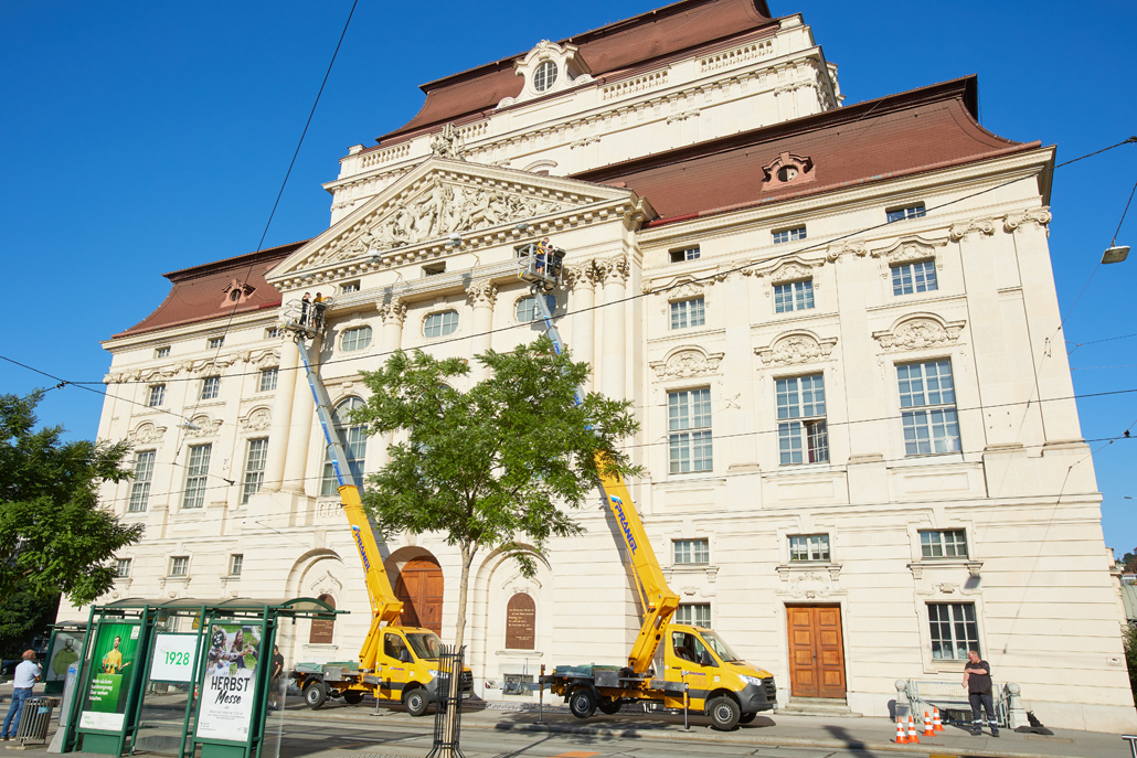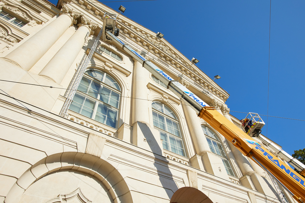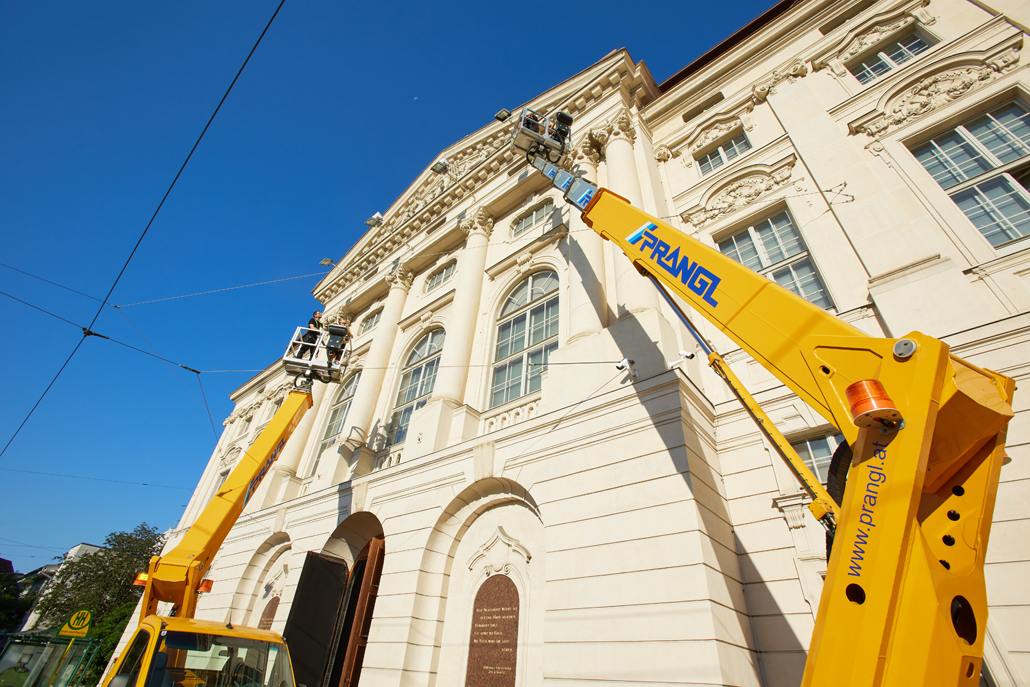 The Prangl employees positioned two truck-mounted work platforms on the narrow pavement directly adjacent to a tram stop. The aerial work platforms used here had a maximum working height of 27.60 metres, a load capacity of 230 kilograms and a horizontal reach of 17.00 metres, making them ideal for this task. Opera staff were assigned to “divert” passers-by from the danger zone. One fitter took a space in each work basket to first fit the four fastening rails at the specified points.