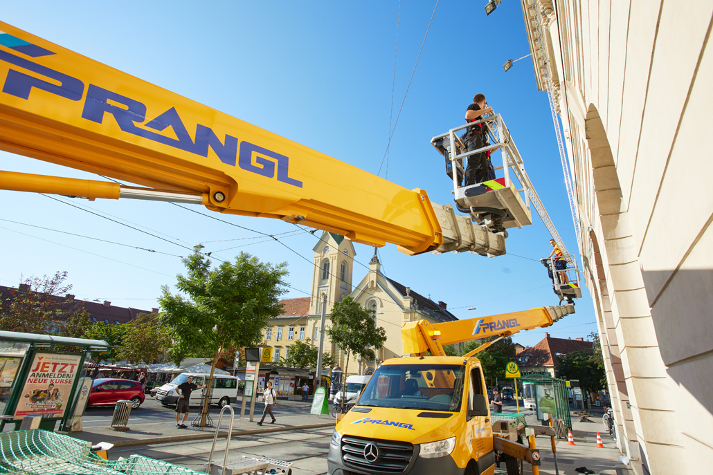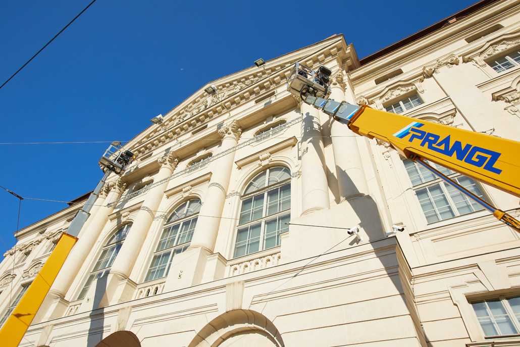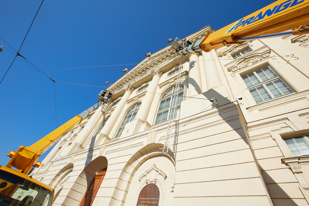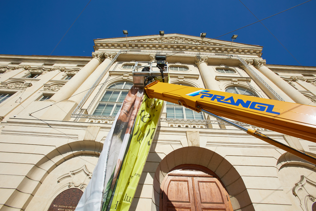 The Opera in Graz - the second largest opera house in Austria after the Vienna State Opera - celebrates the opening of the new art season every year at the beginning of autumn. On the occasion of this event, a banner measuring 11 x 9 metres was to be fitted on the façade on the side of Kaiser-Josef-Platz. In this project, it was not the weight that was important, but the size of the object to be assembled, the limited space and, above all, the numerous overhead lines and tensioning. The latter were responsible for ensuring that the units were also operated by Prangl professionals.