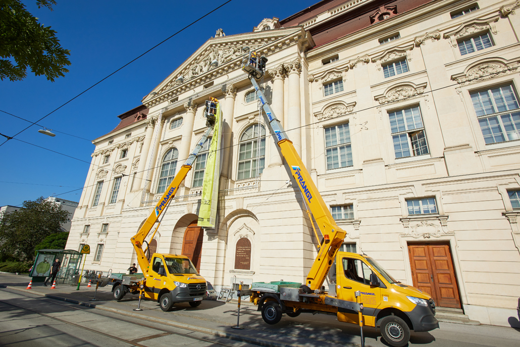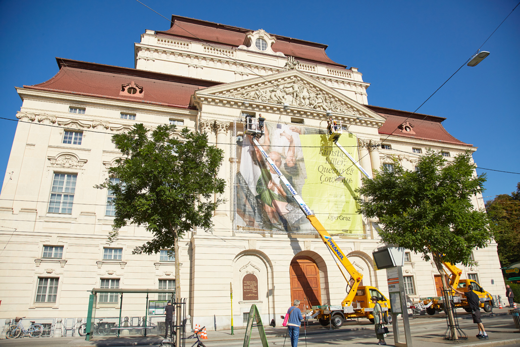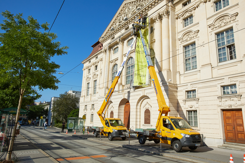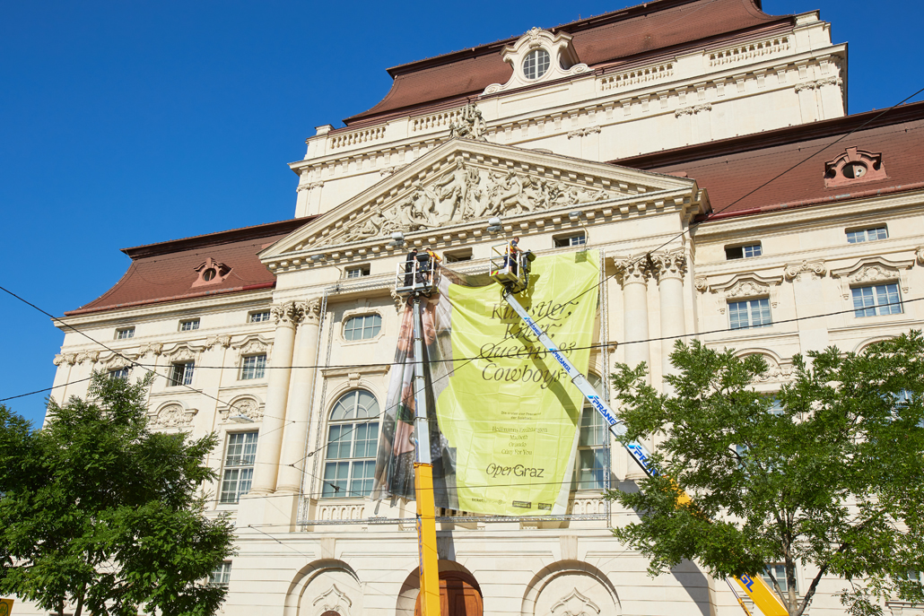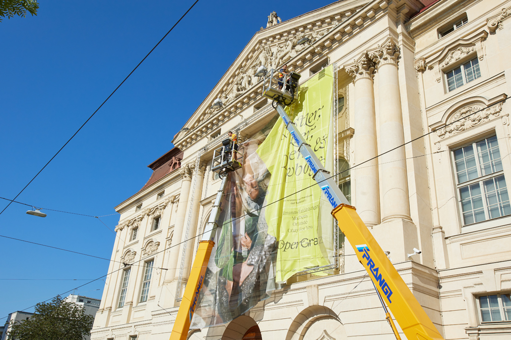 Clearly a case for Prangl: The fitting of a huge advertising banner on Graz Opera House was intended to attract the public's attention and draw attention to the 2023/2024 art season opening. But because of the location in the middle of the city and the associated limited freedom of movement, the project required a well thought-out concept.