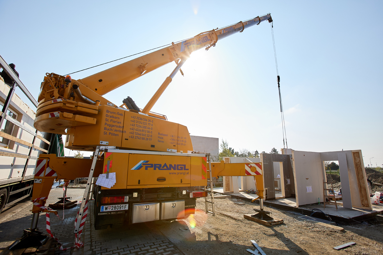 Right from the outset, it was clear that the Prangl team was not dealing with a case of standard assembly. Furthermore, it was initially necessary to complete faultless preparations for this particularly elaborate house - to ensure the tight schedule could be adhered to. All HGV deliveries had to be ready in the right sequence and the fitters had to have everything prepared. The erection process followed a previously devised timeline that everyone was required to observe. Prangl's experts selected a 35-tonne truck-mounted crane to erect the prefabricated exterior and interior walls, as well as the roof.