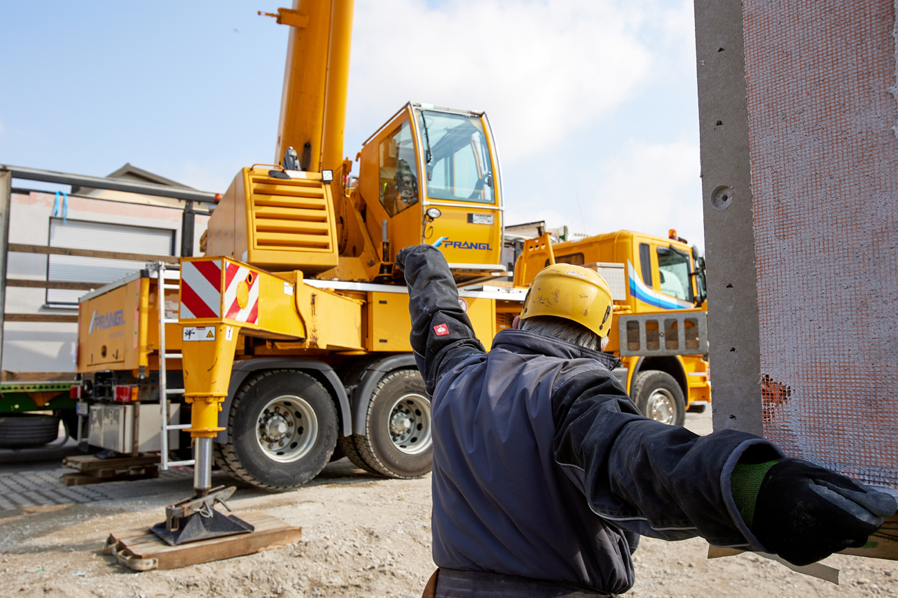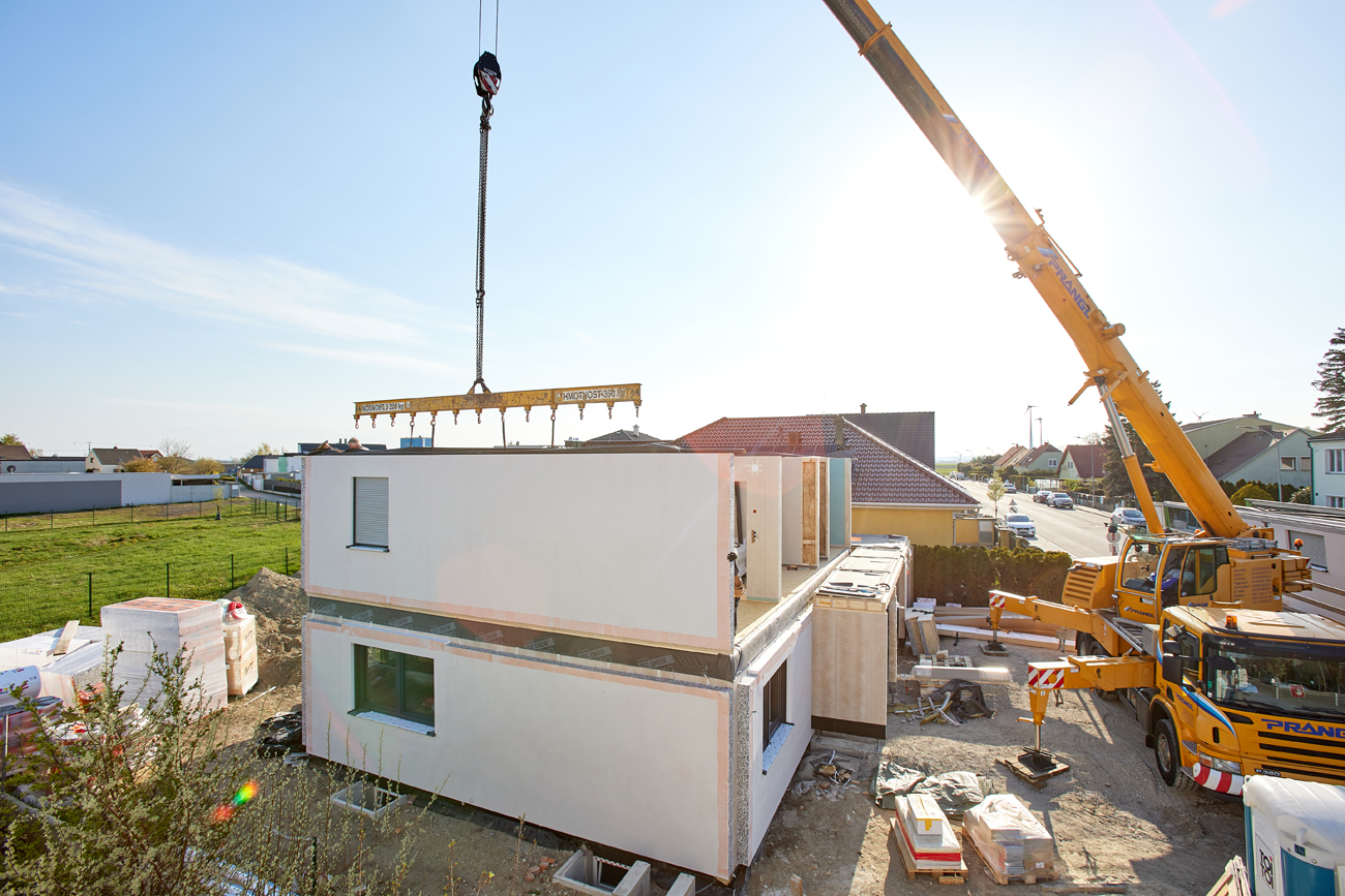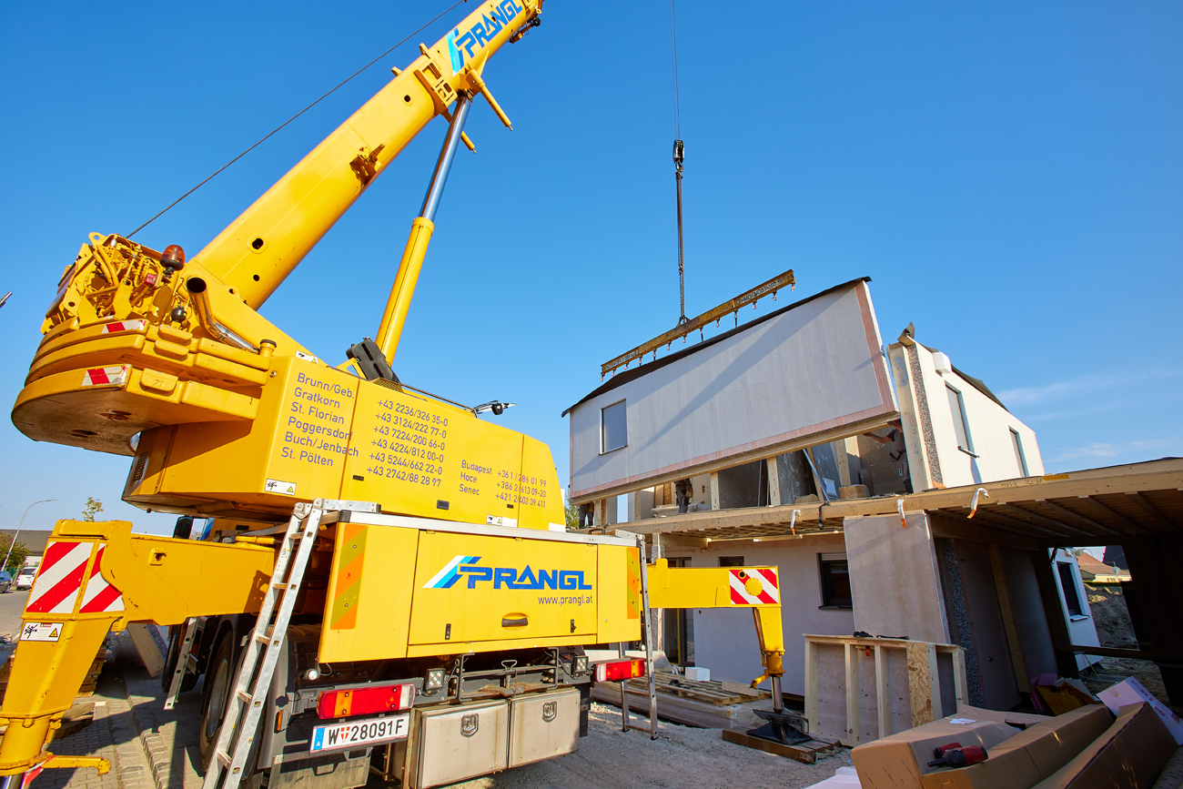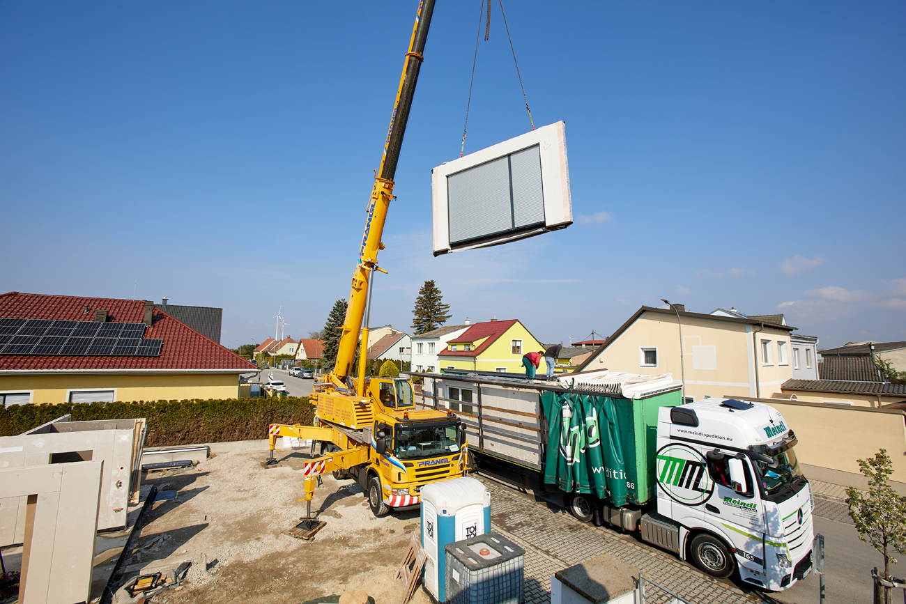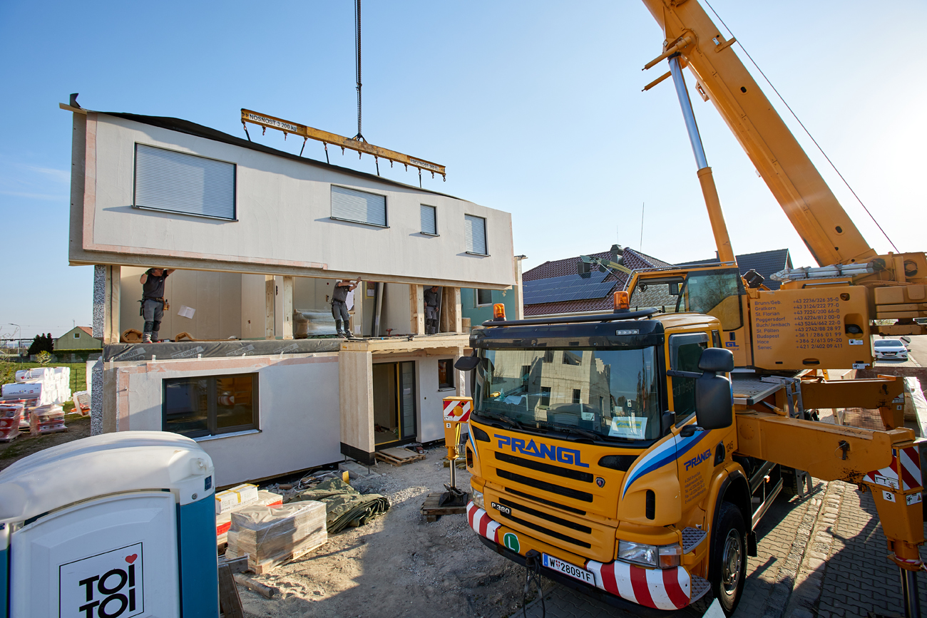 Thanks to impeccable cooperation between the crane driver, construction management and fitters, the house quickly rose up from its foundations without delay. And putting the roof on also went like clockwork. The vast experience of Prangl's prefabricated house specialists played a major role in the entire process. The client was impressed by the calmness, oversight and outstanding precision demonstrated by them when erecting the building components, while precise adherence to the time schedule was a matter of pride. And so the new home will soon be ready for its occupants.