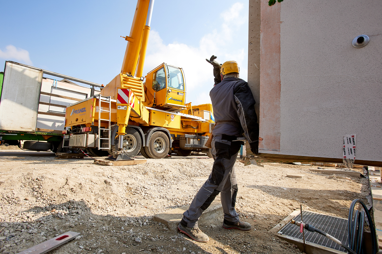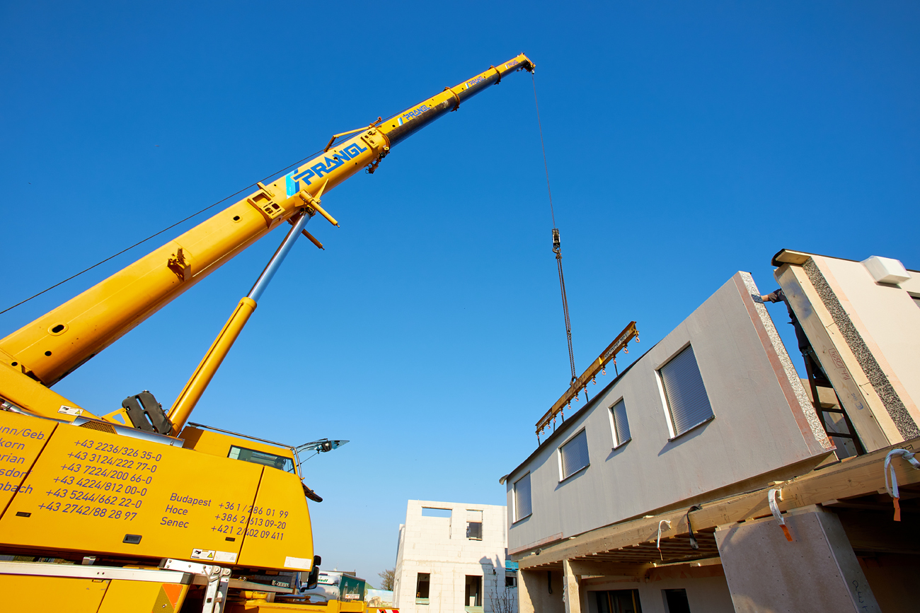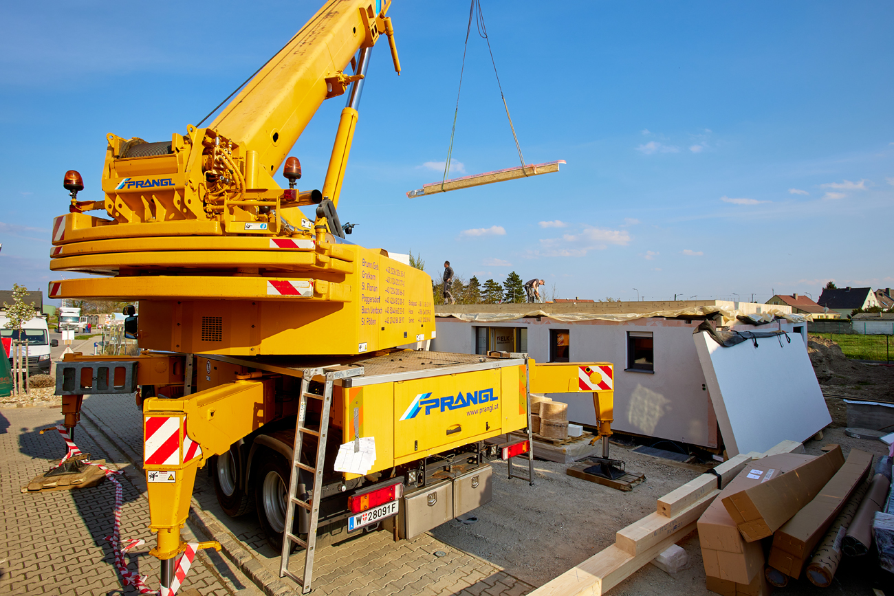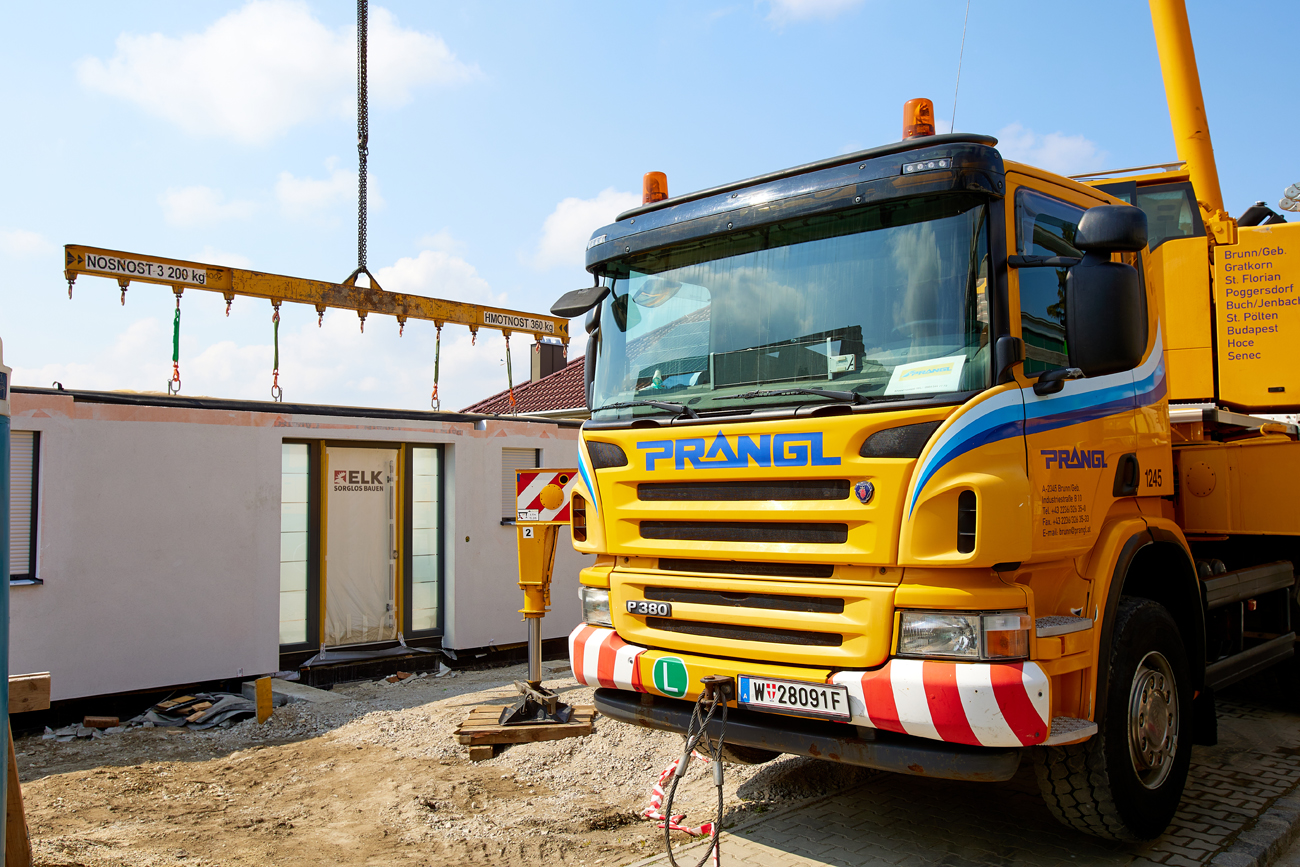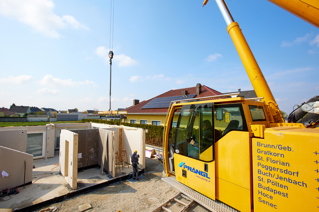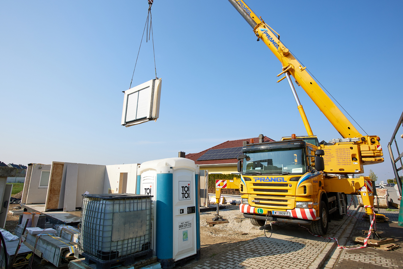 Thanks to impeccable cooperation between the crane driver, construction management and fitters, the house quickly rose up from its foundations without delay. And putting the roof on also went like clockwork. The vast experience of Prangl's prefabricated house specialists played a major role in the entire process. The client was impressed by the calmness, oversight and outstanding precision demonstrated by them when erecting the building components, while precise adherence to the time schedule was a matter of pride. And so the new home will soon be ready for its occupants.