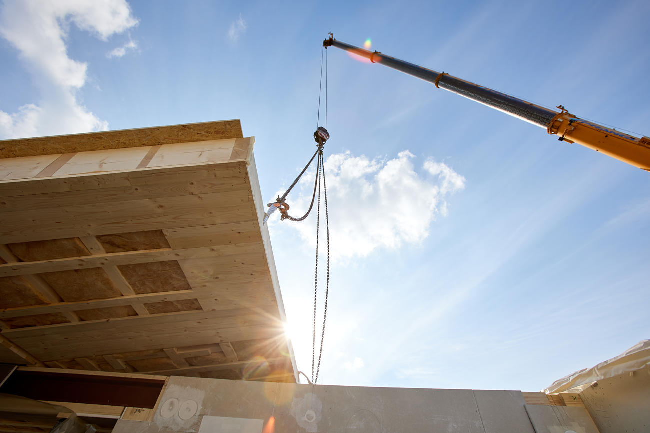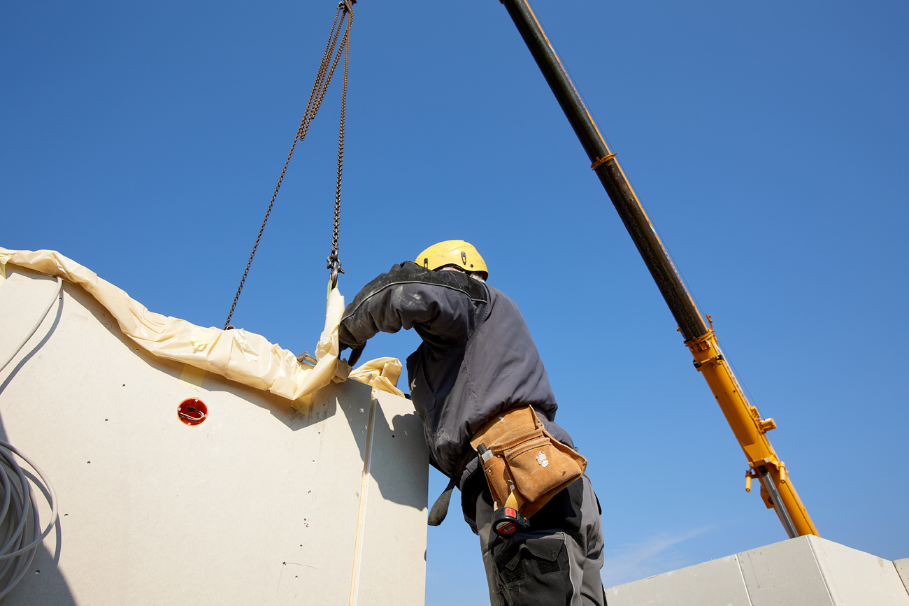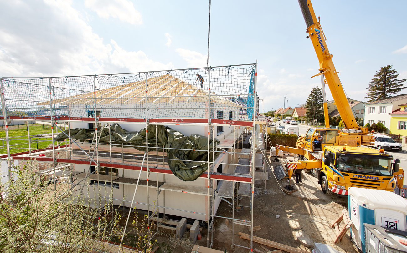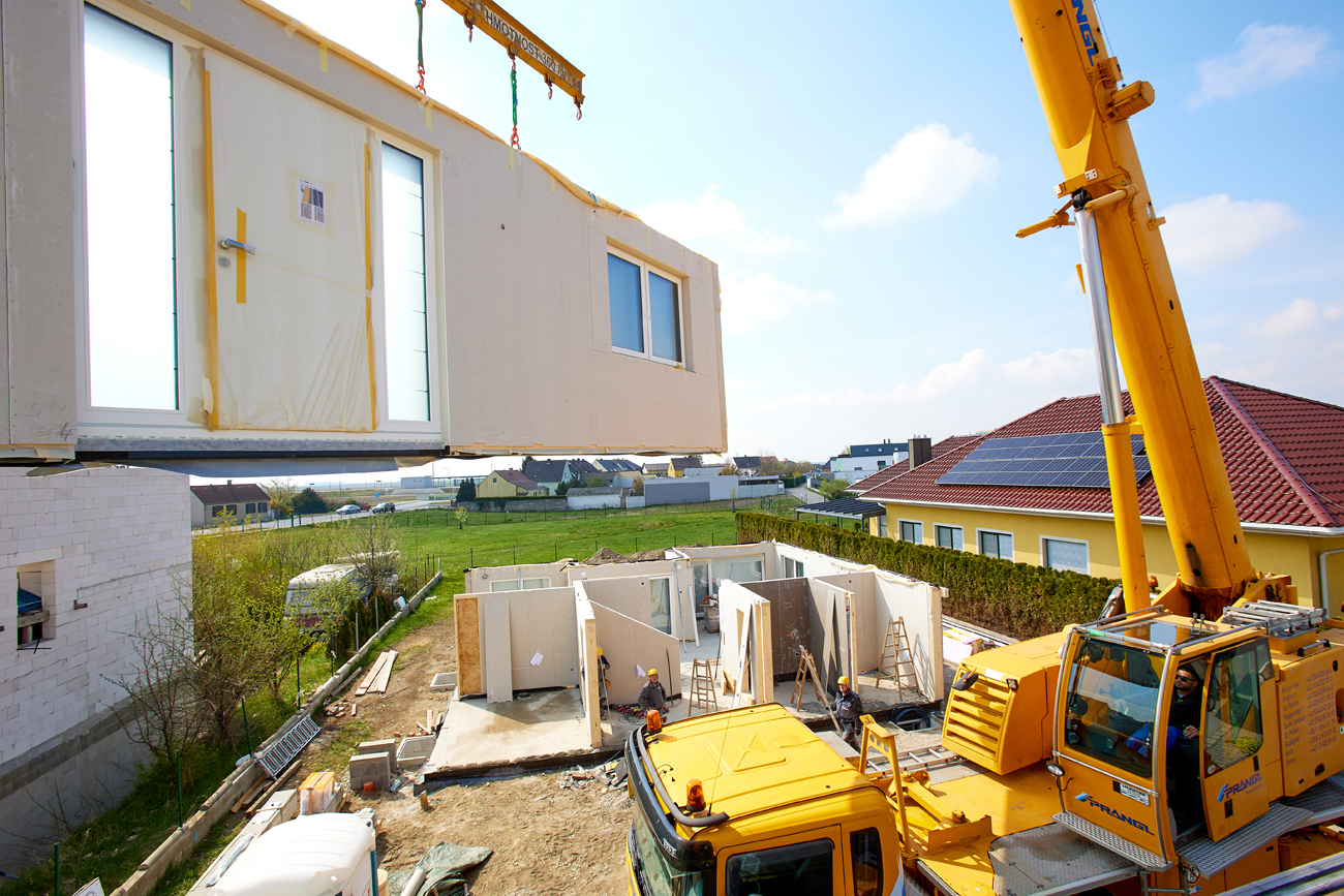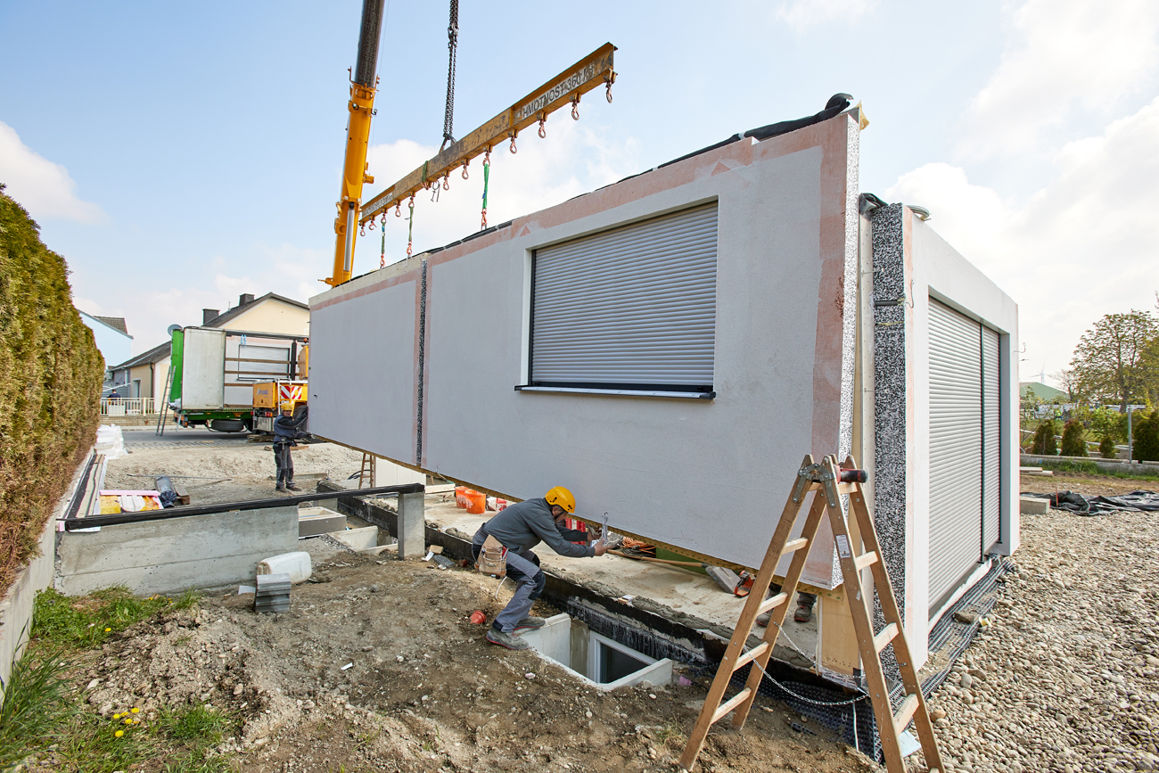 Thanks to impeccable cooperation between the crane driver, construction management and fitters, the house quickly rose up from its foundations without delay. And putting the roof on also went like clockwork. The vast experience of Prangl's prefabricated house specialists played a major role in the entire process. The client was impressed by the calmness, oversight and outstanding precision demonstrated by them when erecting the building components, while precise adherence to the time schedule was a matter of pride. And so the new home will soon be ready for its occupants.