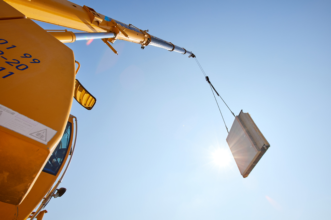 This crane delivers clear advantages when compared to other equipment: It is manoeuvrable and efficient - because it can readily travel to any construction site complete with its equipment. Once on site, it is ready for use right away. With the 30 metre main boom and a maximum system length of 45 metres, the crane is the optimum solution for erecting such a house. And erection of the new home was spot on: The prefabricated parts with individual weights of up to 3 tonnes were lifted into place unit-by-unit with a maximum boom projection of 16 metres, aligned and bolted into place by the fitters.