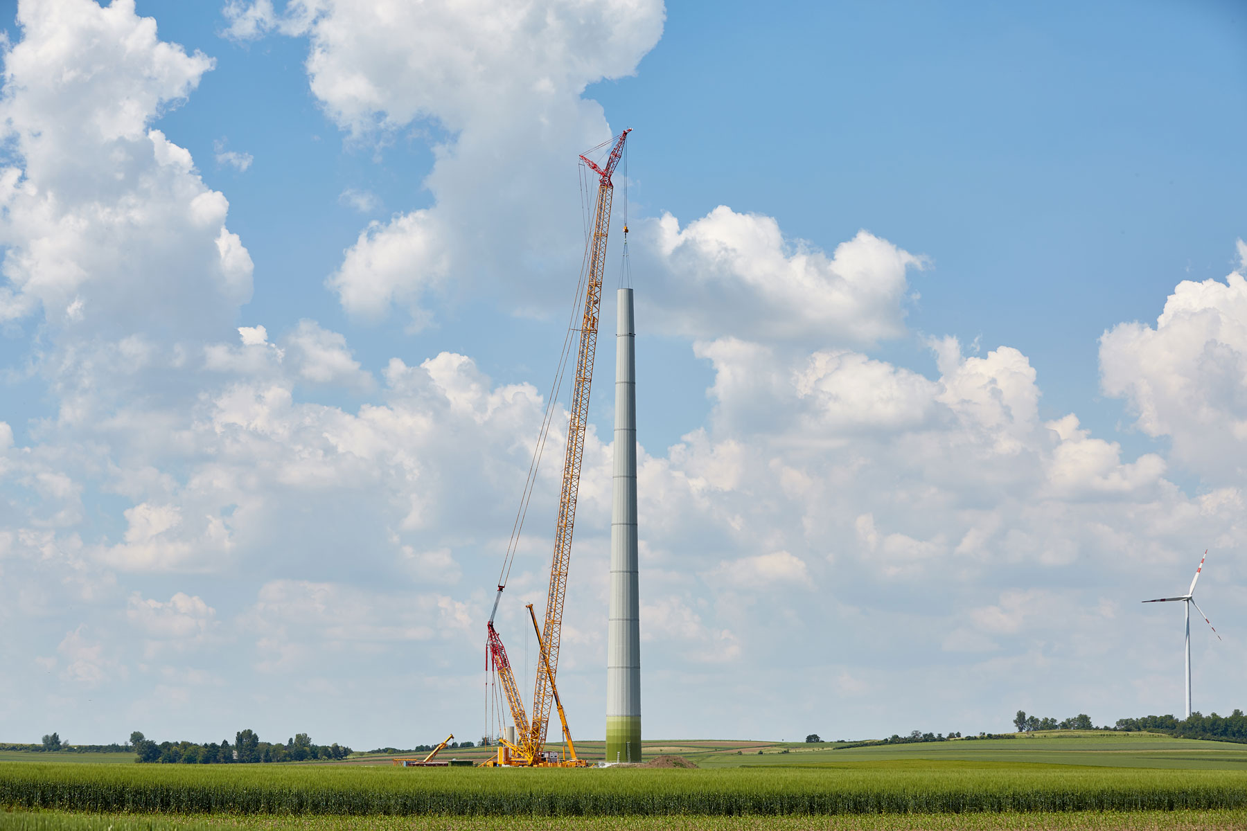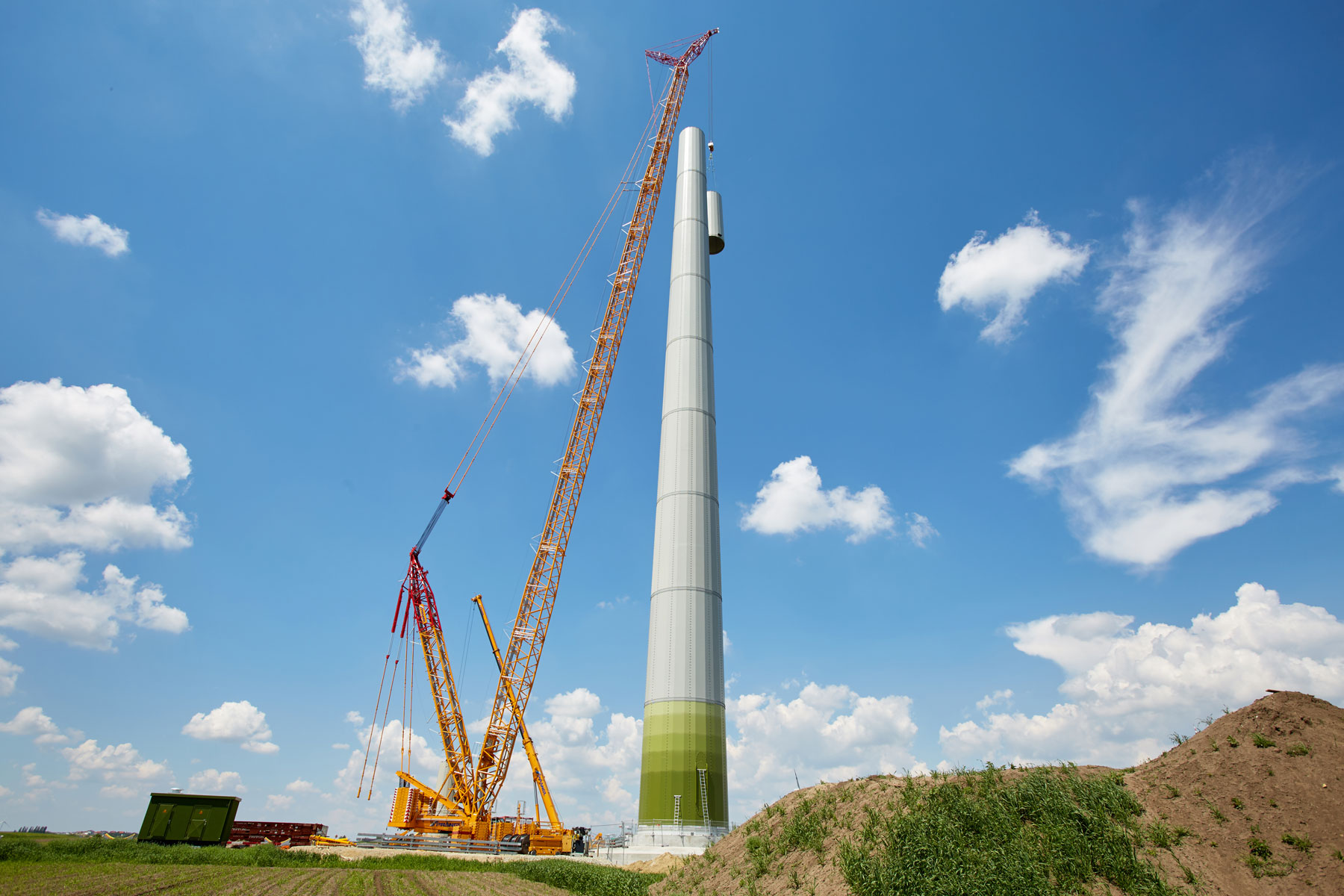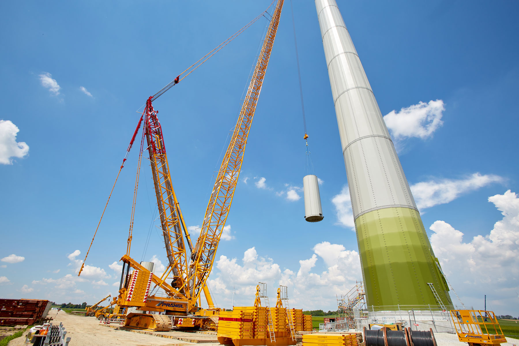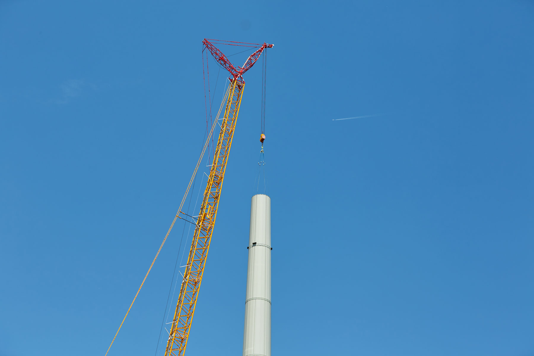 The wind energy plant was installed near to Scharndorf in Lower Austria on a modular steel tower with a hub height of 135 metres. For the main assembly process, it was necessary to use a “mobile” large crane. A 650 tonne crawler crane proved to be the right piece of equipment in the end. Due to the new system type and the required lashing gear, the main boom had to be set up higher than normal. In total, the entire crane system was 156 metres high and had a total weight of 950 tonnes.