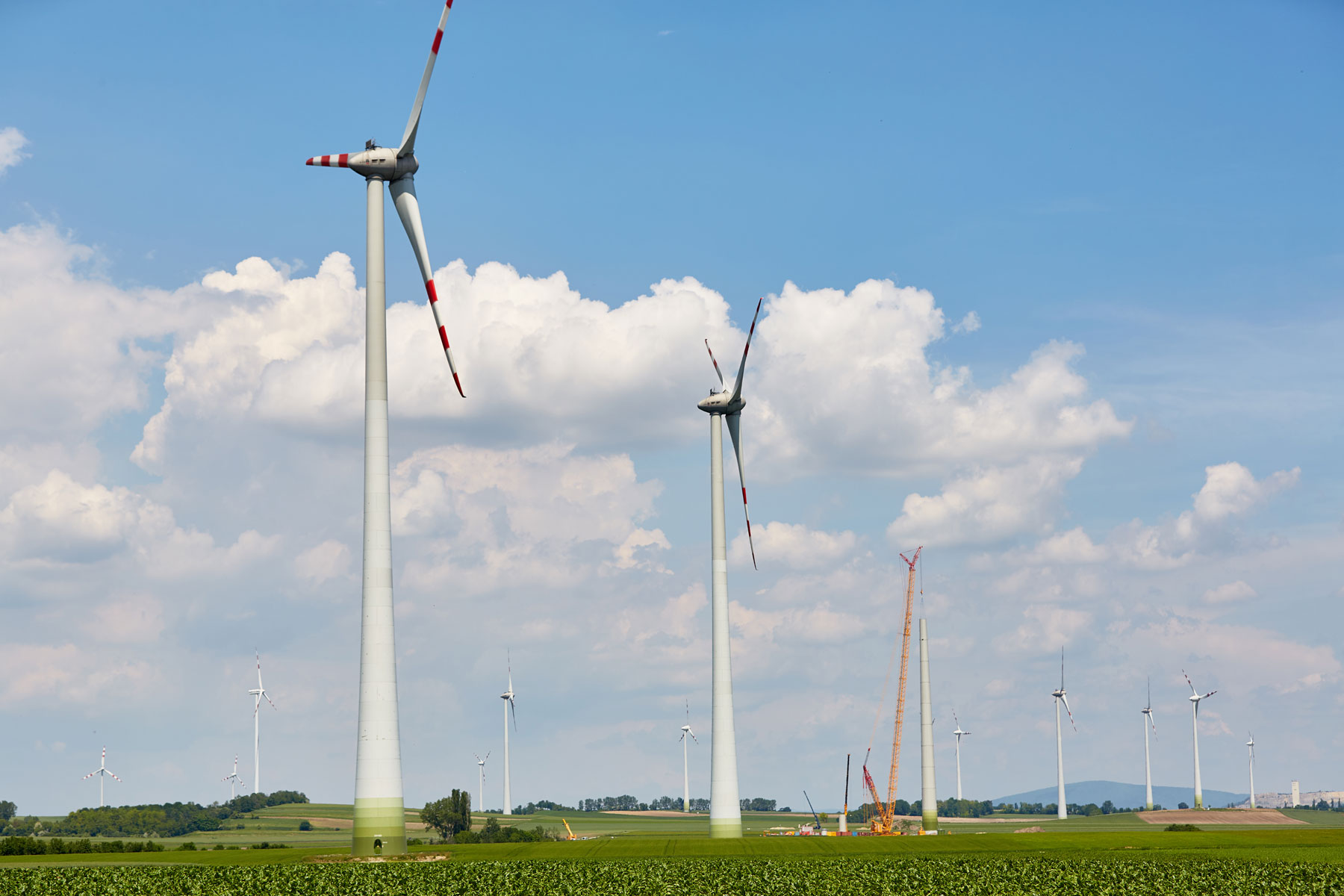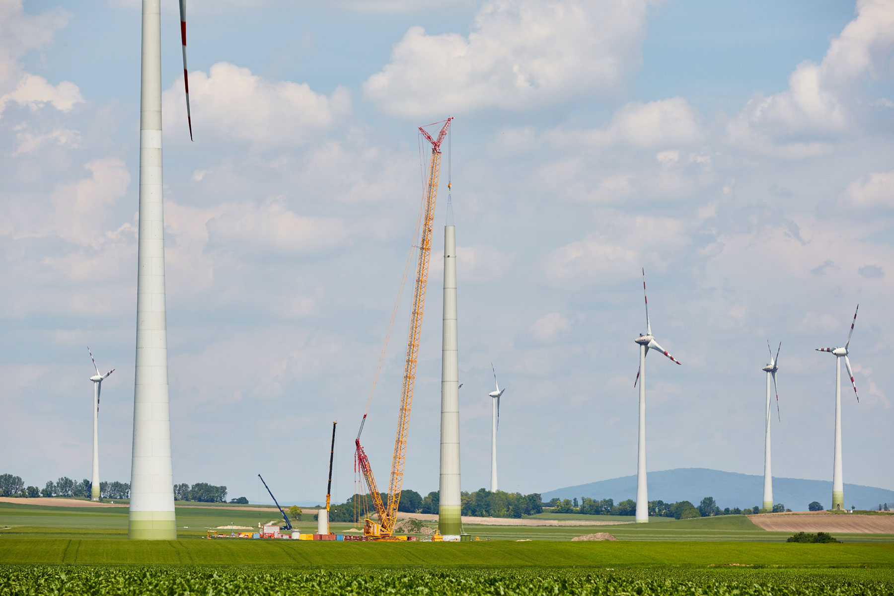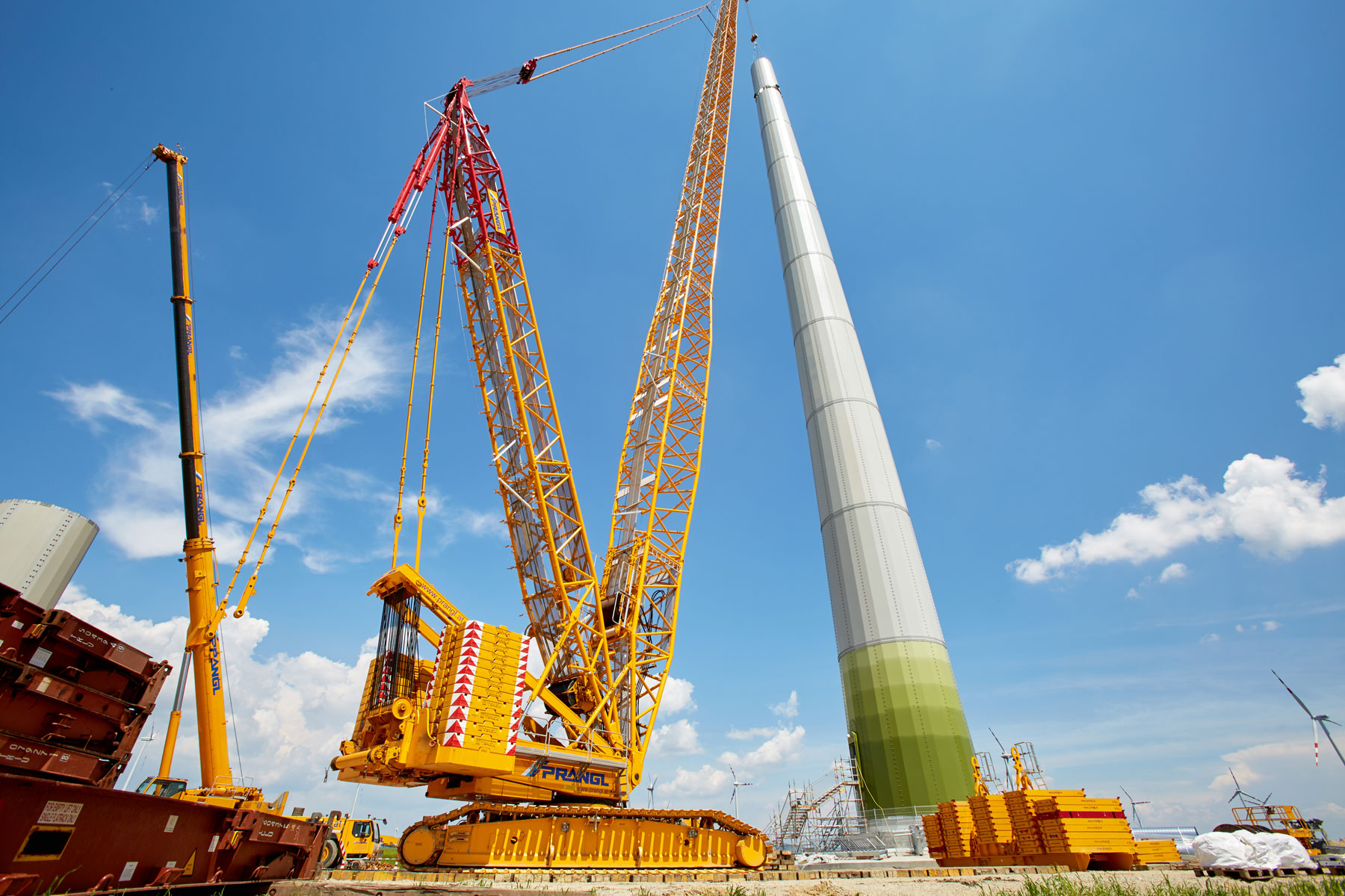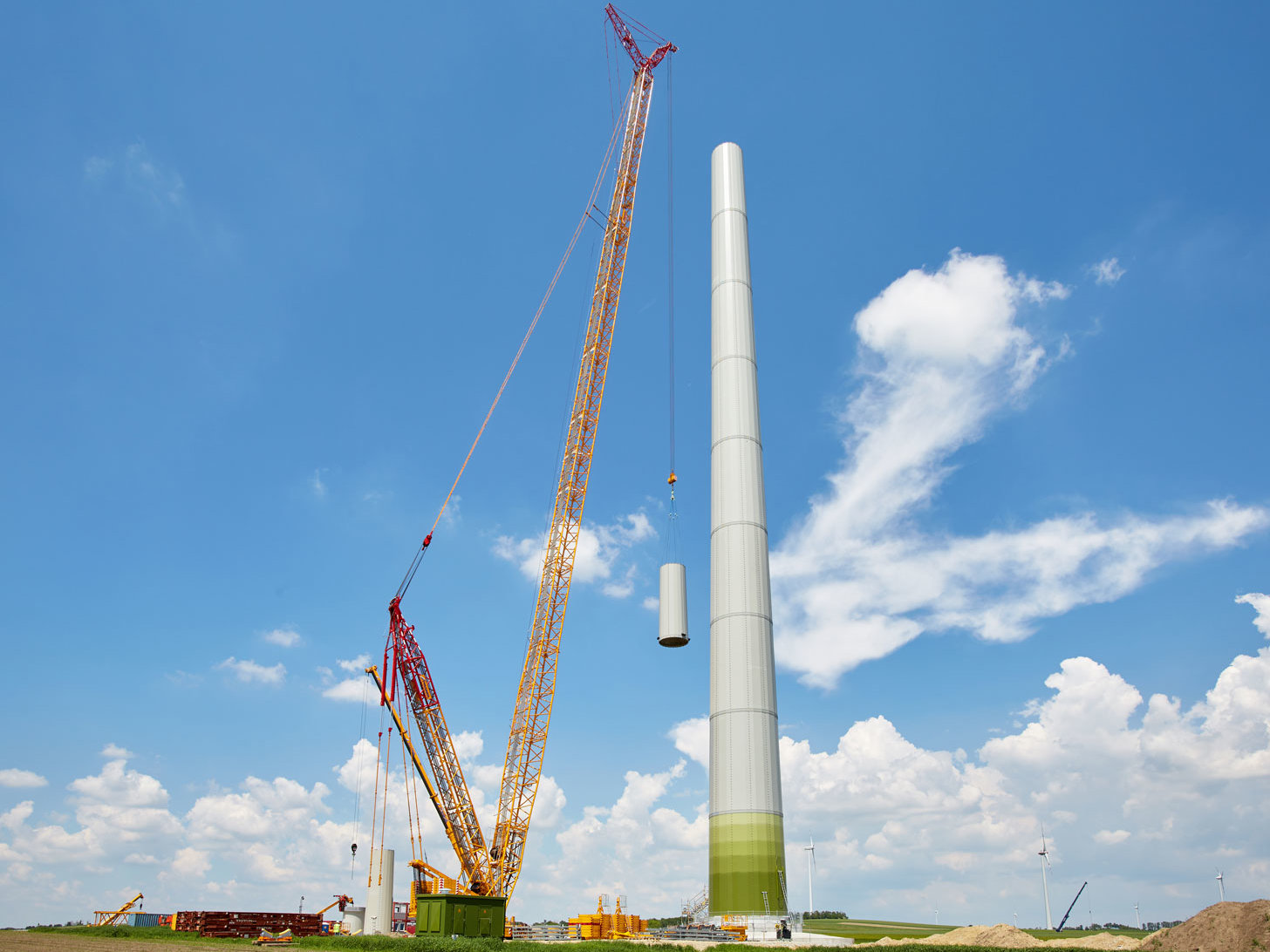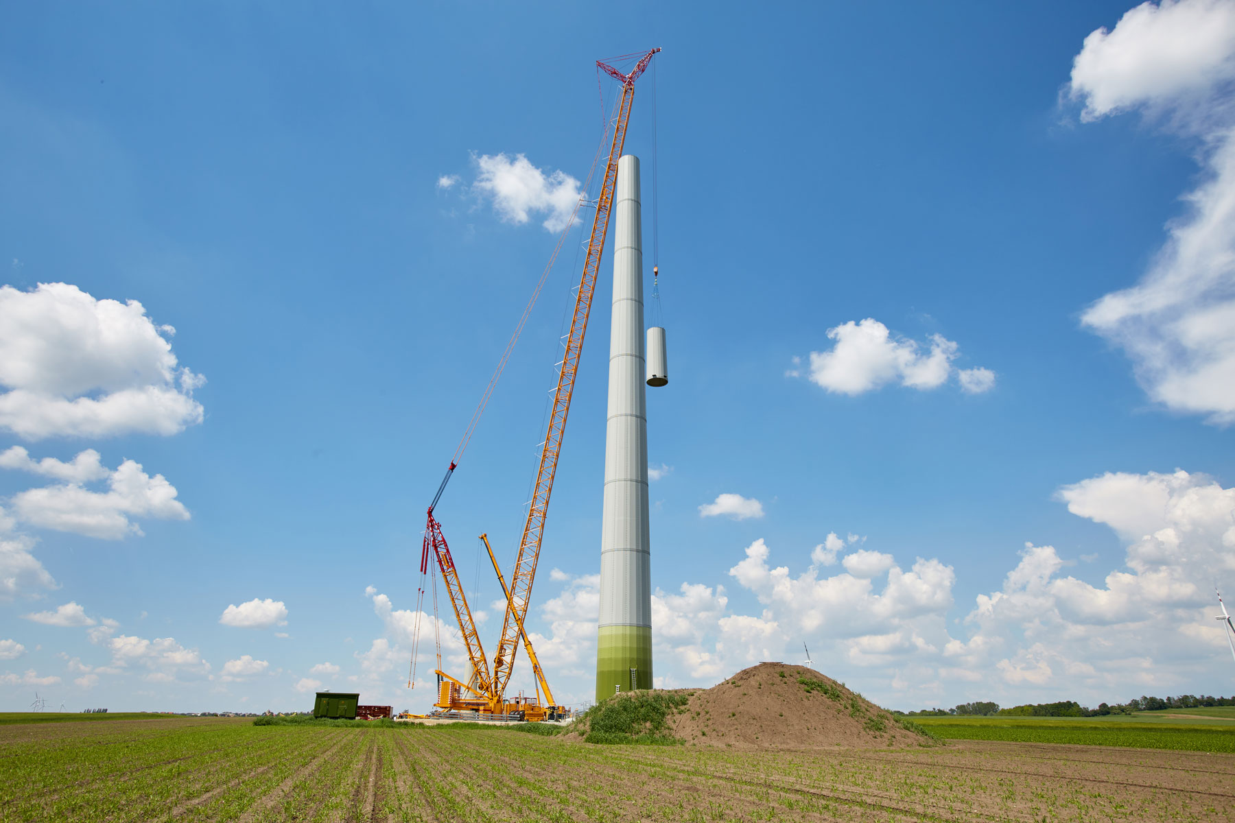 The wind energy plant was installed near to Scharndorf in Lower Austria on a modular steel tower with a hub height of 135 metres. For the main assembly process, it was necessary to use a “mobile” large crane. A 650 tonne crawler crane proved to be the right piece of equipment in the end. Due to the new system type and the required lashing gear, the main boom had to be set up higher than normal. In total, the entire crane system was 156 metres high and had a total weight of 950 tonnes.