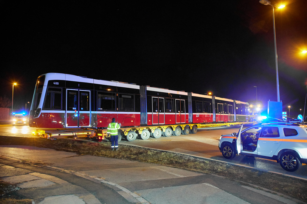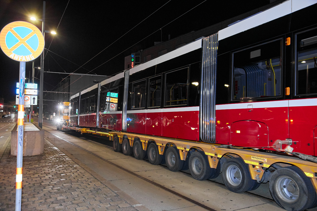 The convoy arrived on the Simmeringer Hauptstraße in Vienna at night, via the St. Marx exit. In the area of building numbers 155 and 197, the transport combination was forced to switch from the normal carriageway to the tracks, because the total weight of 99 tonnes would have overloaded the roofing of the underground railway system running beneath it. Back on the carriageway, the transporters and escort vehicles covered the last few metres of the route without incident. And the landmark tram was delivered safely to the central workshop of Wiener Linien – like every other tram before it.