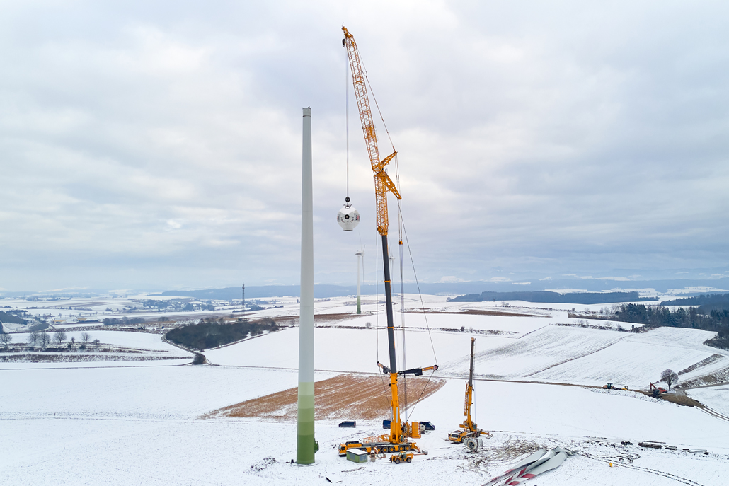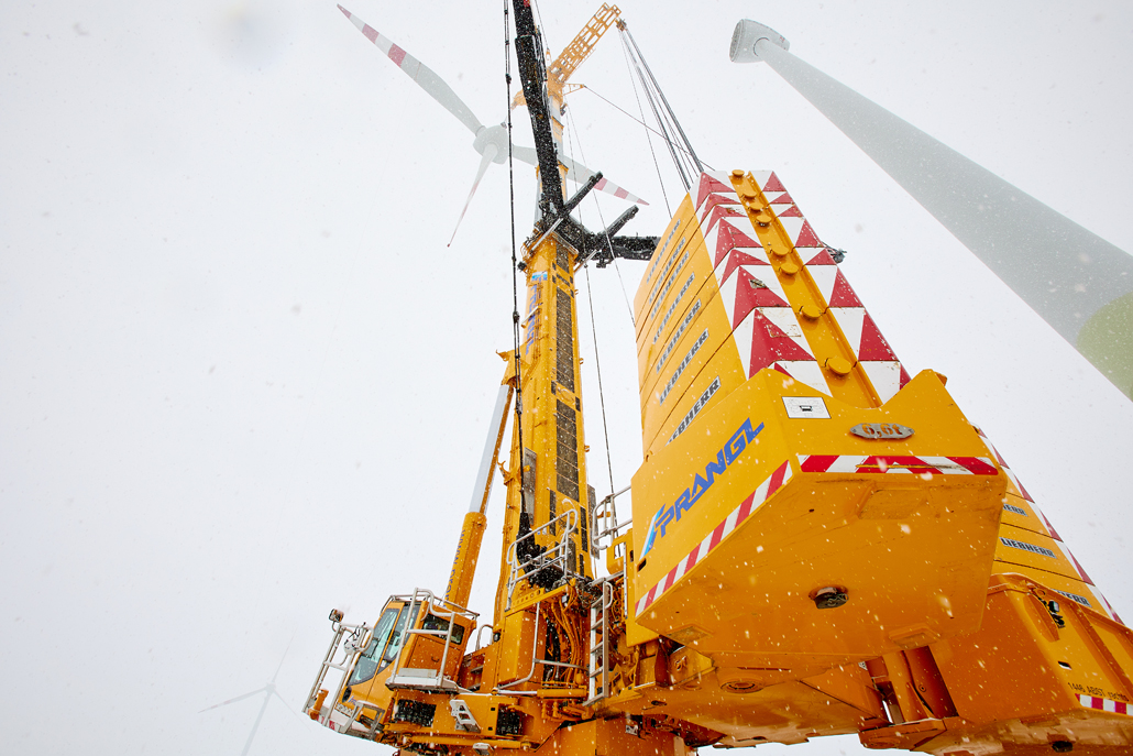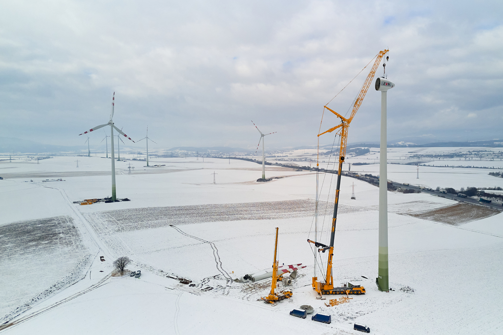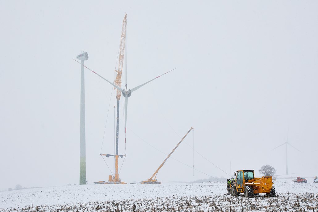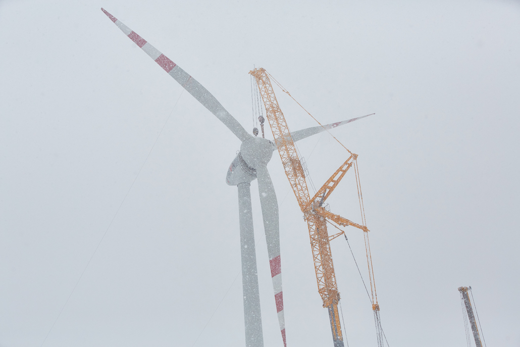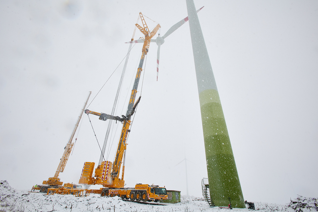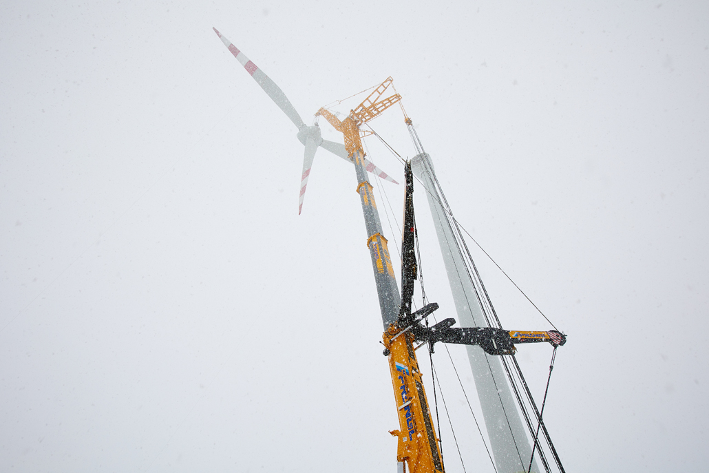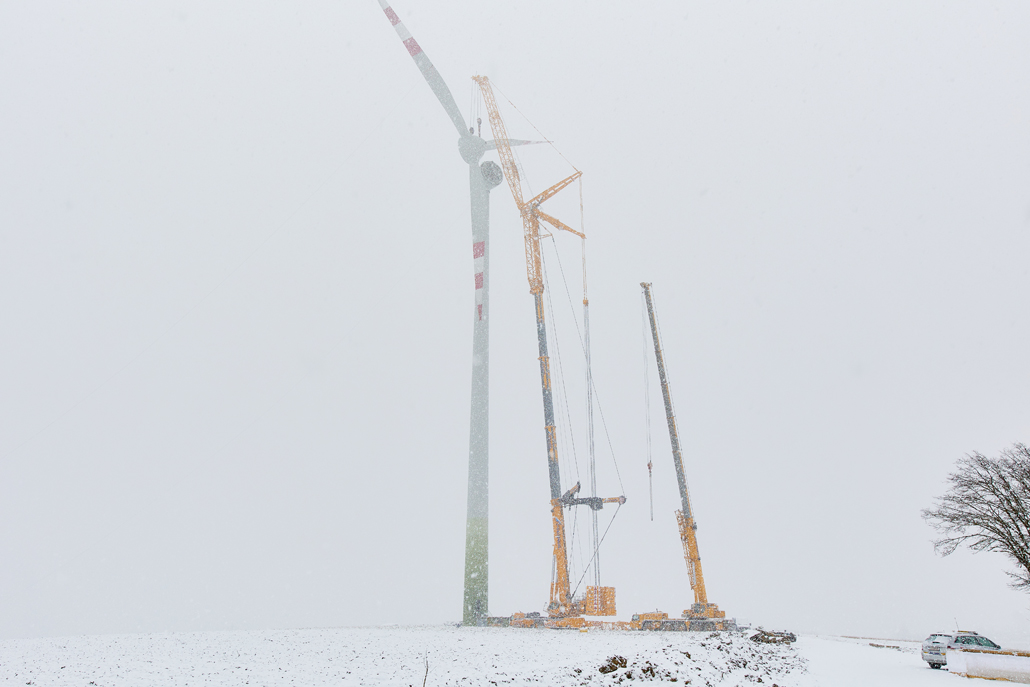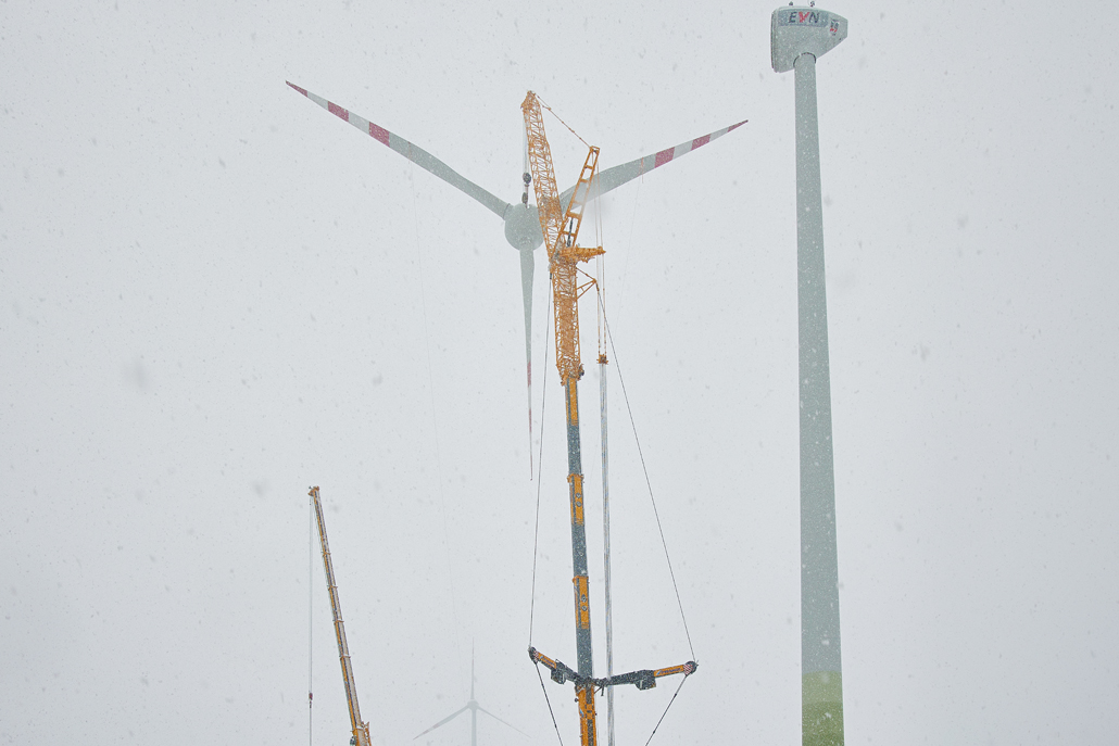 It is clear that weather conditions at this time of year are not always suitable for work of this kind. At first glance, there appeared to be sufficient space around the wind turbines. However, the solid ground required for heavy machinery was limited in terms of where the machines could be positioned. Yet the yellow team braved the lack of space, the cold and snow flurries – only strong winds could stop them from working. Completion of the wind farm is scheduled for May 2027.